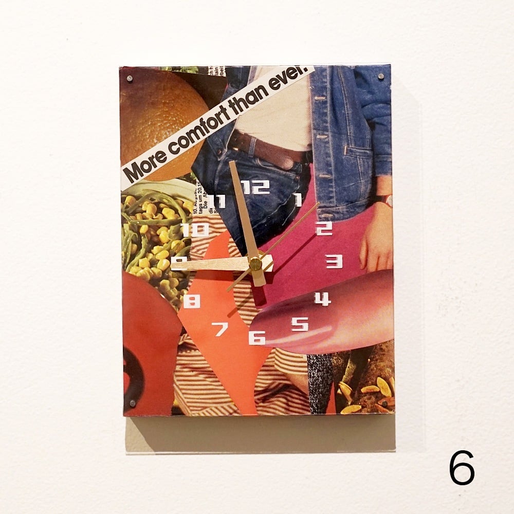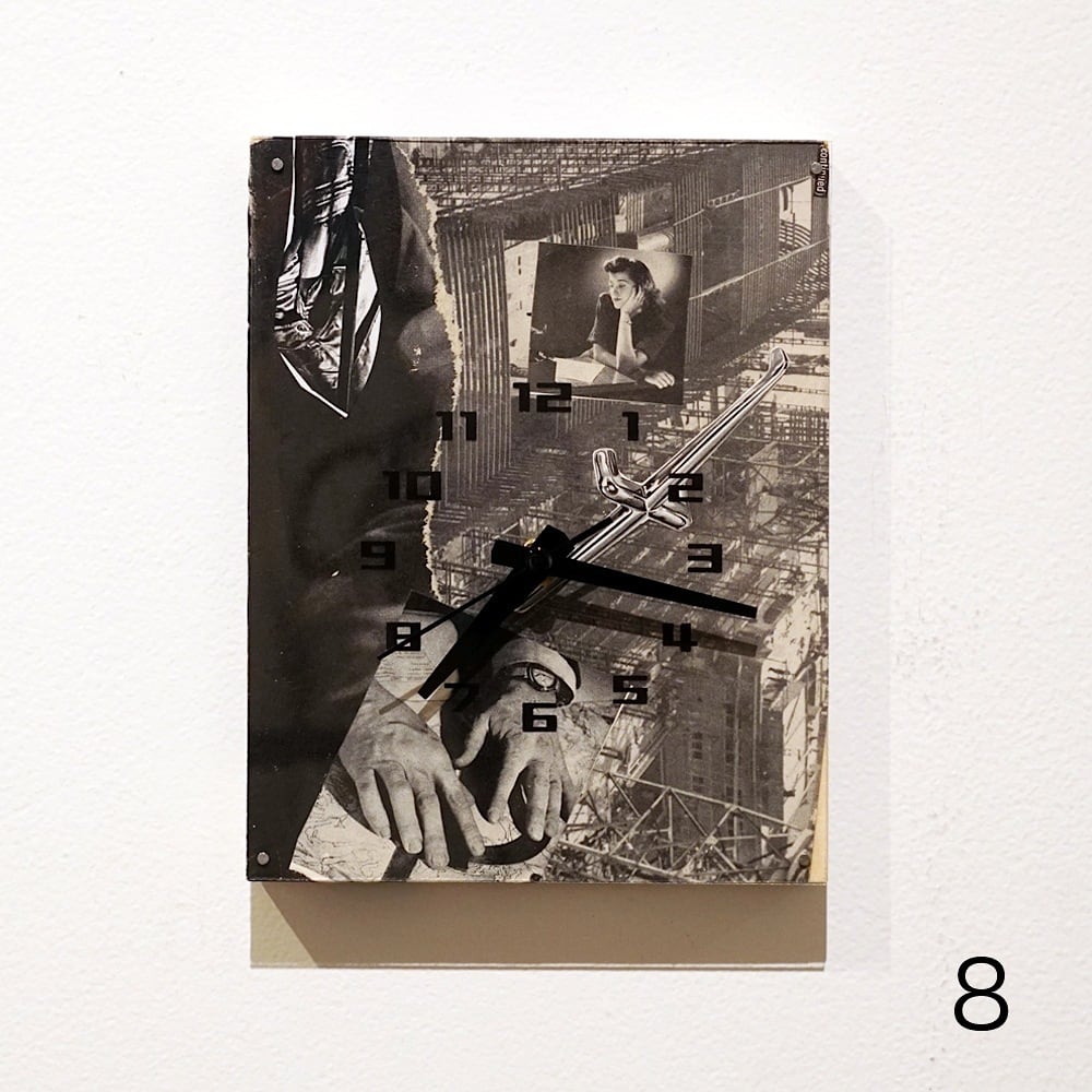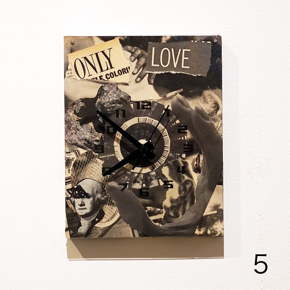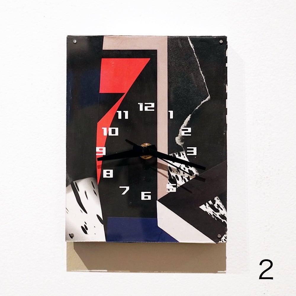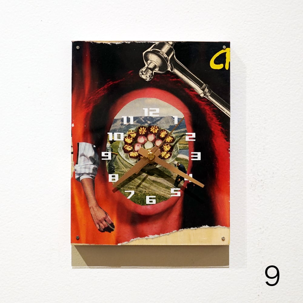 F0キャンバスのコラージュ作品を時計の文字盤をシルクスクリーンプリントしたアクリル板でマウントし、実際に壁掛け時計として使えるプロダクトにしました。気軽に飾ってもらえるアート作品です!