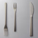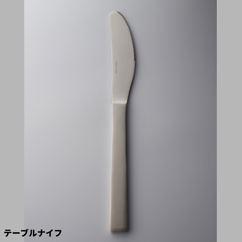 テーブルナイフ:手に持った際に感じられる程よい重みと柄の厚みが特徴のテーブルナイフ。また柄の長さについても一般的なカトラリーと比べると少し長めに作られています。ステンレスの質感は、艶が強すぎずシルキーな表情を持っており、上品な食卓を演出します。