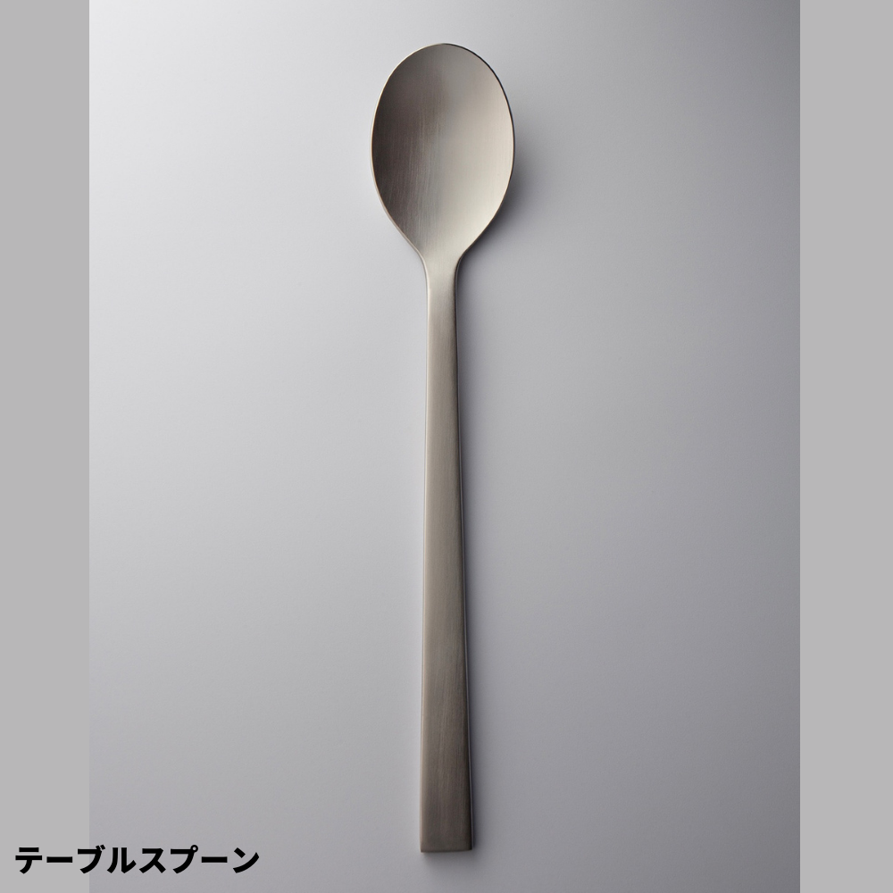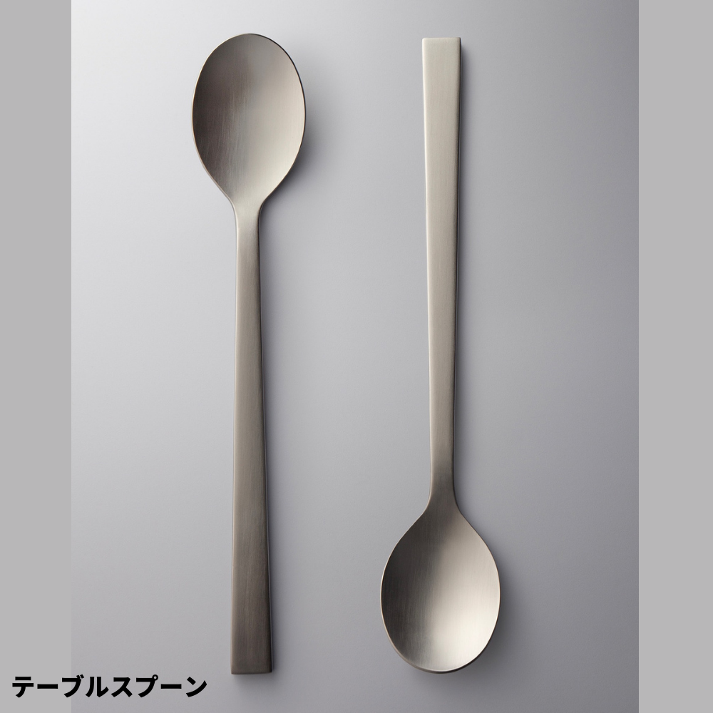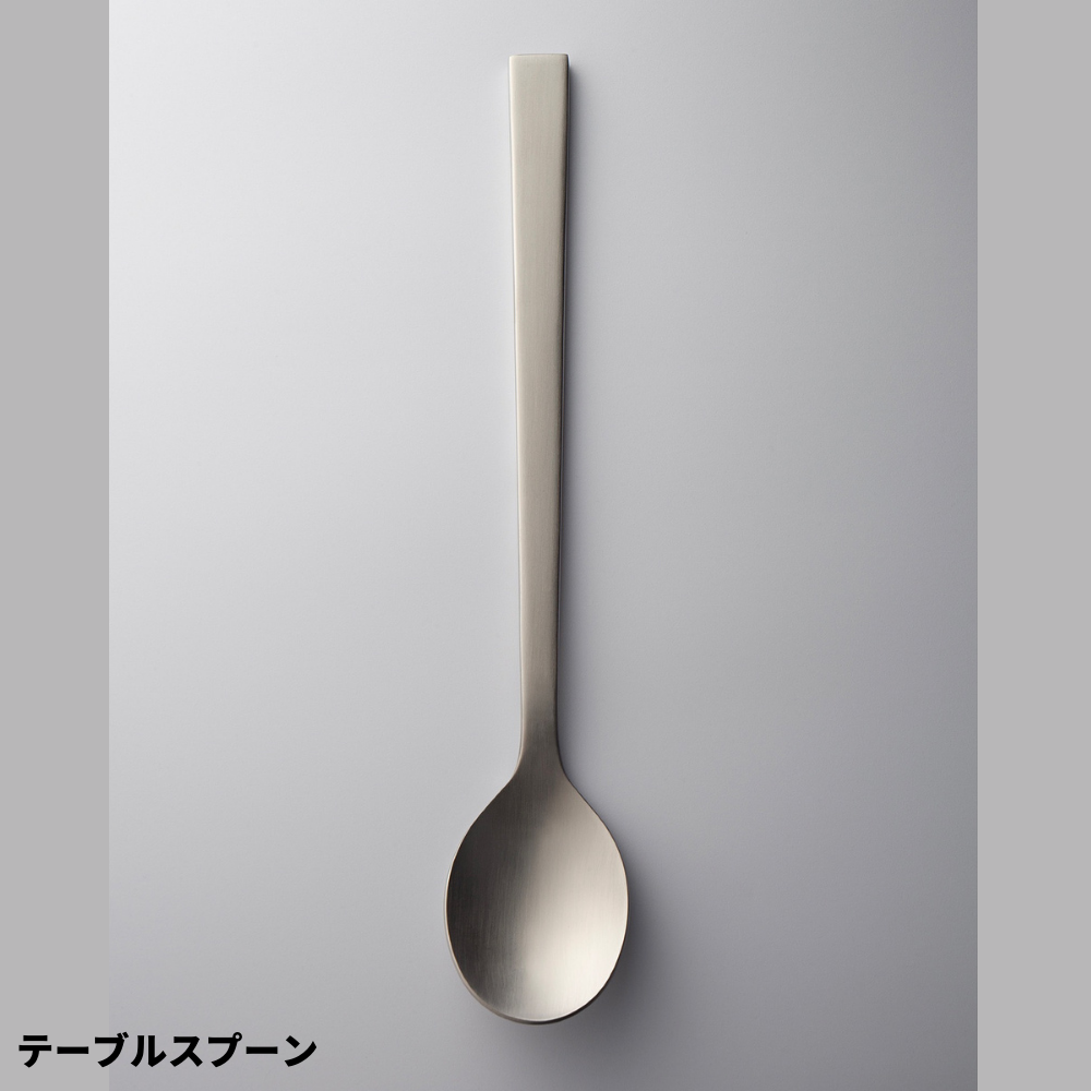 テーブルスプーン:手に持った際に感じられる程よい重みと柄の厚みが特徴のテーブルスプーン。また柄の長さについても一般的なカトラリーと比べると少し長めに作られています。ステンレスの質感は、艶が強すぎずシルキーな表情を持っており、上品な食卓を演出します。