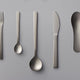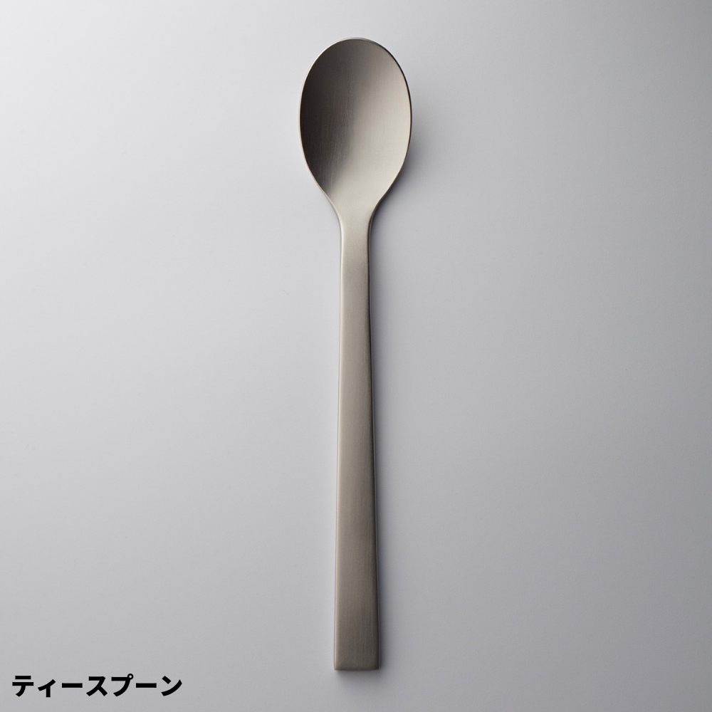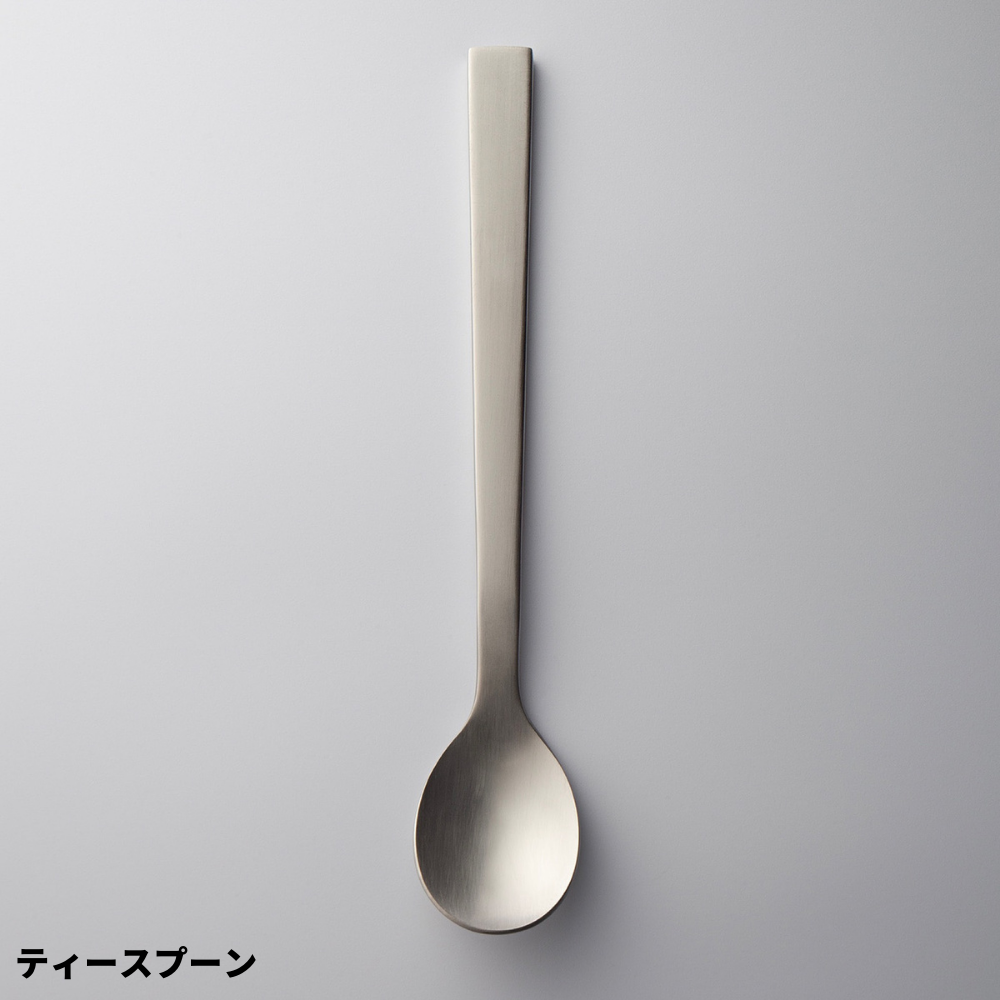ティースプーン:手に持った際に感じられる程よい重みと柄の厚みが特徴のティースプーン。また柄の長さについても一般的なカトラリーと比べると少し長めに作られています。ステンレスの質感は、艶が強すぎずシルキーな表情を持っており、上品な食卓を演出します。