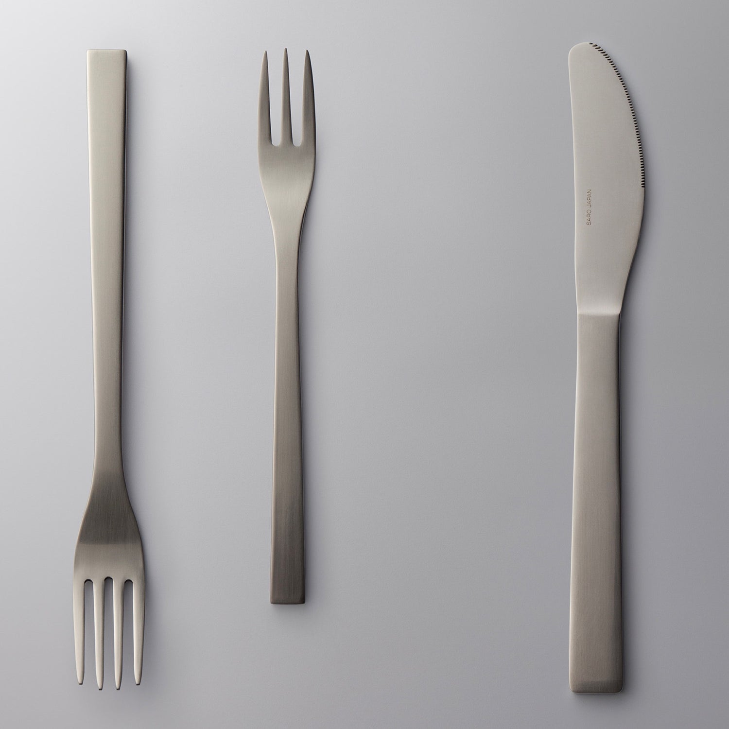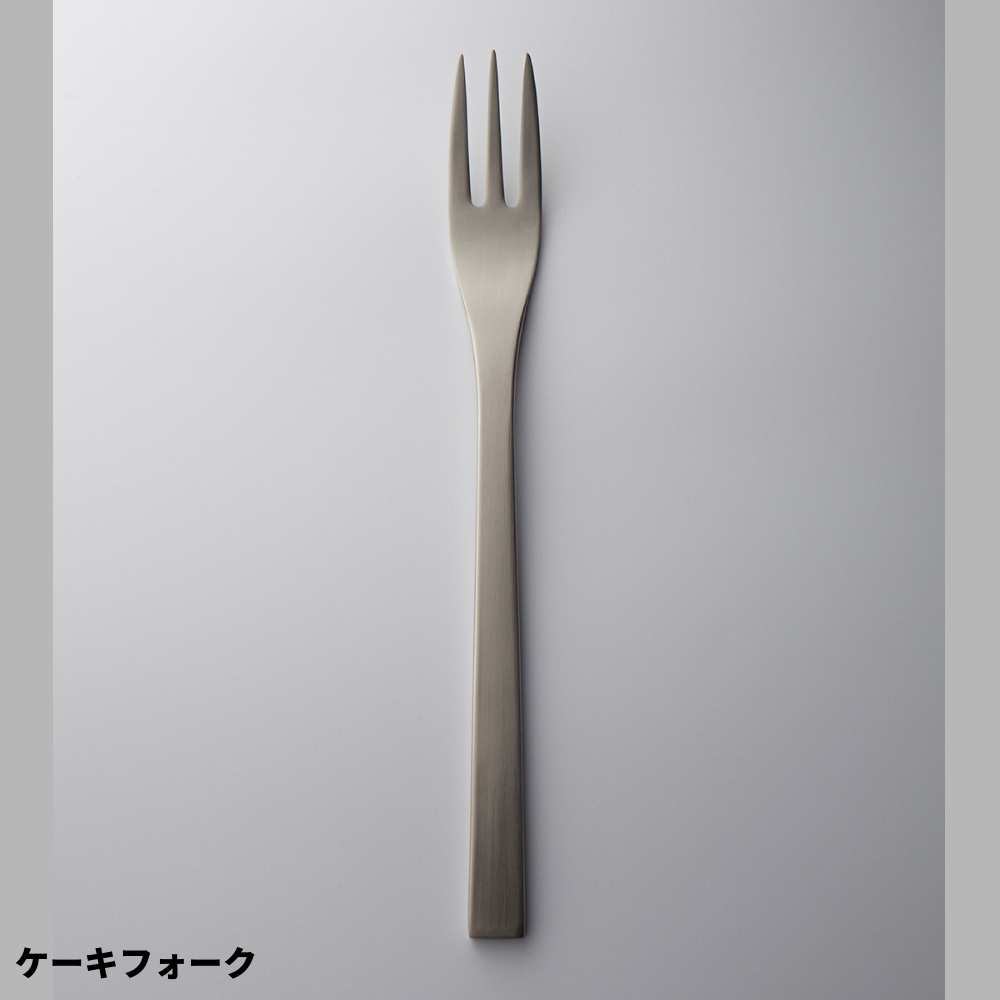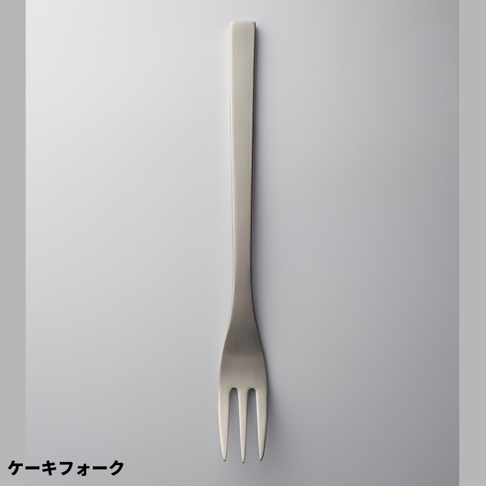 ケーキフォーク:手に持った際に感じられる程よい重みと柄の厚みが特徴のケーキフォーク。また柄の長さについても一般的なカトラリーと比べると少し長めに作られています。ステンレスの質感は、艶が強すぎずシルキーな表情を持っており、上品な食卓を演出します。