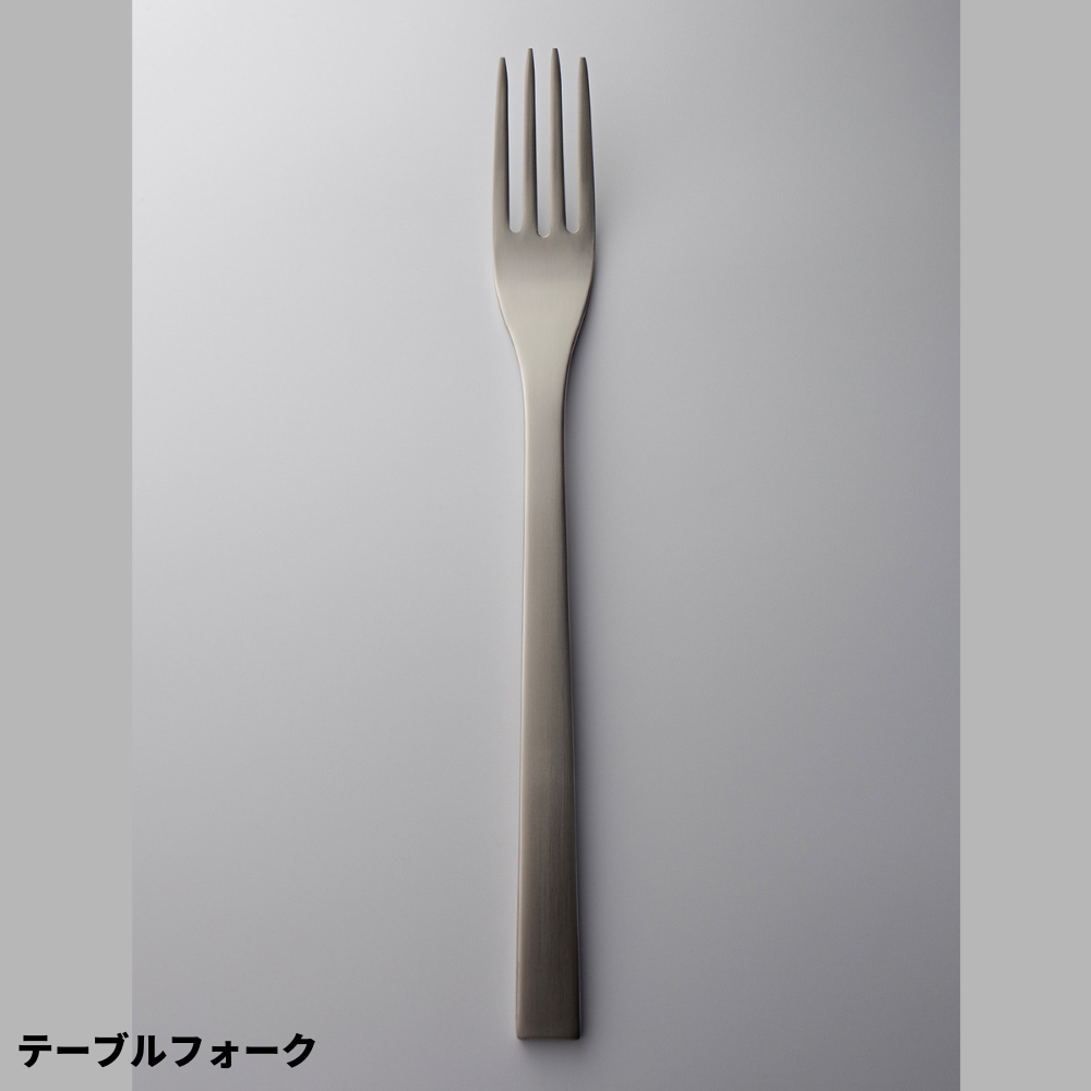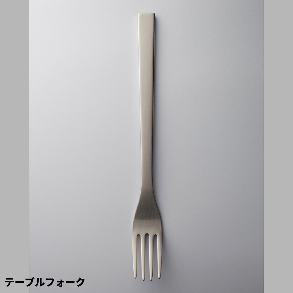 テーブルフォーク:手に持った際に感じられる程よい重みと柄の厚みが特徴のテーブルフォーク。また柄の長さについても一般的なカトラリーと比べると少し長めに作られています。ステンレスの質感は、艶が強すぎずシルキーな表情を持っており、上品な食卓を演出します。