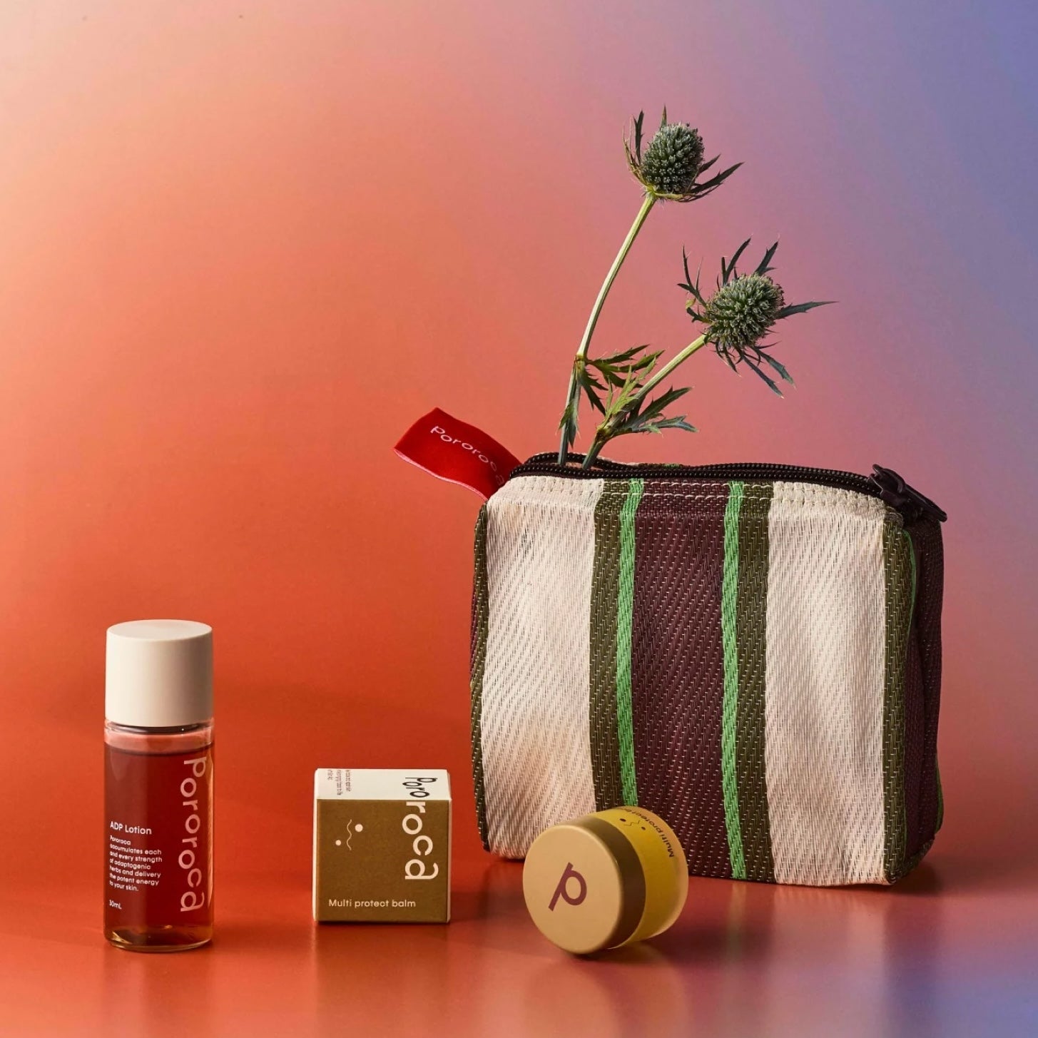 肌を潤わせ、ハリを与える植物幹細胞エキスをキー成分としたADPローション(化粧水)のミニサイズ(30mL)とマルチプロテクトバーム(10g)をセットとして発売。インド産の生地を使ったオリジナルのポーチもついた特別なスキンケアキットです。プレゼントや旅行やお出かけ時の持ち運びにも。初めてPororocaの商品をお使いになる方にもおすすめです。