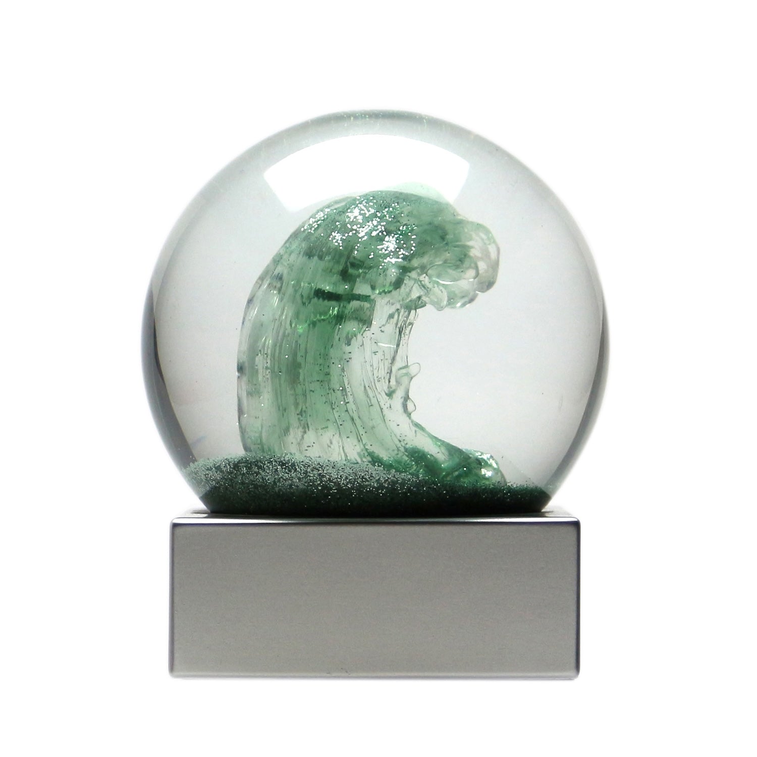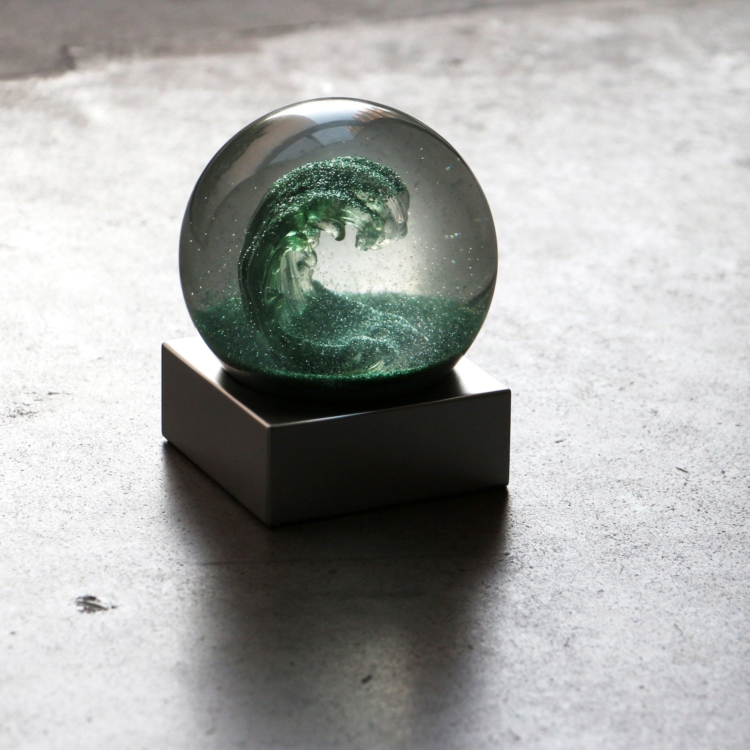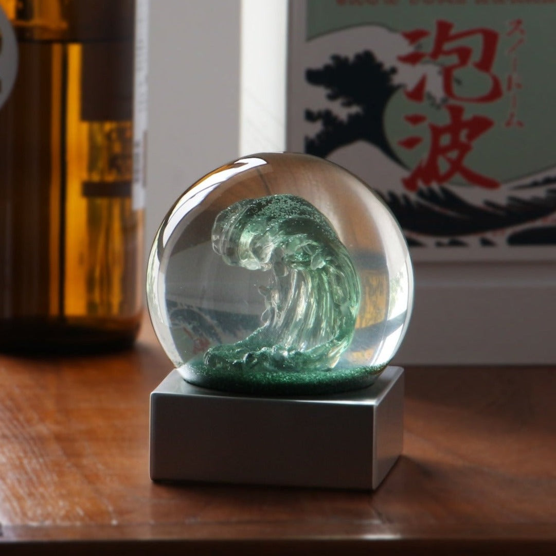荒々しい波を10cmの球体のスノードームで表現しました。細かなラメパウダーが球体の中で舞う幻想的な様子はつい見入ってしまいます。