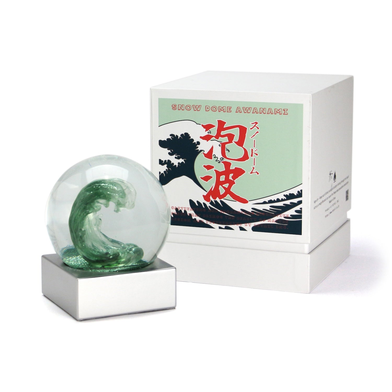 北斎の浮世絵に出てくるような荒波の一瞬を切り取ったスノードーム。スノーだけど、振って波がキラキラした瞬間はサーフムービーで見たようなビッグウェーブの魅力を彷彿とさせてくれる。土台の高級感と箱も飾りたくなるほどに可愛いのが嬉しい。