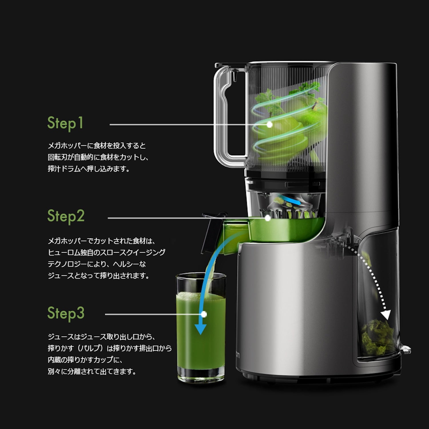 スクリューと2種の樹脂製フィルターで食材を搾汁する「分離搾汁方式」を採用。ゆっくりと回転するスクリューは、最小限の摩擦熱で酸化を抑えながら搾汁し、野菜や果物の栄養素をしっかり抽出。味、色、栄養素を生きた野菜のまま保ちます。
