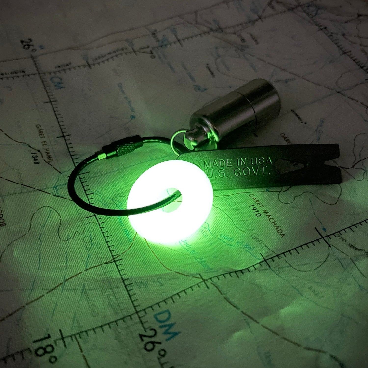 太陽光、スマートフォンのライト等様々な光源から蓄光することができるリングパーツ5個セット。キーリングやジップに付けることで暗い状況でも素早く認識することができます。アメリカの政府機関と取引を行うために必要な"CAGE CODE"を取得したアメリカ企業が製作しており、クオリティ、スペックは申し分ありません。このリングパーツはSAR(捜索救助部隊)からの装備やジッパーに付けられるパーツが欲しいという要望により開発されました。一般的に流通している蓄光材と比べると驚くほど明るく、長くても12時間程度の発光時間が多い中、最大24時間発光し続けることができます(発光時間は光源の強さや蓄光時間により異なります)。アウトドアギアの目印、キーリング、USBドライブ、鞄のジップなど日常生活の様々なシーンで活躍してくれます。