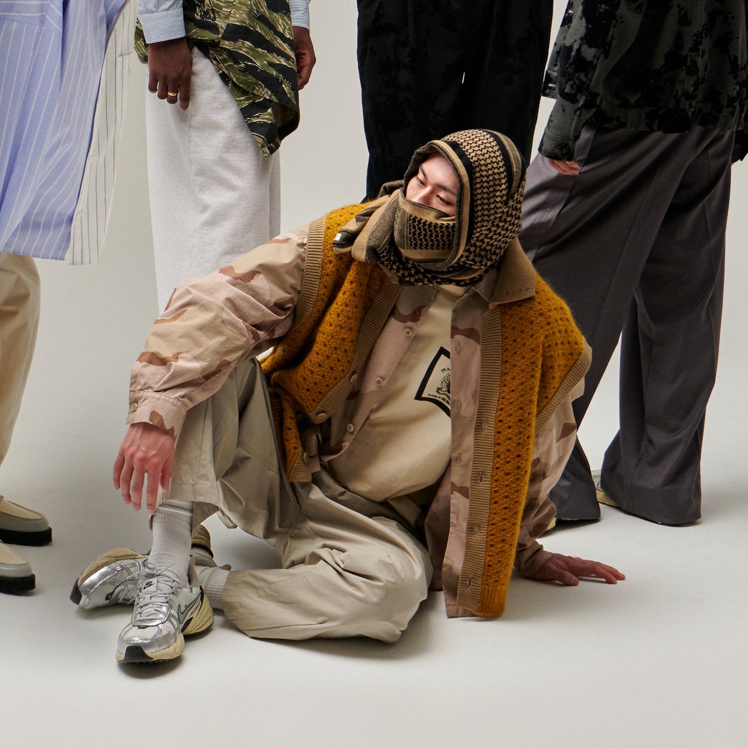 日本のファッションでも多く使用されるShemaghをカシミア混コットンウールを贅沢に使用し制作。Shemaghとはアフガンストールとも呼ばれ中近東の人々がマフラーやターバンとして使用する大判のマフラー。中東の人々はもとより米兵なども顔に巻いているのをみることも多い。日本ではファッションの一部としてヒップホップのファッションなどでも多く取り入れられるアイテム。このシュマグをアップグレードさせるべく高級素材を使用しウィンターシーズン用の大判ストールをオリジナルで編んだMAGIC STICKのニッティングシリーズ。