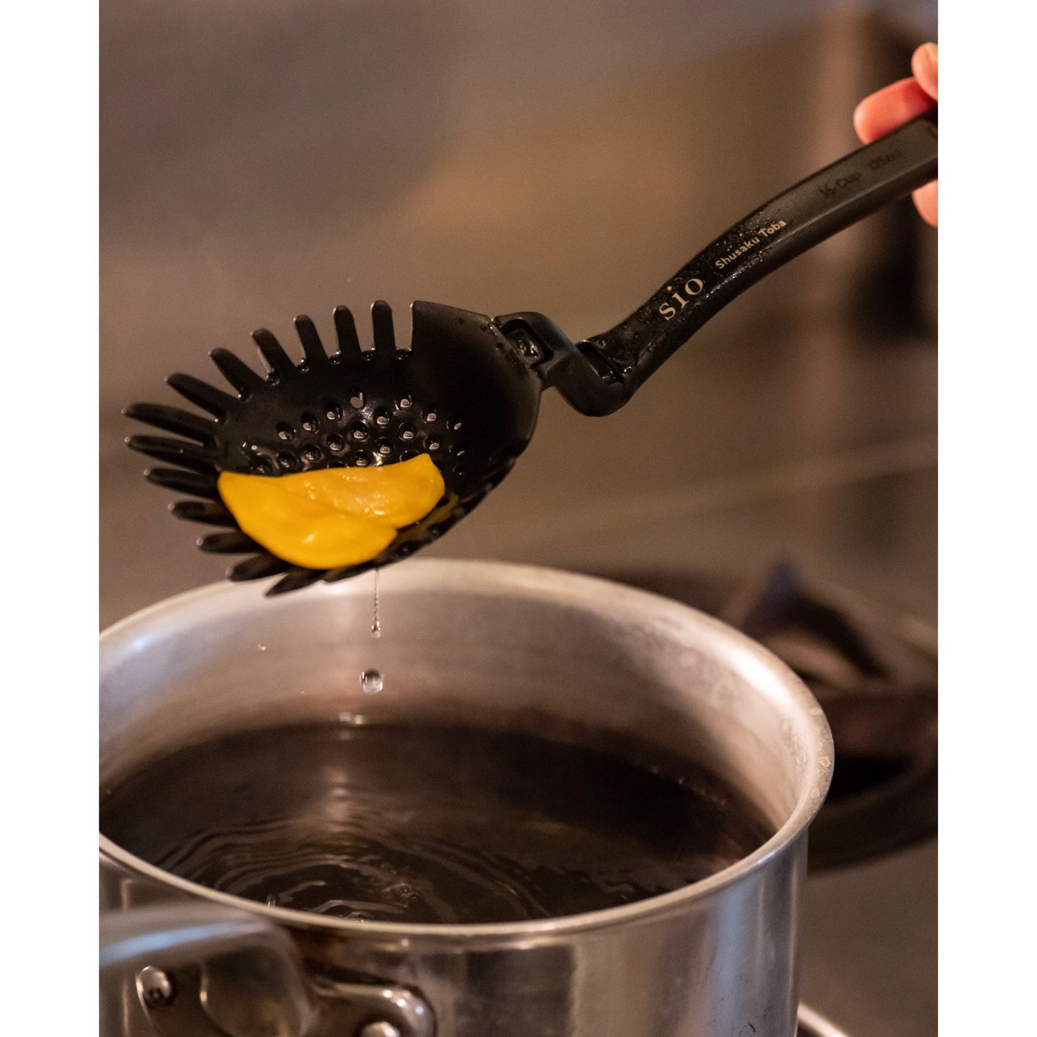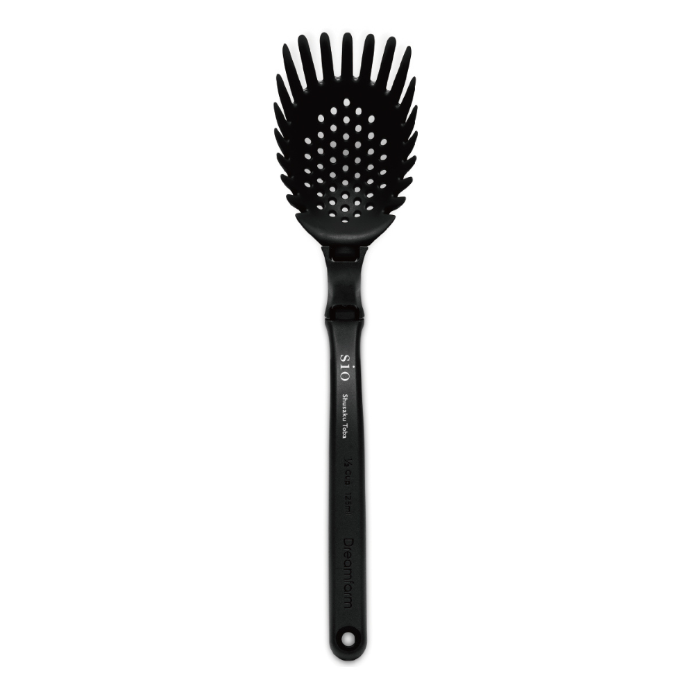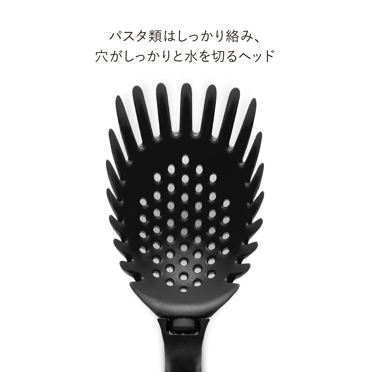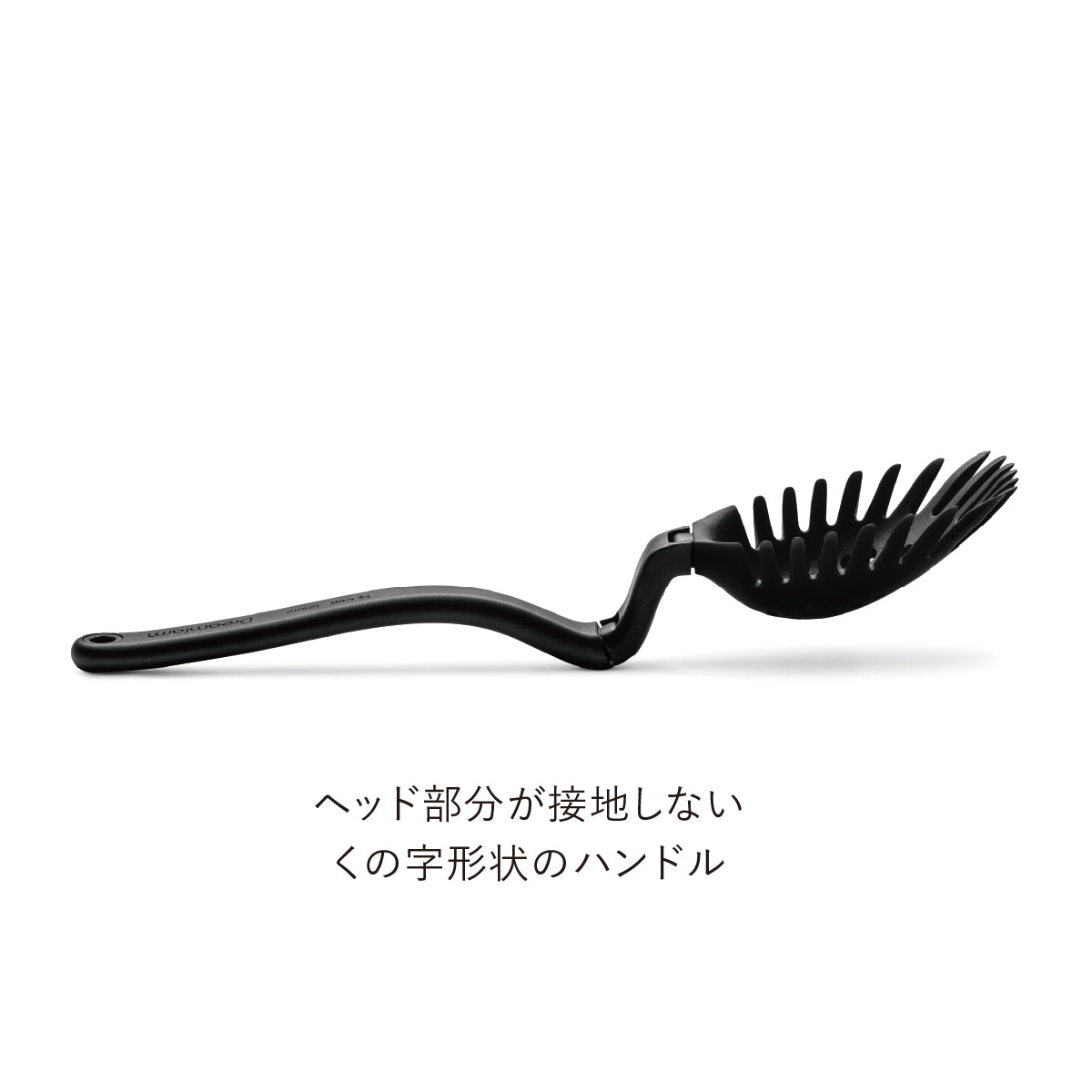 一つでパスタレードルや水切りのスプーンになっちゃう優れもの。ハンドルを回すのとヘッドが接地しない形状になるので、パスタを取り分けた後にお皿やテーブルが汚れないのも便利です。ミートソースのパスタを作るのにオススメです!