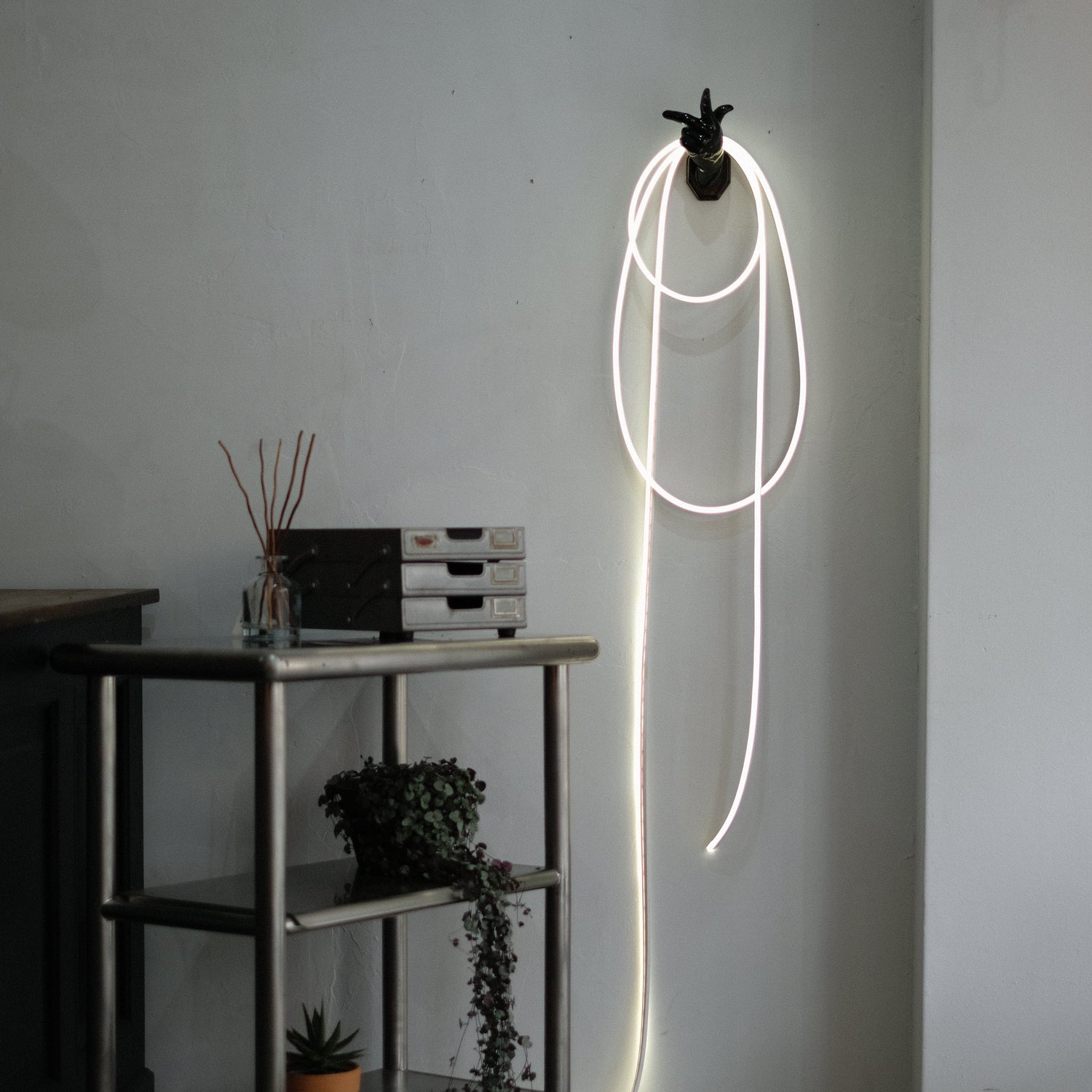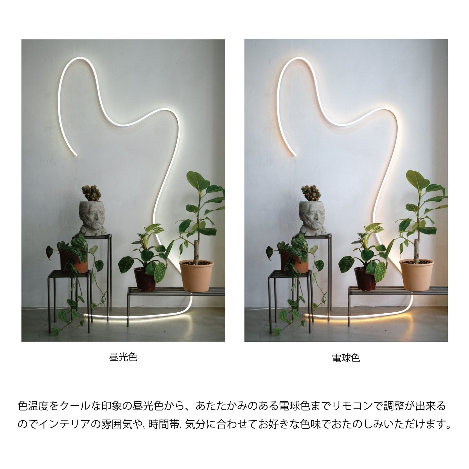 くねくねくるくると自由に曲げてネオンサインのようにおたのしみいただけます。発熱が少なく、壁面にも安心して飾ることが出来るので、インテリアの装飾や店舗ディスプレイなど幅広く活躍します。点灯のON/OFF、明るさと色温度の調整は付属のリモコン一つで操作することが出来ます。