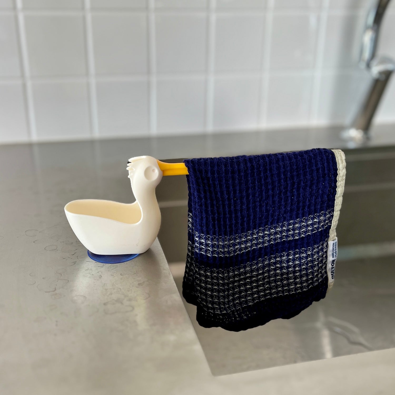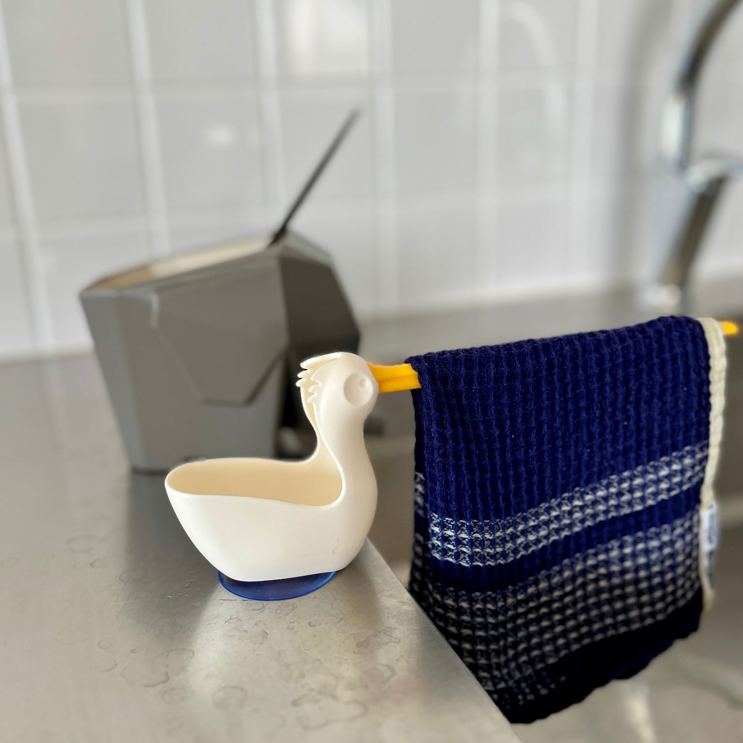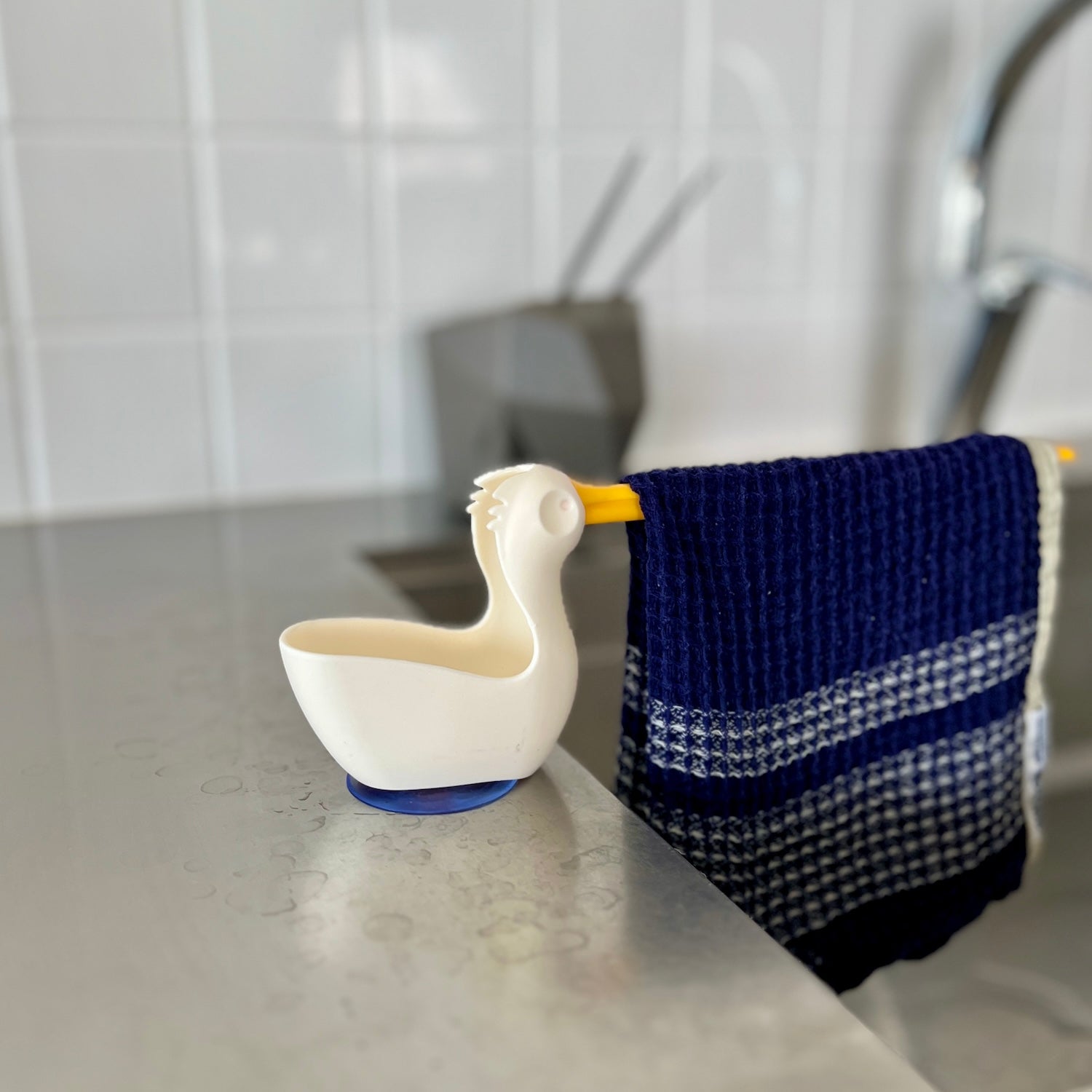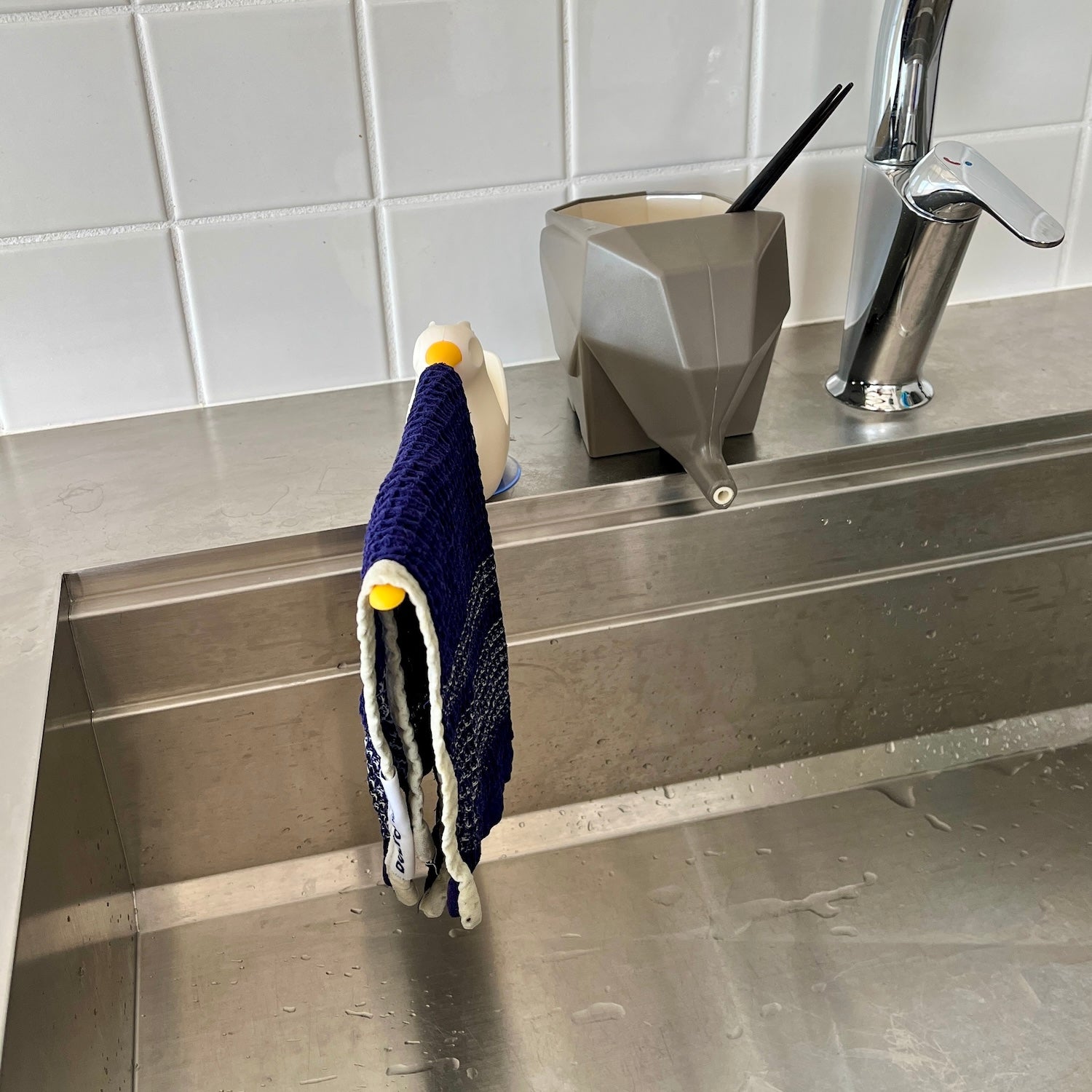 キッチンにペリカンちゃんが一羽仲間入りです。早速この子が、台拭きの乾かす場所問題を解決してくれました。これまではシンクに掛けてたんだけど、どうしても衛生面が気になって…。あとはもう、ただただ見た目が可愛い。象の水切りスタンドと並べて置いてますが、シンクまわりが一気に楽しい景色に。吸盤部分は回転できるので、洗い物のときに邪魔になりません。背中にはスポンジを収納できるスペースもあるけれど、水が流れない構造だから僕はそこは使ってません。ここには何を入れると気持ちよく収まるのか、まだ模索中。実用性はもちろん、そのユーモアある存在感に、思わず笑顔になってしまいます。(※吸盤は設置する素材により吸着力が弱くなる場合があります。)