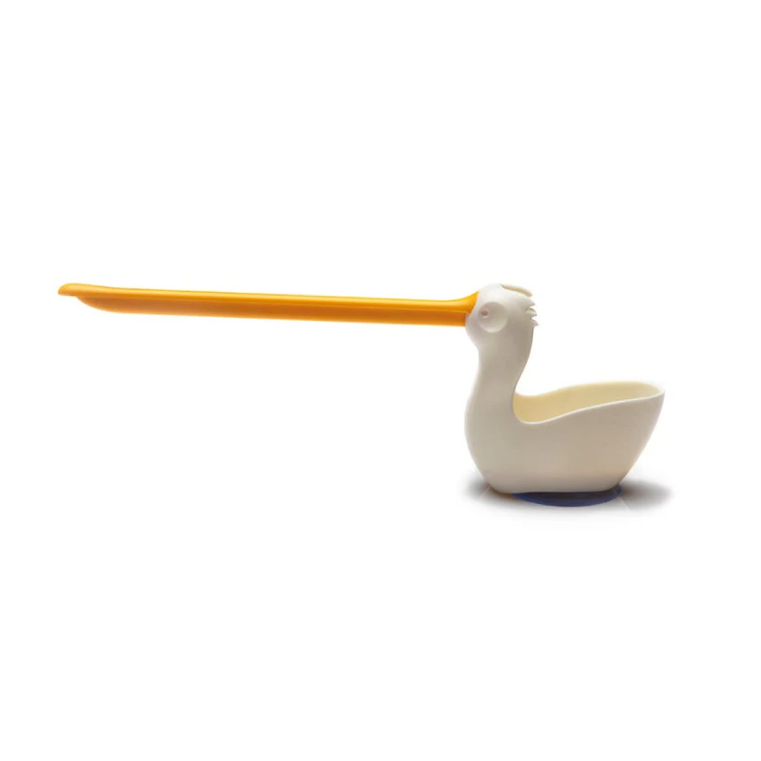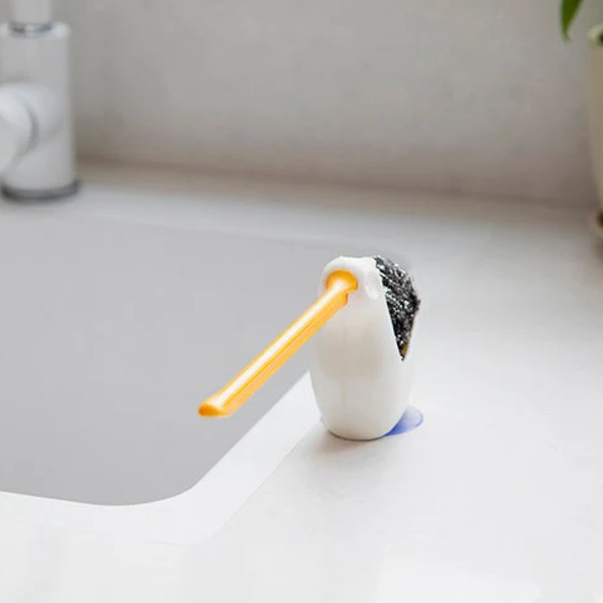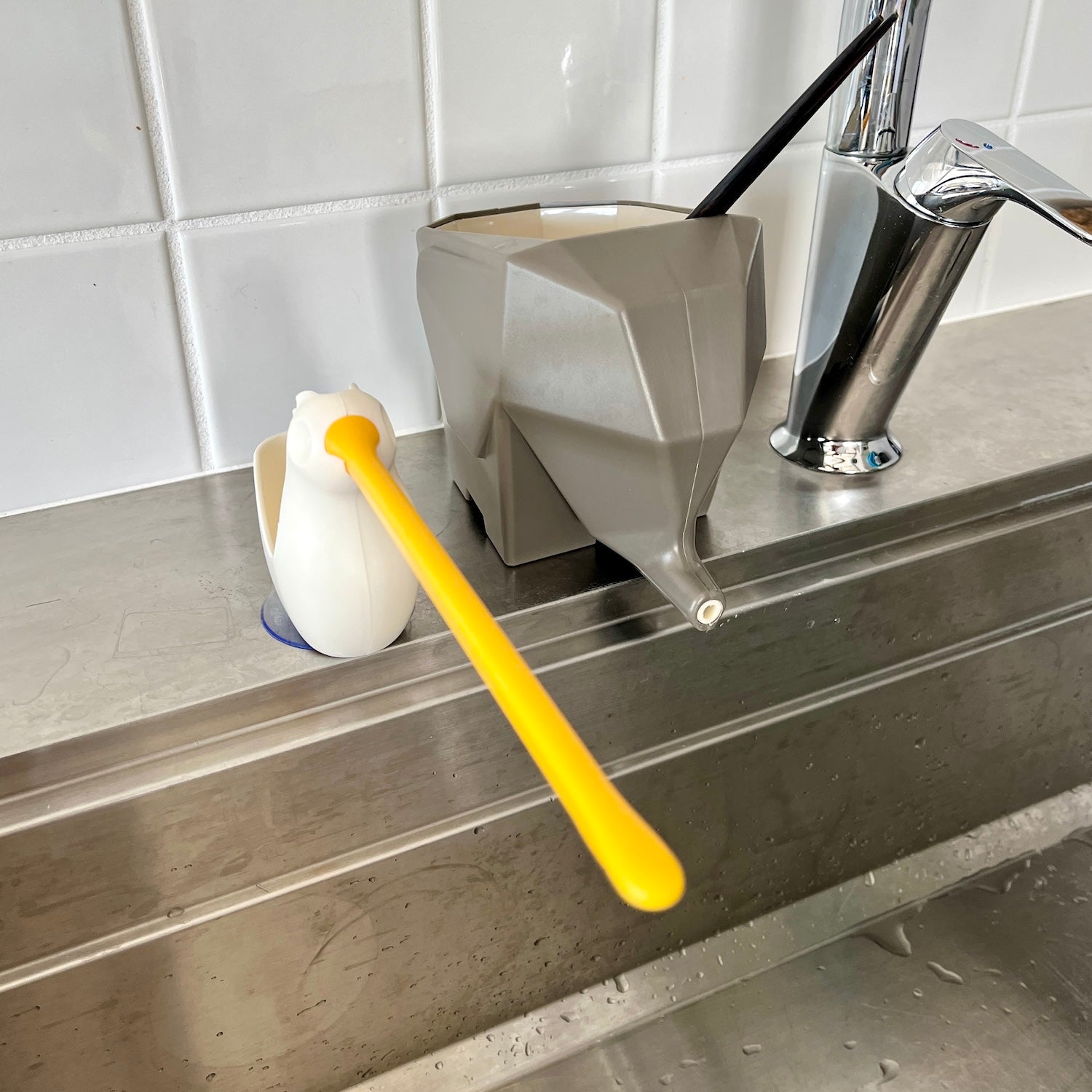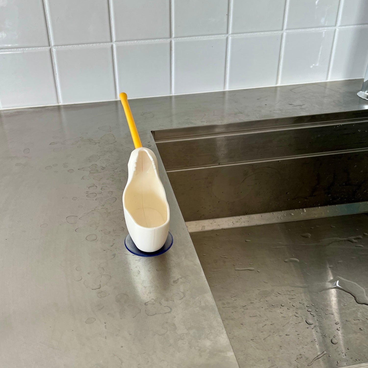 キッチンにペリカンちゃんが一羽仲間入りです。早速この子が、台拭きの乾かす場所問題を解決してくれました。これまではシンクに掛けてたんだけど、どうしても衛生面が気になって…。あとはもう、ただただ見た目が可愛い。象の水切りスタンドと並べて置いてますが、シンクまわりが一気に楽しい景色に。吸盤部分は回転できるので、洗い物のときに邪魔になりません。背中にはスポンジを収納できるスペースもあるけれど、水が流れない構造だから僕はそこは使ってません。ここには何を入れると気持ちよく収まるのか、まだ模索中。実用性はもちろん、そのユーモアある存在感に、思わず笑顔になってしまいます。(※吸盤は設置する素材により吸着力が弱くなる場合があります。)