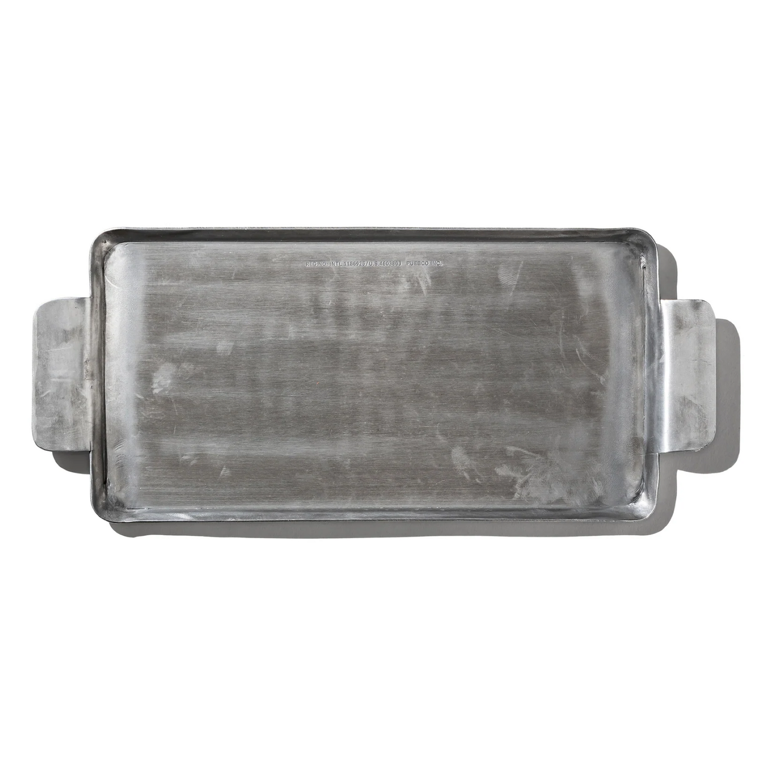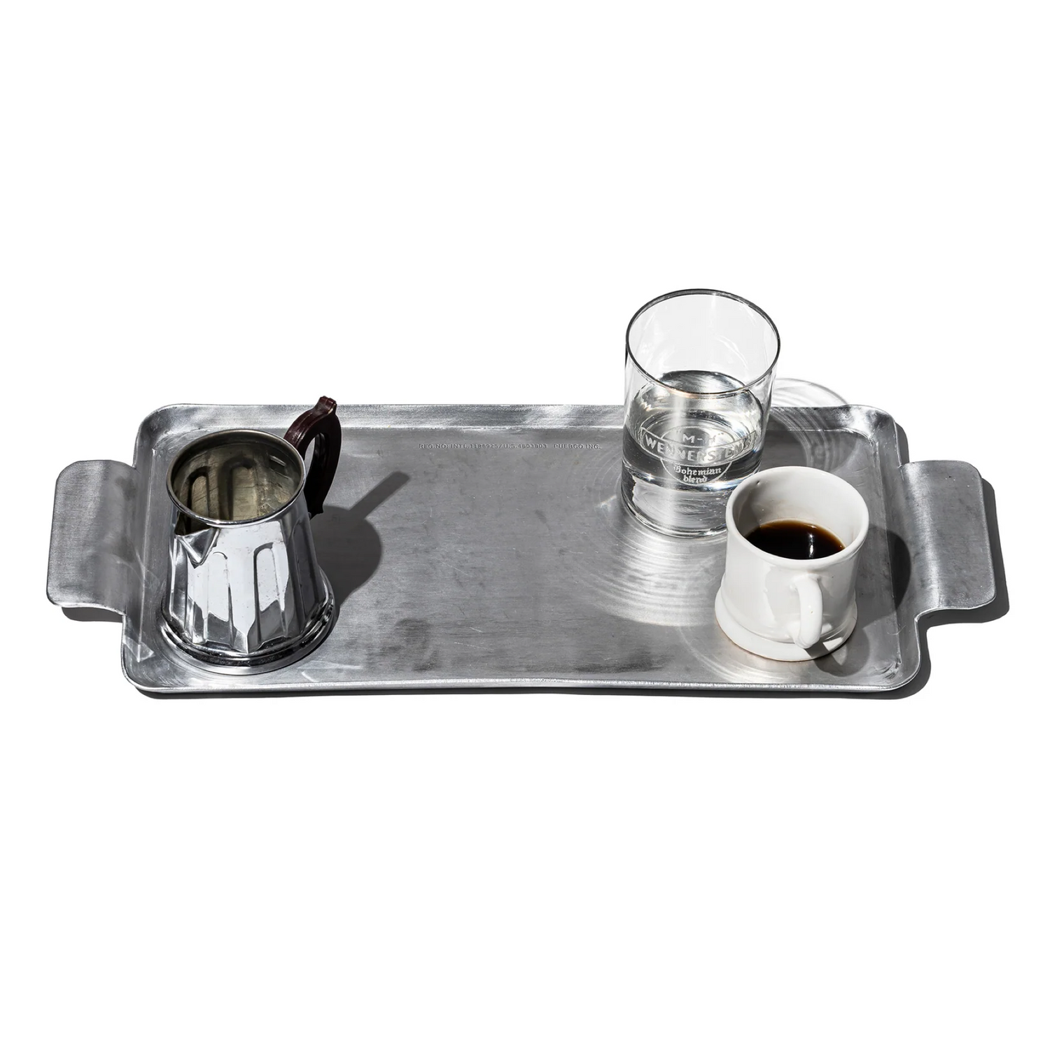 長方形、絶妙のサイズ感、取って部分のフォルム、アルミの無骨な素材感。工業用のパーツみたいな雰囲気。食卓に出すととにかく洒落て見える。素材の性質上の最初からついている傷や変色がめちゃめちゃいい仕事をしてくれてる。朝はコーヒーとトーストを並べて、夜はグラスを並べて晩酌。特別なことをしてるわけじゃないのに、このトレーにのせるだけでちょっといい時間に変わる気がする。(※ご購入前に必ずアイテム説明欄をご確認ください。この風合いも含めてブランドの魅力なので、ご理解いただけない方はご遠慮ください。)