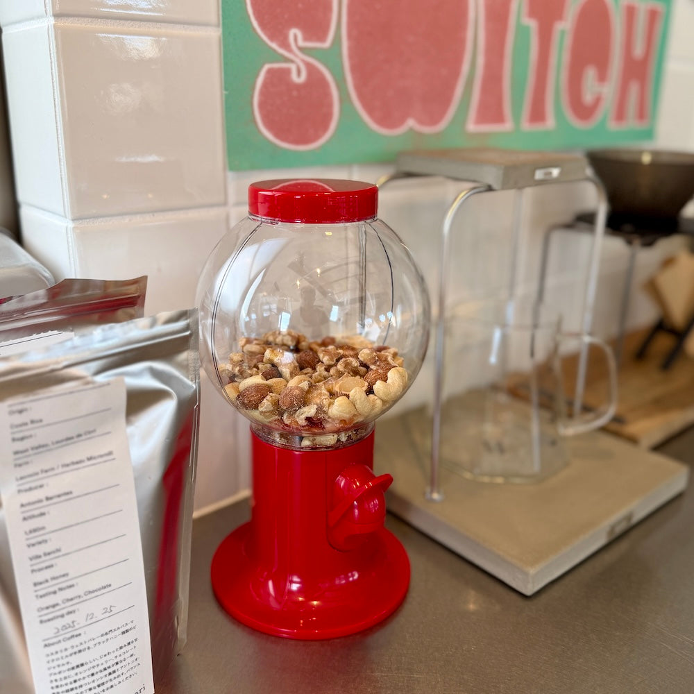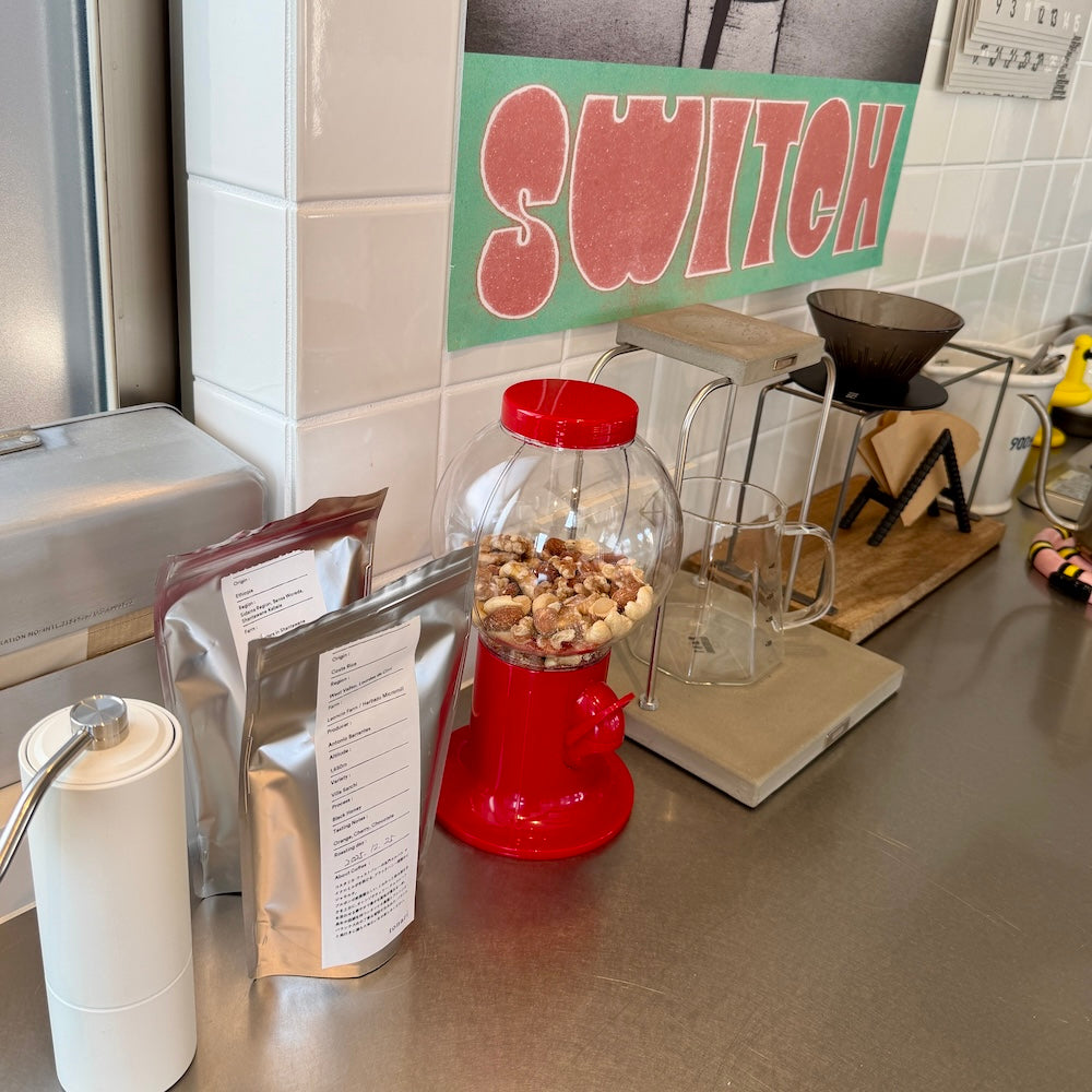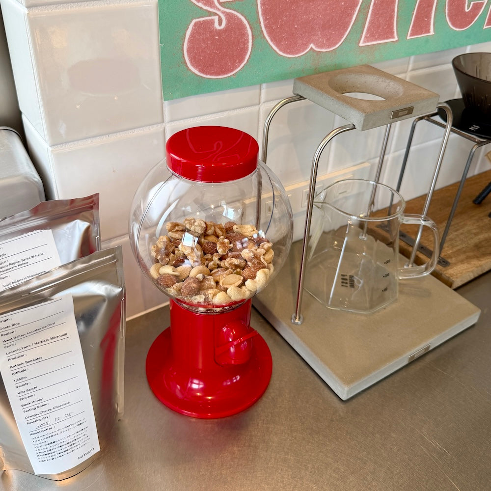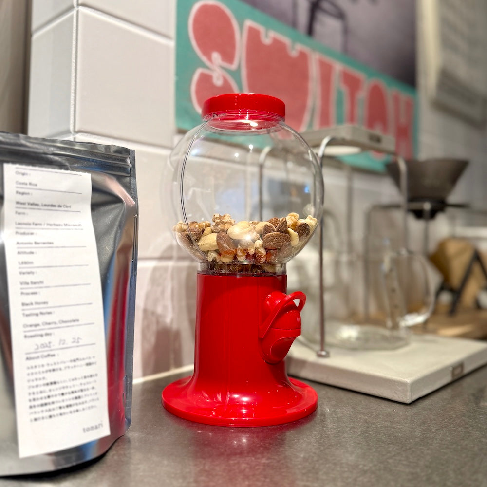 お安いですが実物は安っぽくなく、キッチンに並べると画像の通りめちゃいい感じ。近所の駄菓子屋で、100円握って何買おうか迷ってた、そんな記憶をふっと思い出させてくれたスナックディスペンサー。チョコ、ガム、飴、柿ピー、キーホルダー、フィギュア、何を入れましょう?僕は、無塩のアーモンドを入れてます。毎食脂質を摂るため、サラダに5粒って決めてるやつ。HATCHユーザーならきっとイケてる使い方をするのでしょう。もうすぐバレンタインなので、これにチョコや柿ピー入れてプレゼントするってのもありなのでは?