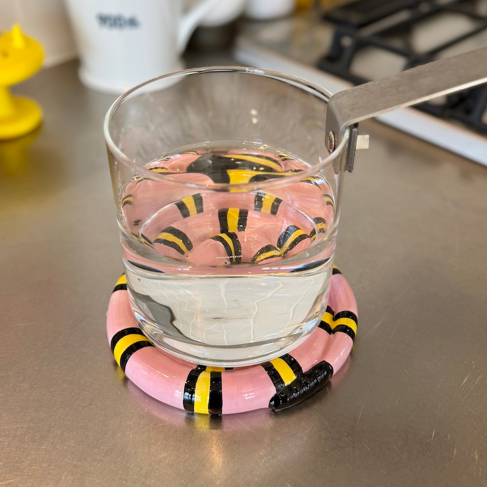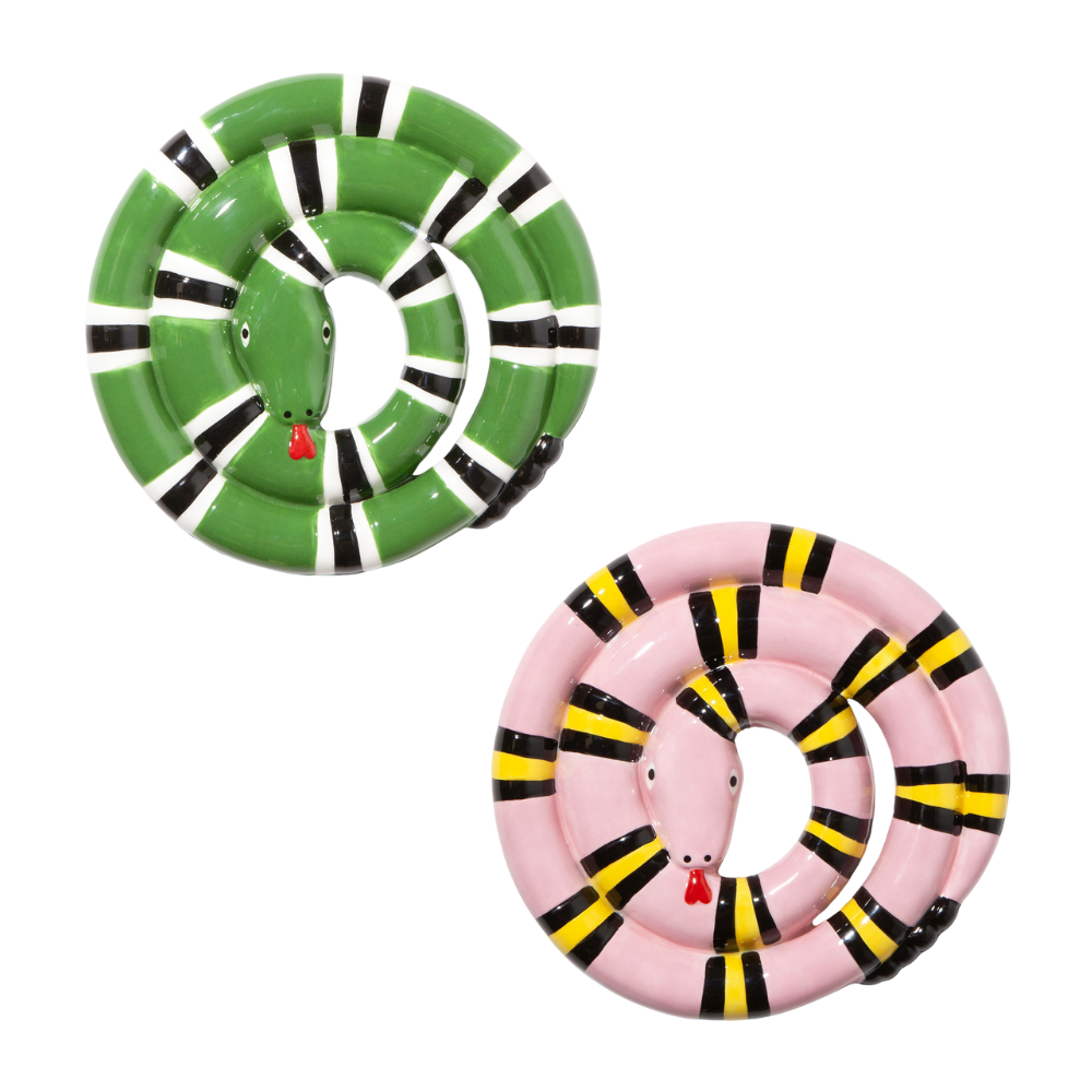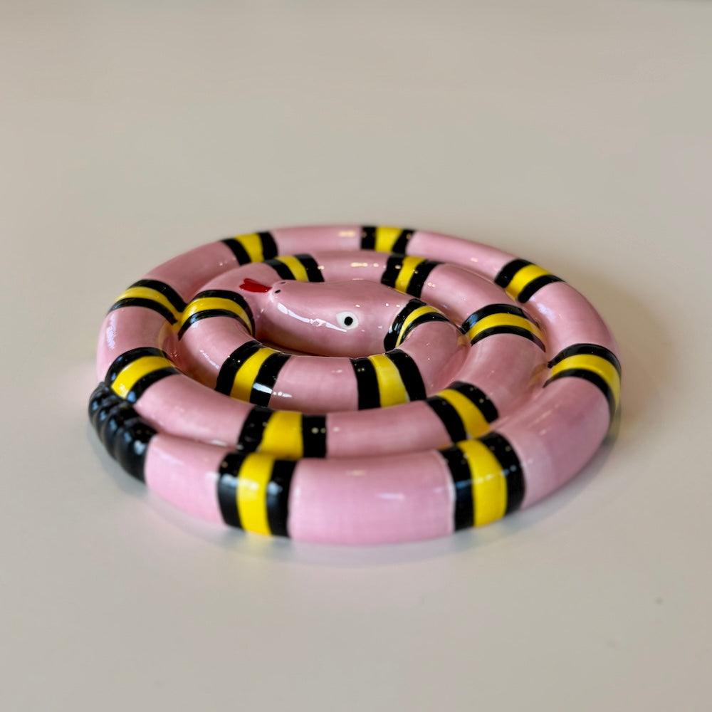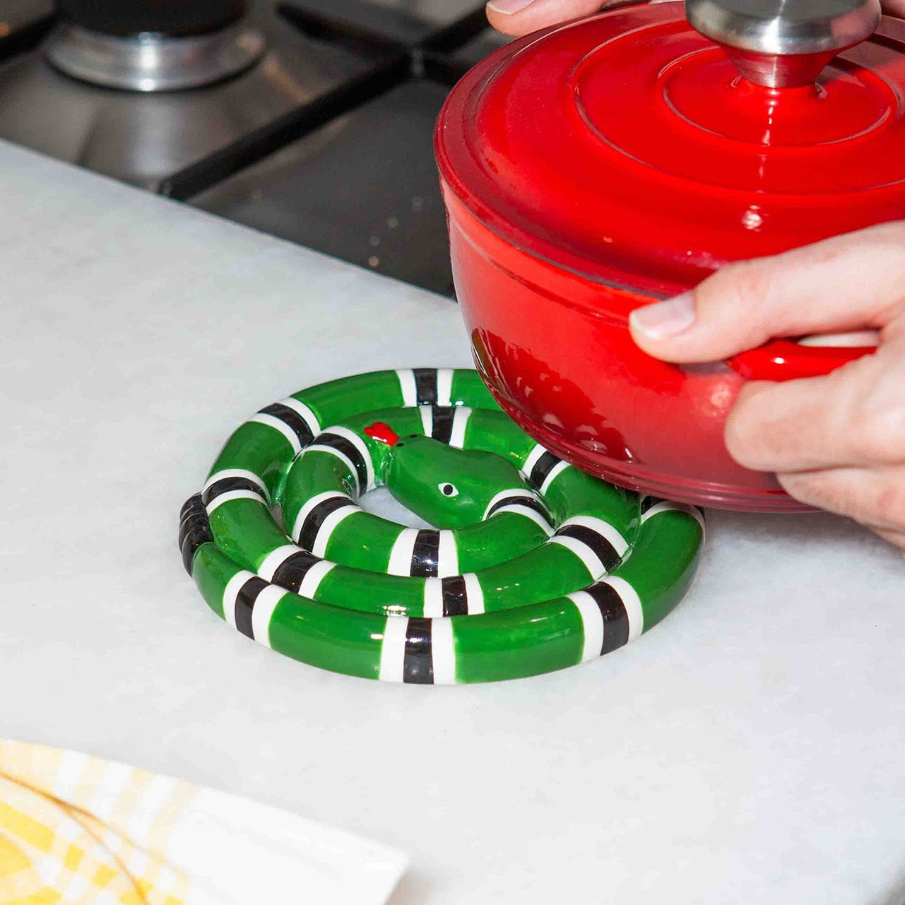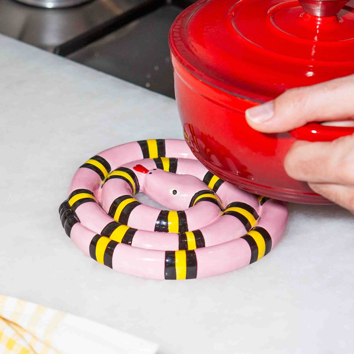愛らしいトグロを巻いた蛇デザインの陶器製鍋敷き。スペインブランドならではの大胆でカラフルな色使いが特徴です。つぶらな瞳とちろっと出た舌がチャーミングなアクセントに。鍋敷きとしての実用性はもちろん、置くだけでテーブルを華やかに演出するインテリア雑貨としてもお楽しみいただけます。キッチンやダイニングを明るく彩る、デザイン性の高い鍋敷きです。