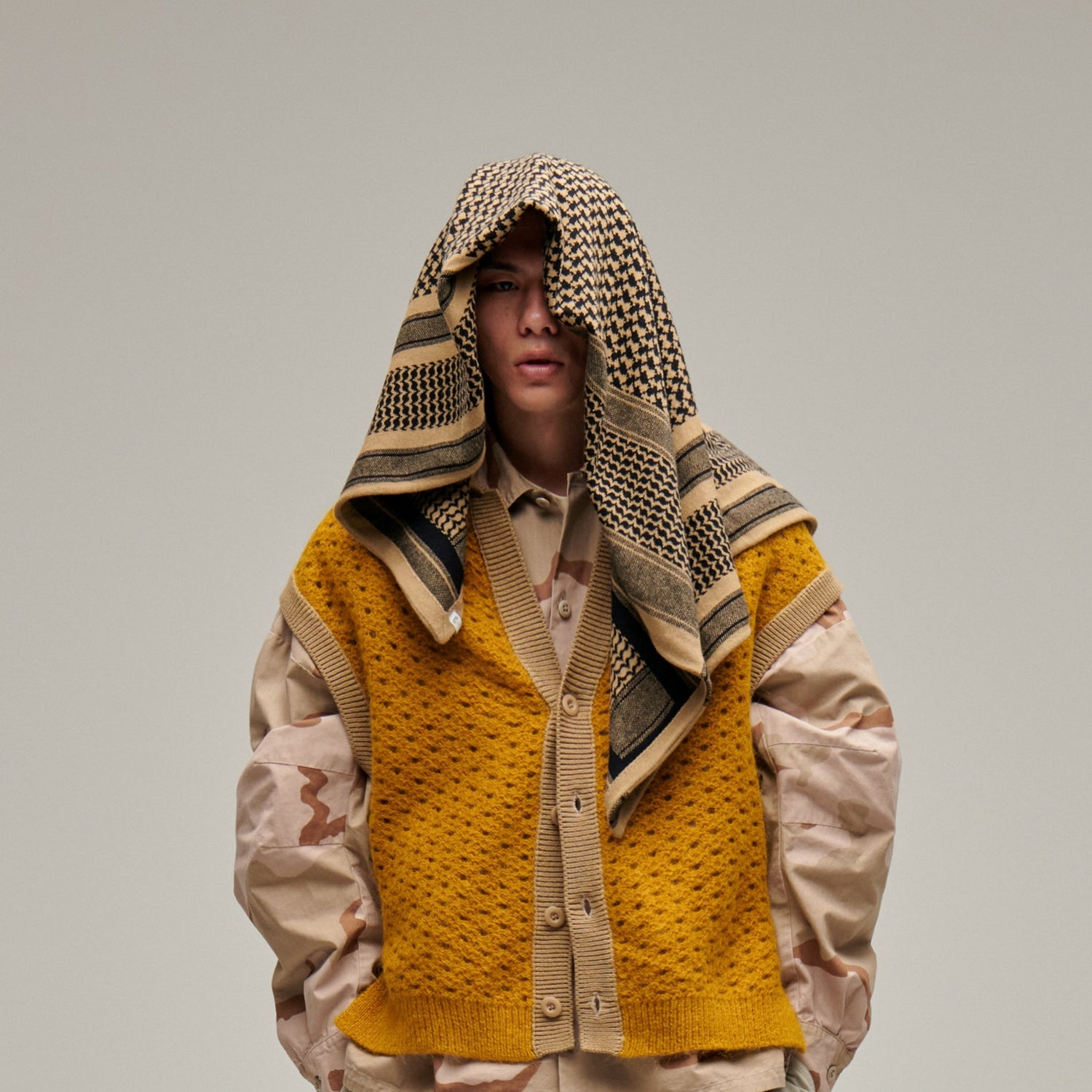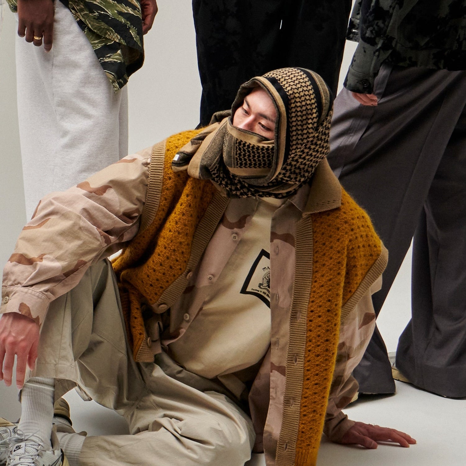 日本のファッションでも多く使用されるShemaghをカシミア混コットンウールを贅沢に使用し制作。Shemaghとはアフガンストールとも呼ばれ中近東の人々がマフラーやターバンとして使用する大判のマフラー。中東の人々はもとより米兵なども顔に巻いているのをみることも多い。日本ではファッションの一部としてヒップホップのファッションなどでも多く取り入れられるアイテム。このシュマグをアップグレードさせるべく高級素材を使用しウィンターシーズン用の大判ストールをオリジナルで編んだMAGIC STICKのニッティングシリーズ。