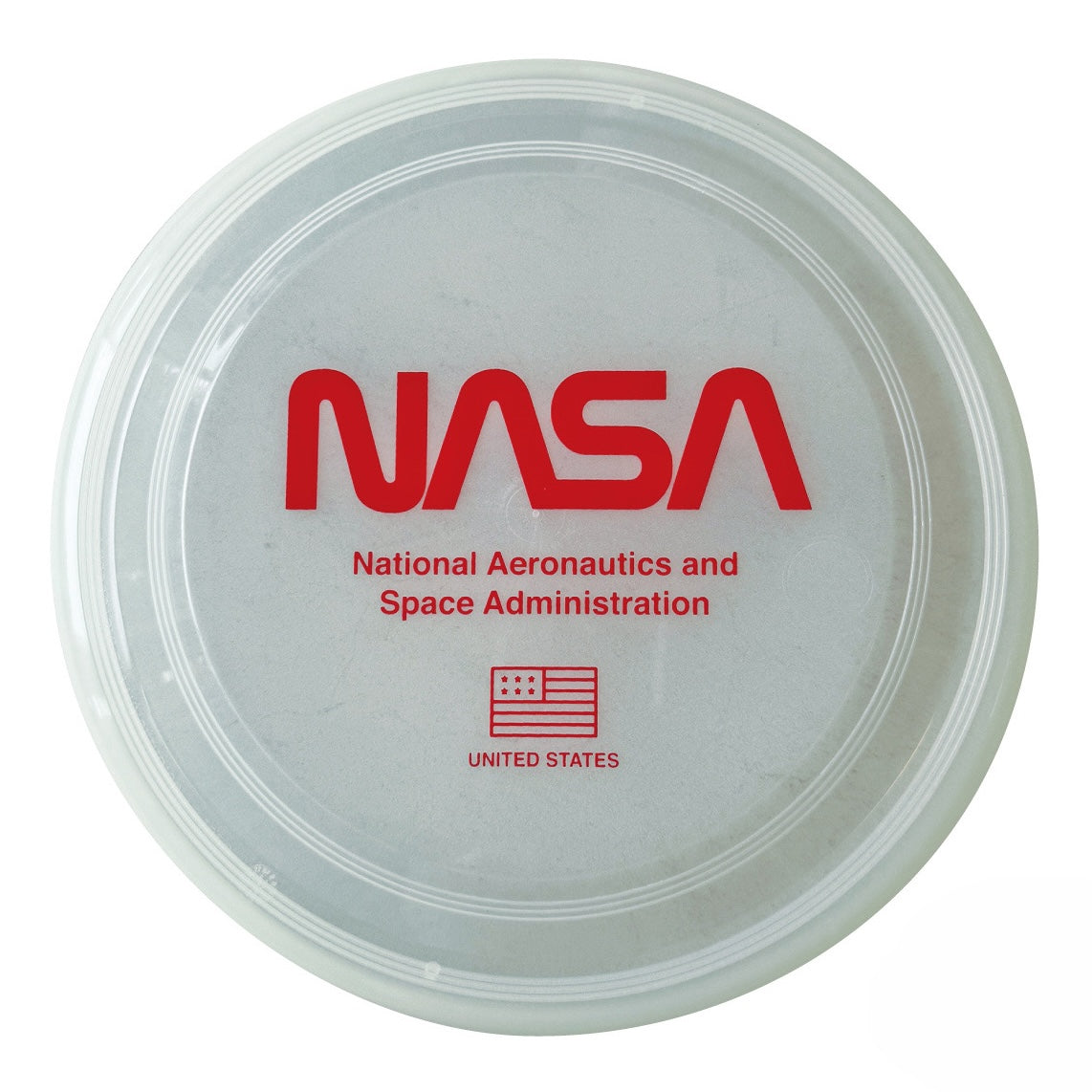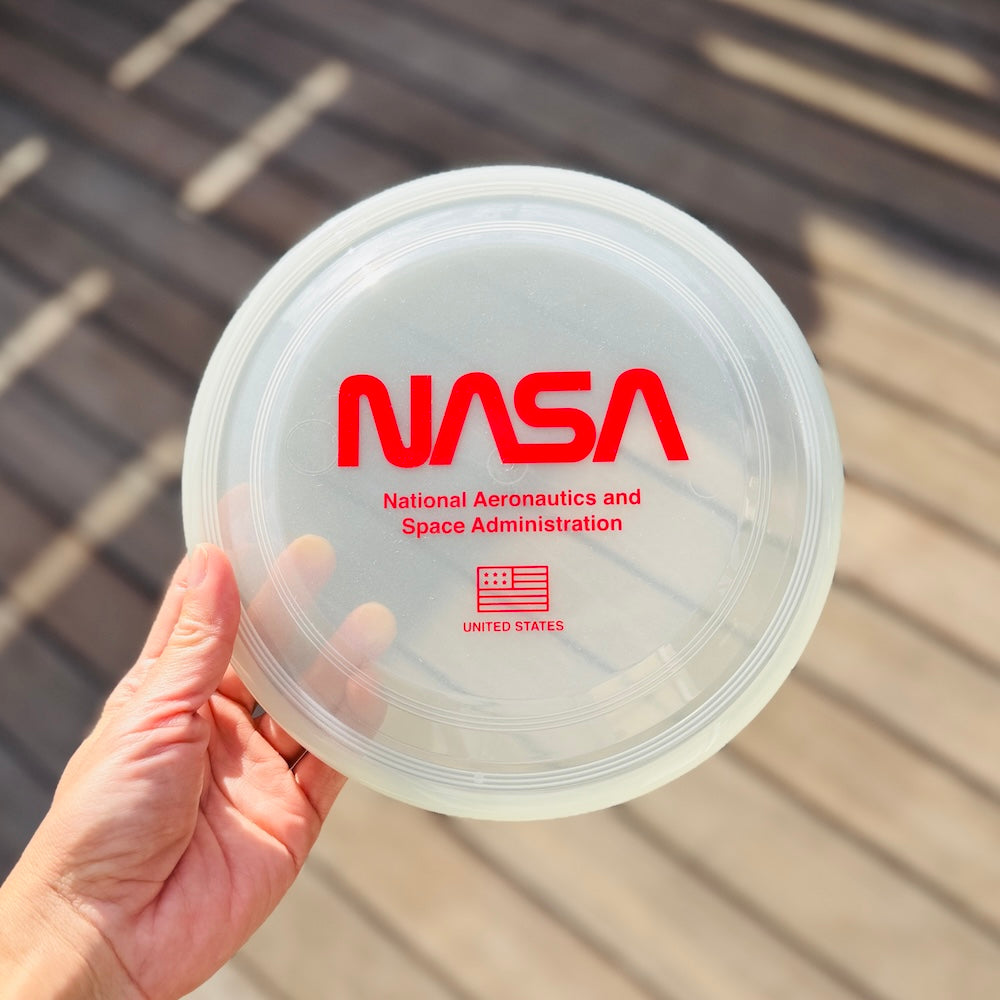 NASAのロゴ入りフリスビーです。蓄光なので、暗闇で光ります。色の経年劣化や形状変化が発生する事があります。