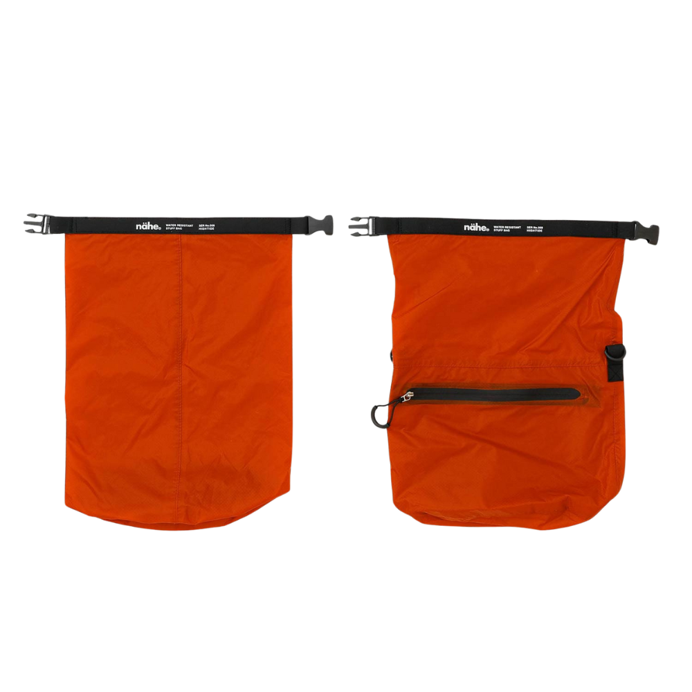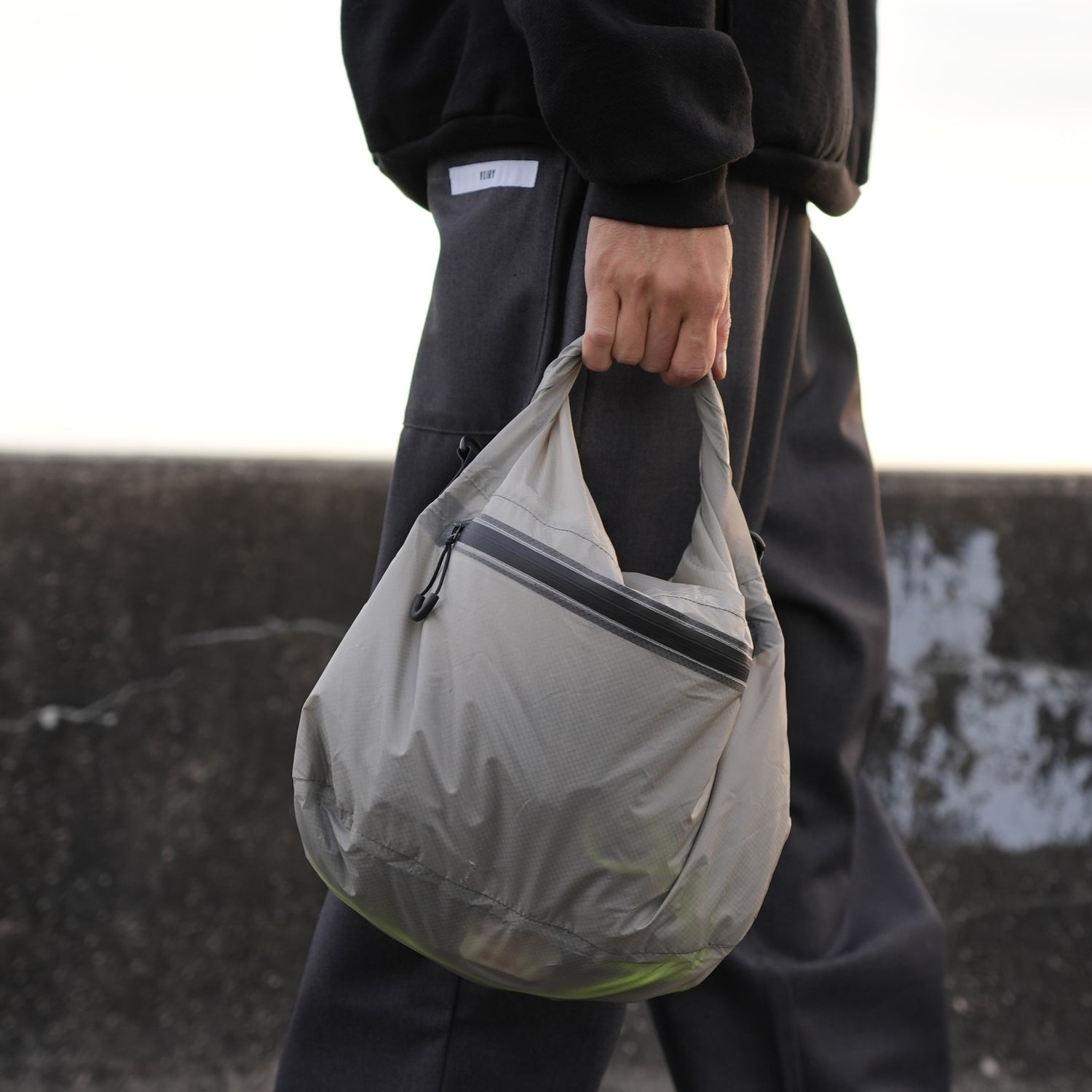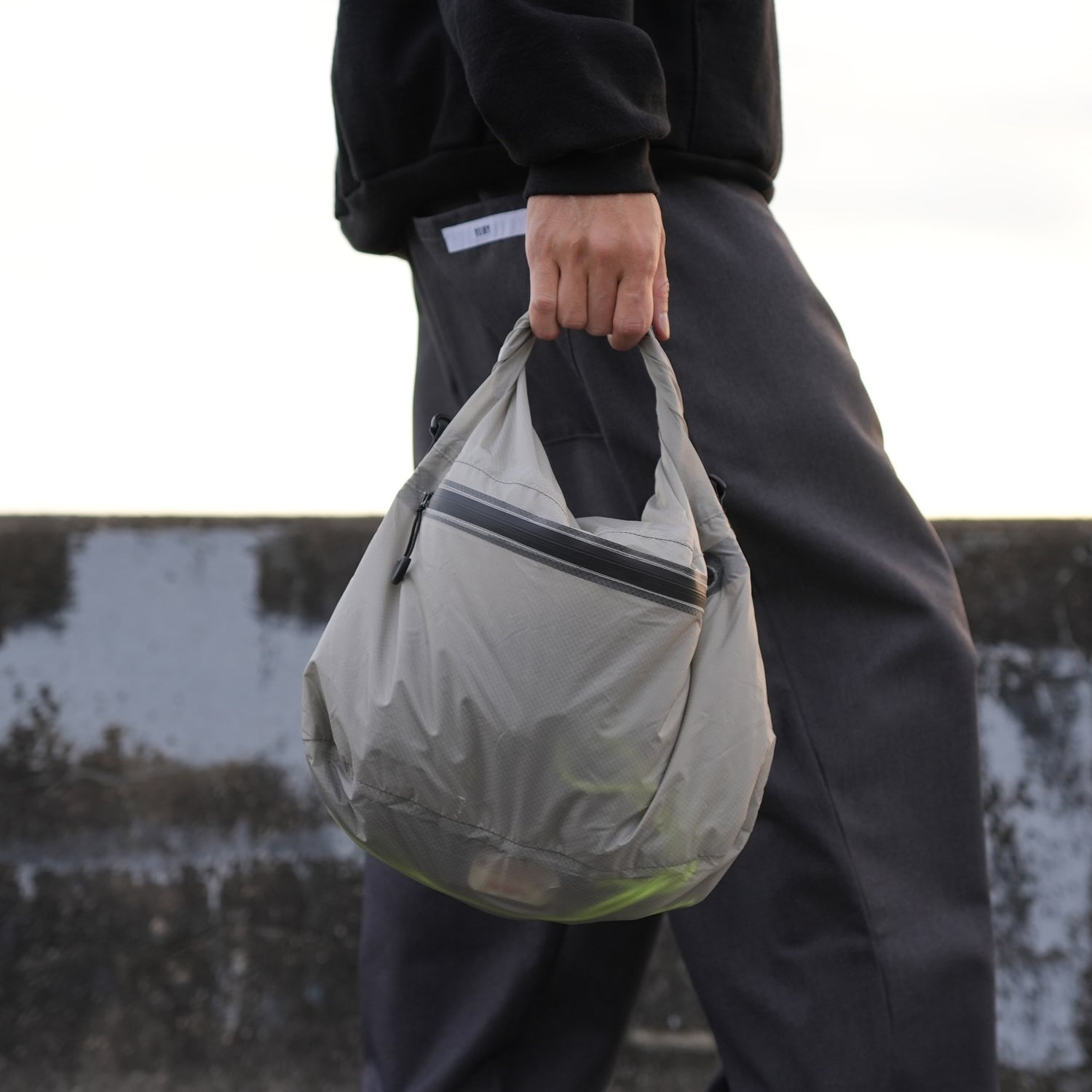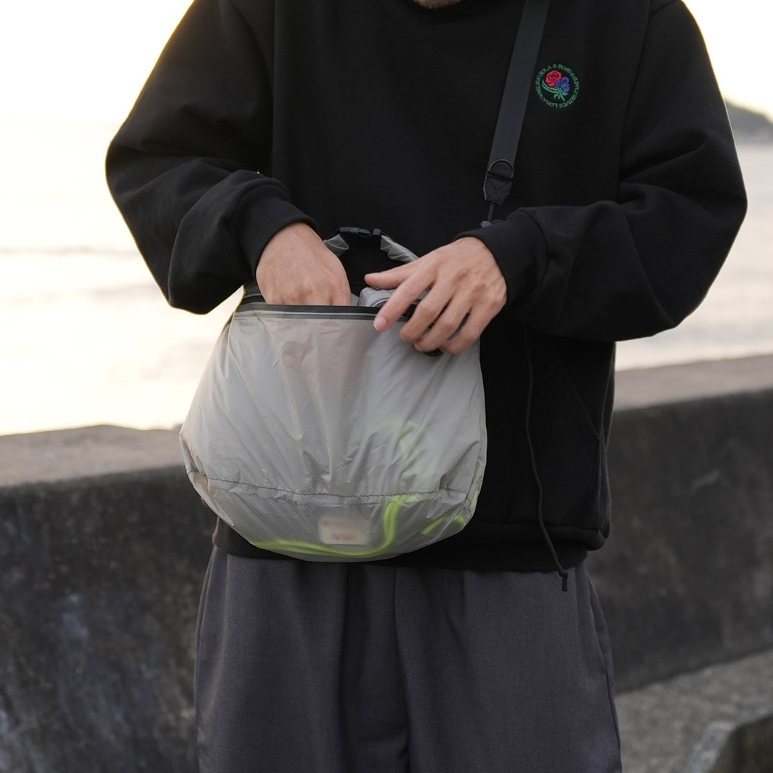 撥水加工を施したドライバッグ。本格的なアウトドア用品などにも多く使われている「高密度リップストップナイロン」を使用しており、薄くて超軽量でありながら、頑丈で耐久性に優れているのが特徴です。旅行時のサブバッグやエコバッグ、衣類・靴などの収納にぴったり。ステッチ部分にはシームテープを貼っており、生地の継ぎ目から浸水を防ぐので、ジムやサウナでも活躍します。使わない時はクルクルとコンパクトに丸めてバッグの持ち手などにつけておいても。荷物が増えた時のサブバッグとしても使えます。Dカンにストラップ(別売りです)をつけるとサコッシュとしても使用できる、汎用性の高い収納バッグです。S(約4L)とL(約10L)、2つのサイズをご用意していますので、用途に合わせてお選びください。