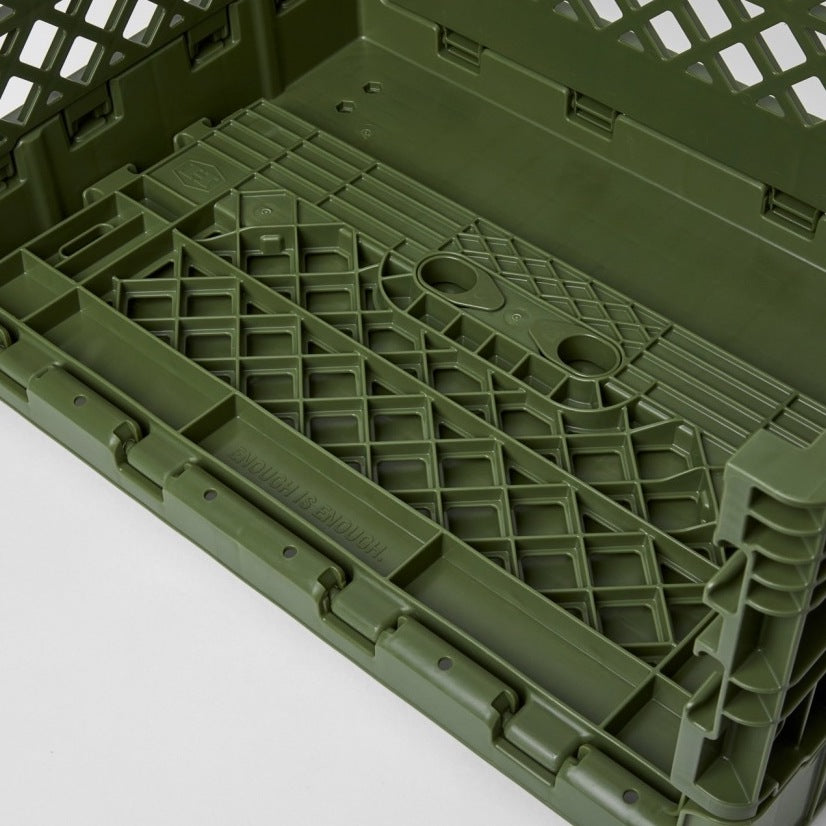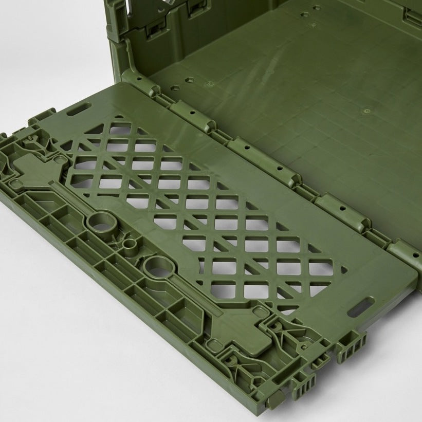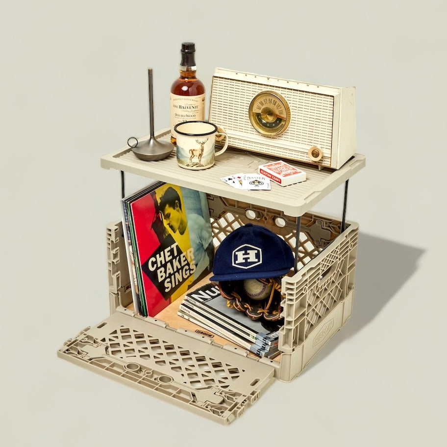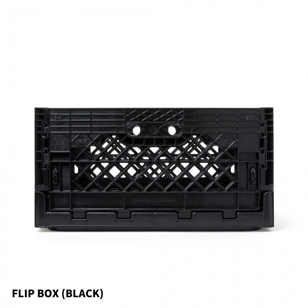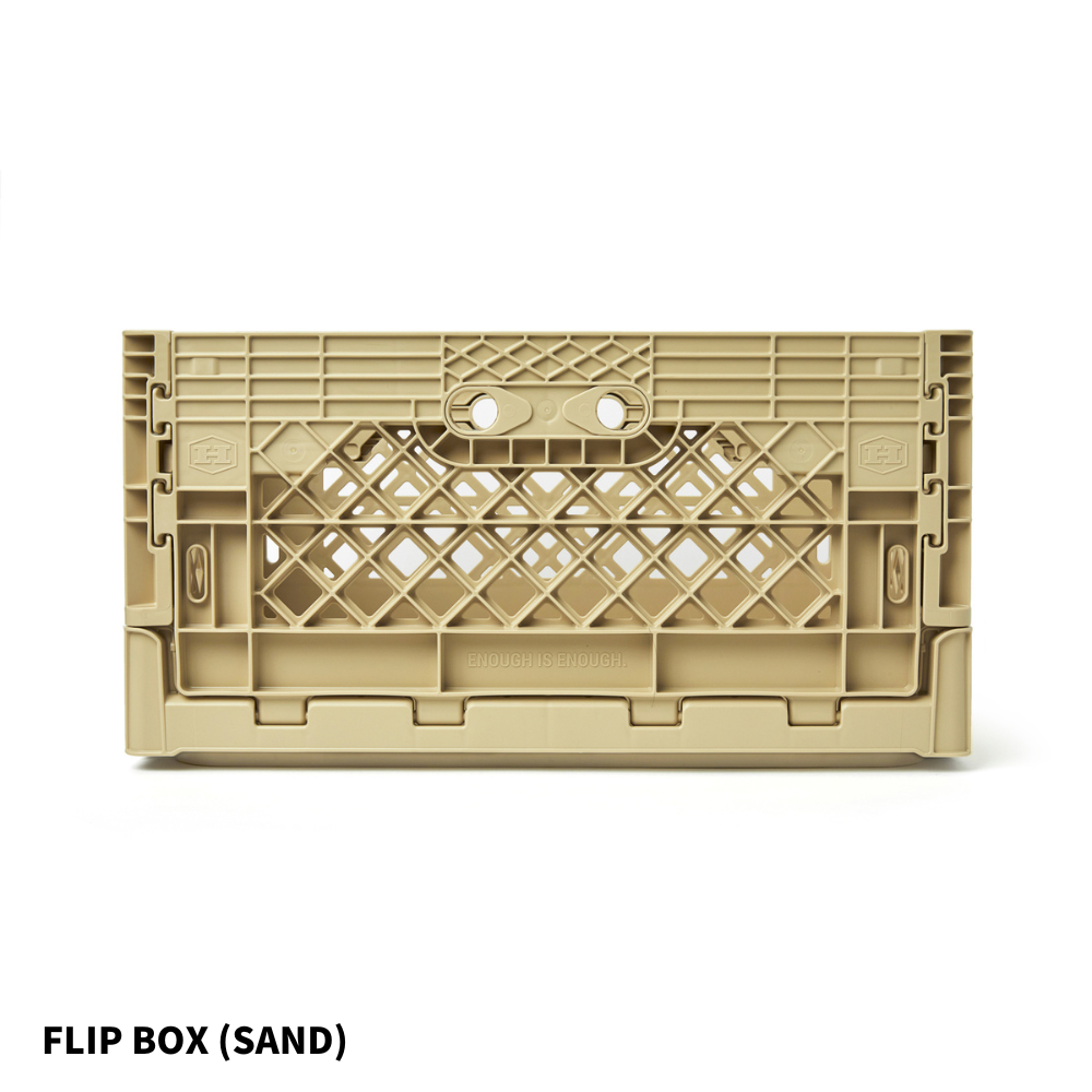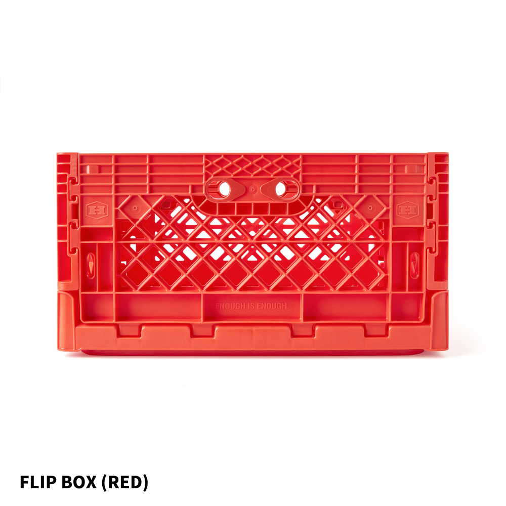 基本の基の折りたたみコンテナ「FLIP BOX」。容量40Lで、両サイドどちらからでも開け閉め可能、奥にも手前にも倒せるのが痒い所に手が届いてます。もちろんスタッキングした状態や天板を置いた状態でも開閉可能なので収納ボックスとしての使い勝手は◎。 専用パーツと組み合わせることで、自分のスタイルで自由にアレンジすることができる拡張性の高さが、他のブランドのものとは一線を画しています。耐価重15kg。全6色。どの色がお好み?