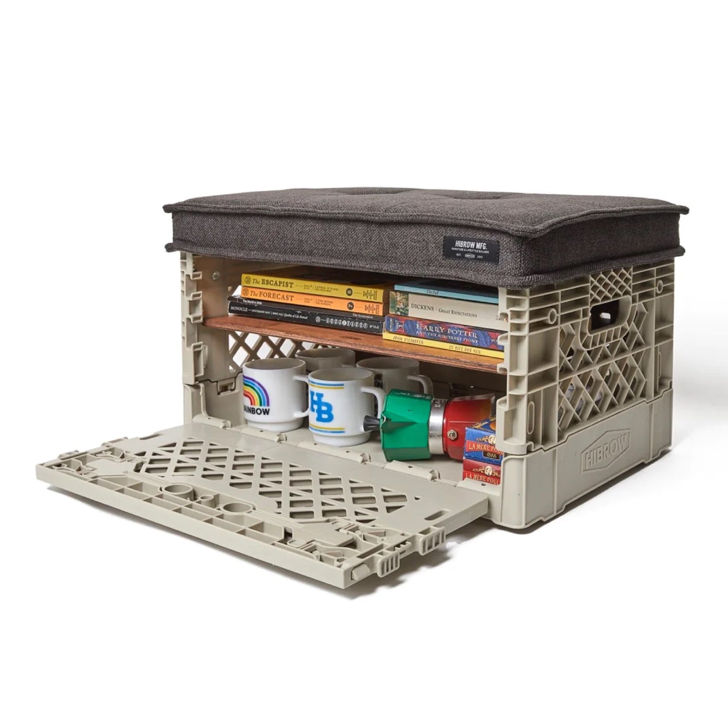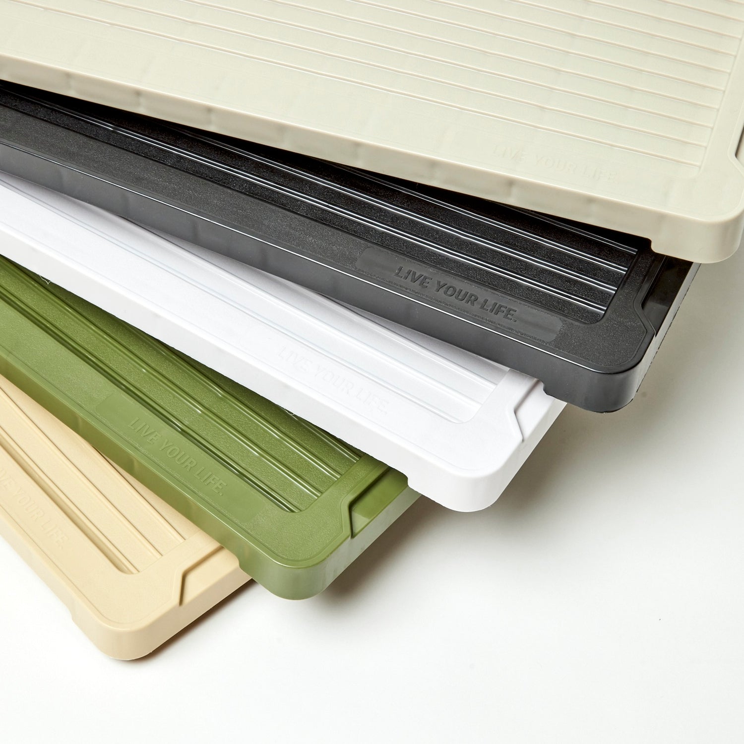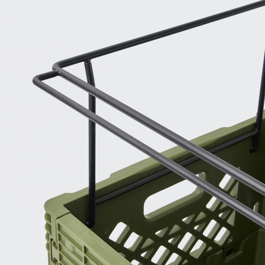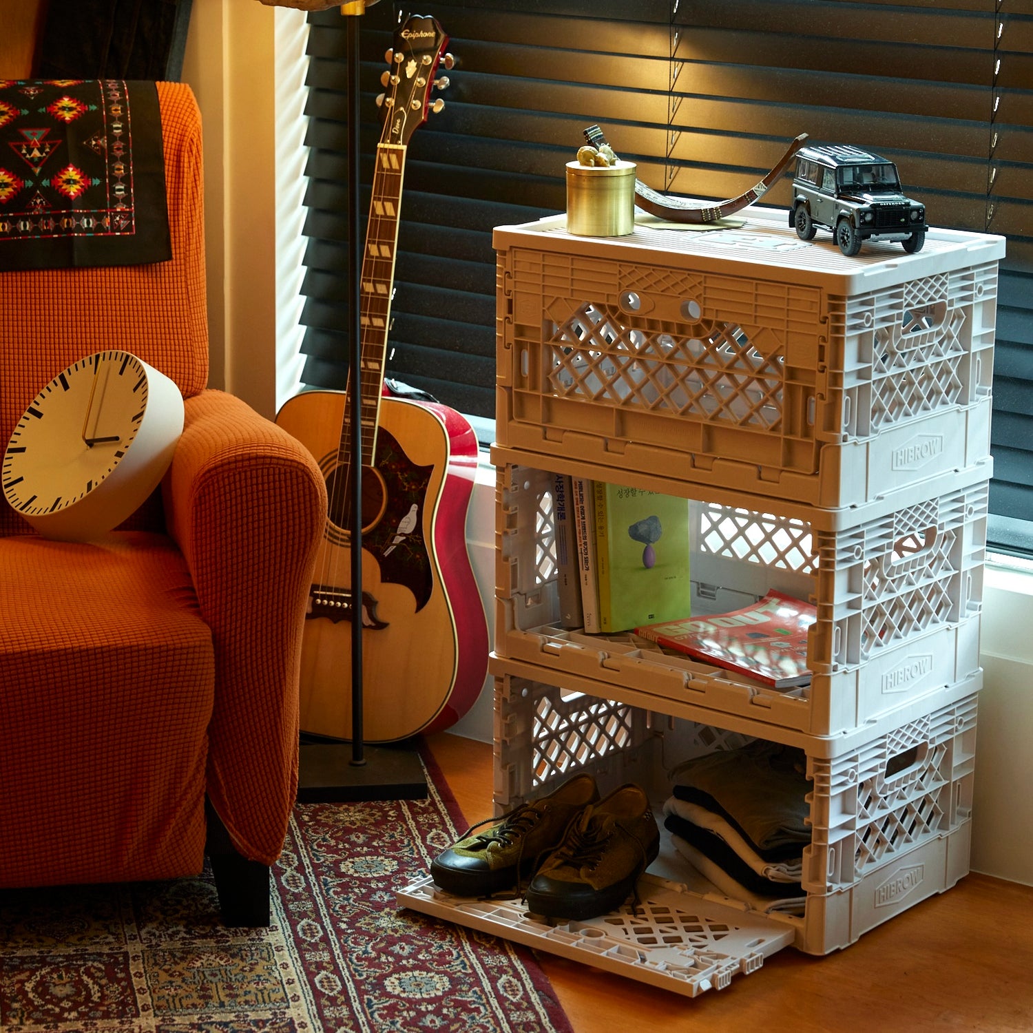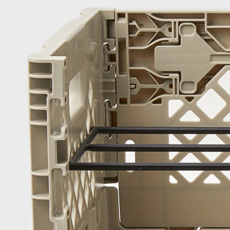 基本の基の折りたたみコンテナ「FLIP BOX」。容量40Lで、両サイドどちらからでも開け閉め可能、奥にも手前にも倒せるのが痒い所に手が届いてます。もちろんスタッキングした状態や天板を置いた状態でも開閉可能なので収納ボックスとしての使い勝手は◎。 専用パーツと組み合わせることで、自分のスタイルで自由にアレンジすることができる拡張性の高さが、他のブランドのものとは一線を画しています。耐価重15kg。全6色。どの色がお好み?