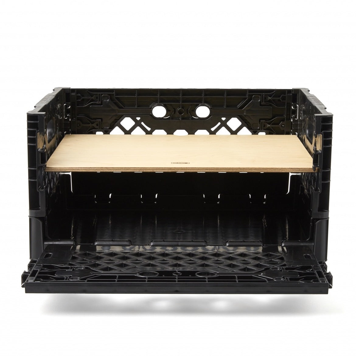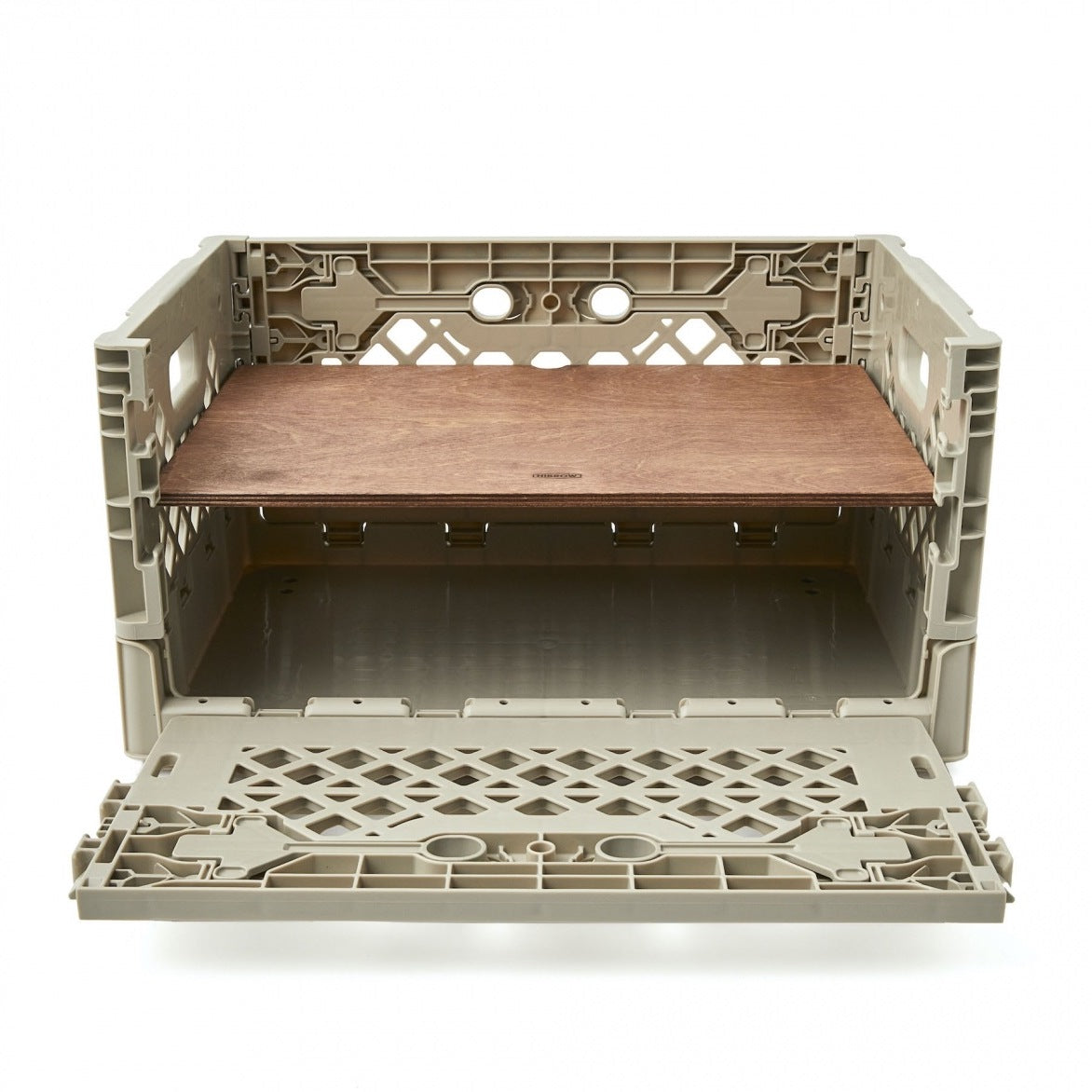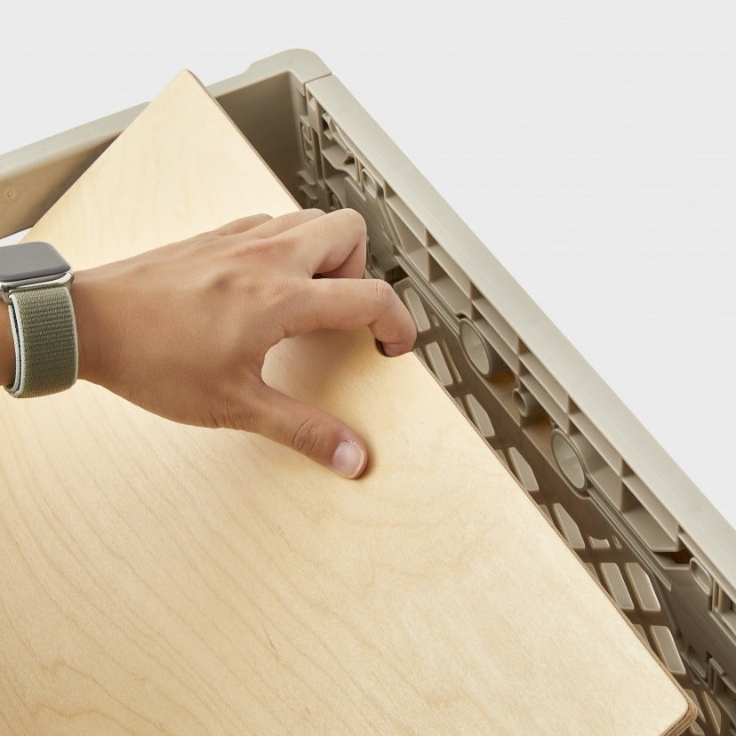 従来のウッドの天板に比べて約40%軽量で扱いやすく、汚れや水濡れにも強いのが利点。強度が高く変形にも強いので、屋外での使用にもぴったりです。上にウッドのFLIP TOPを重ねて使うこともできる上に、FLIP SHELFがシンデレラフィットするのもこだわり。FLIP BOXを畳んだ状態で乗せることも、FLIP TOP PLASTICをしたままFLIP BOXを重ねることも可能。FLIP BOXの拡張性をさらに広げるアイテムです。耐荷重5kg
