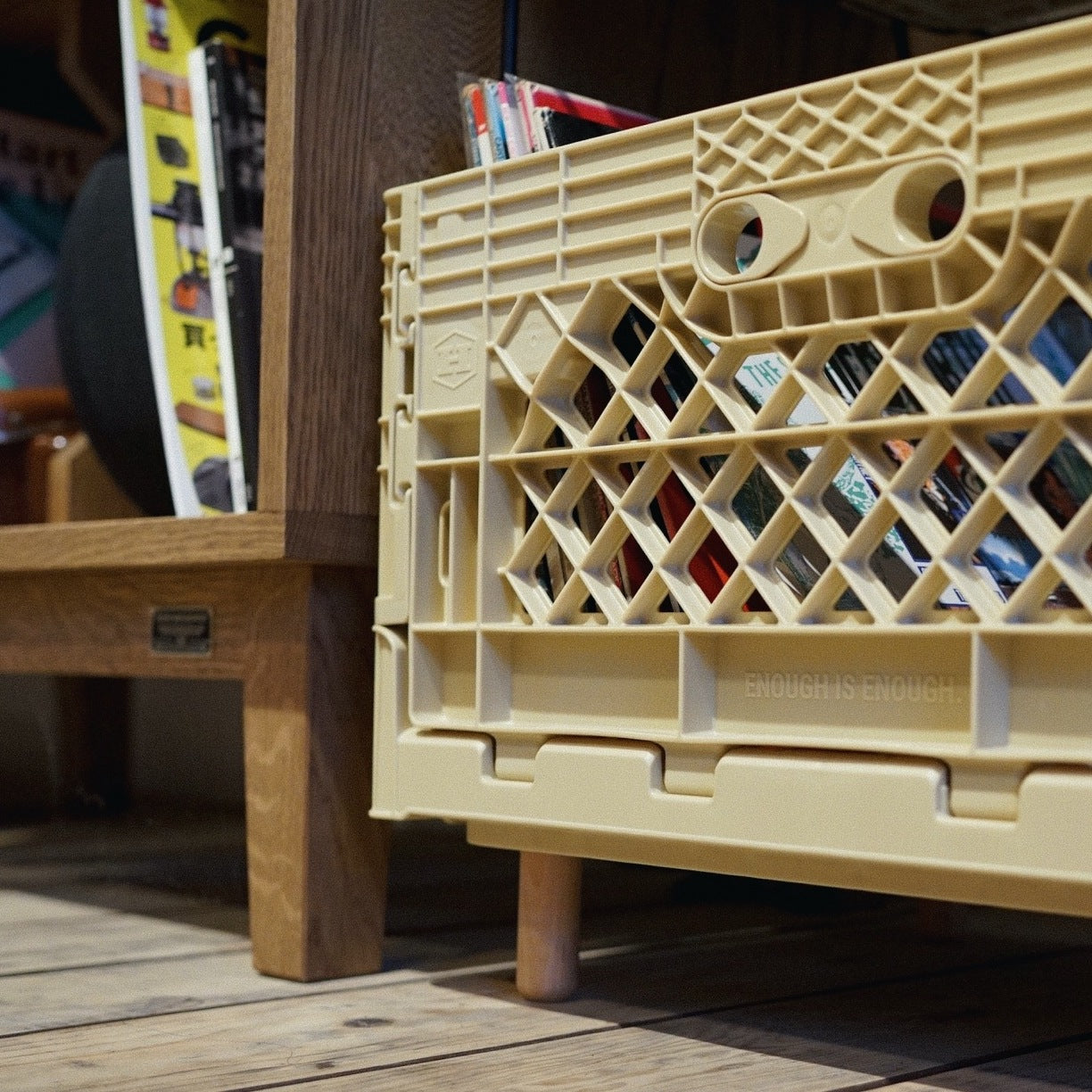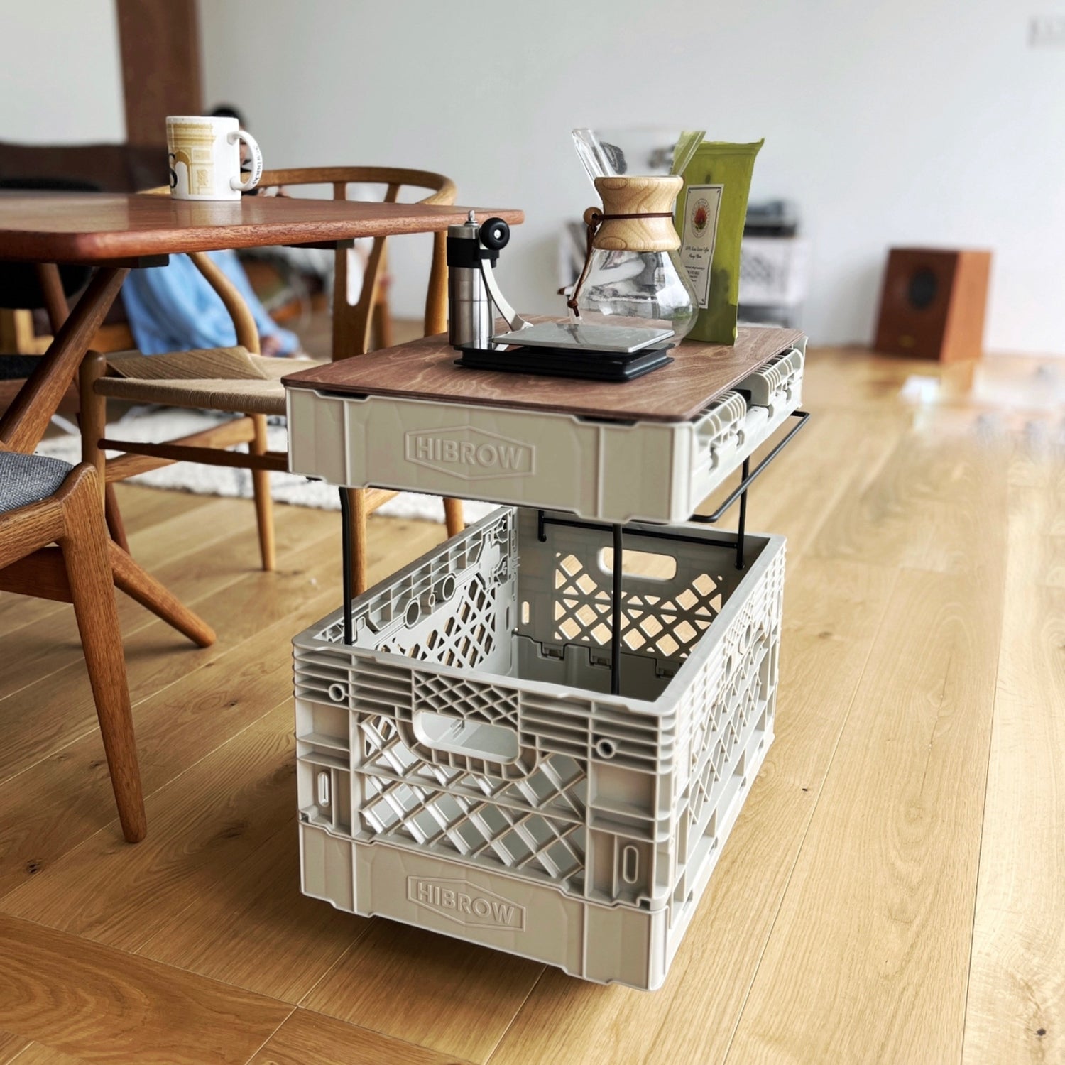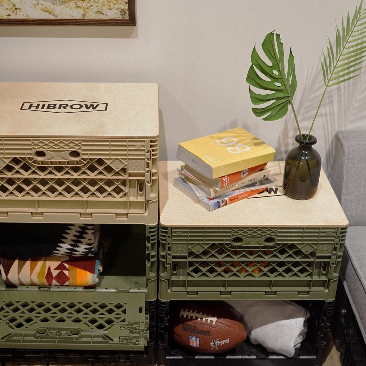 2番目の写真を参考にレコードプレーヤー台とレコード入れとして組み合わせで購入しました。とてもスタイリッシュでレコードの幅と下のボックスの大きさもちょうど良く気に入って使ってます。めちゃオススメです!!