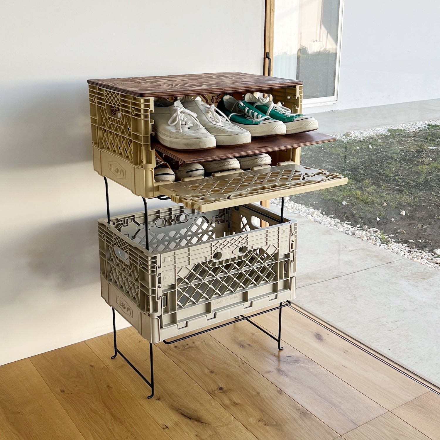 最大の特徴は「カスタマイズ可能な拡張性の高さ」。拡張性がとにかく高いので、どんどん付け足して、自分仕様にパワーアップさせていってみてください。僕は、BOTANIZEの店舗用にスコップなどの小物と鉢入れとして、事務所ではテーブルにカスタマイズして使っています。