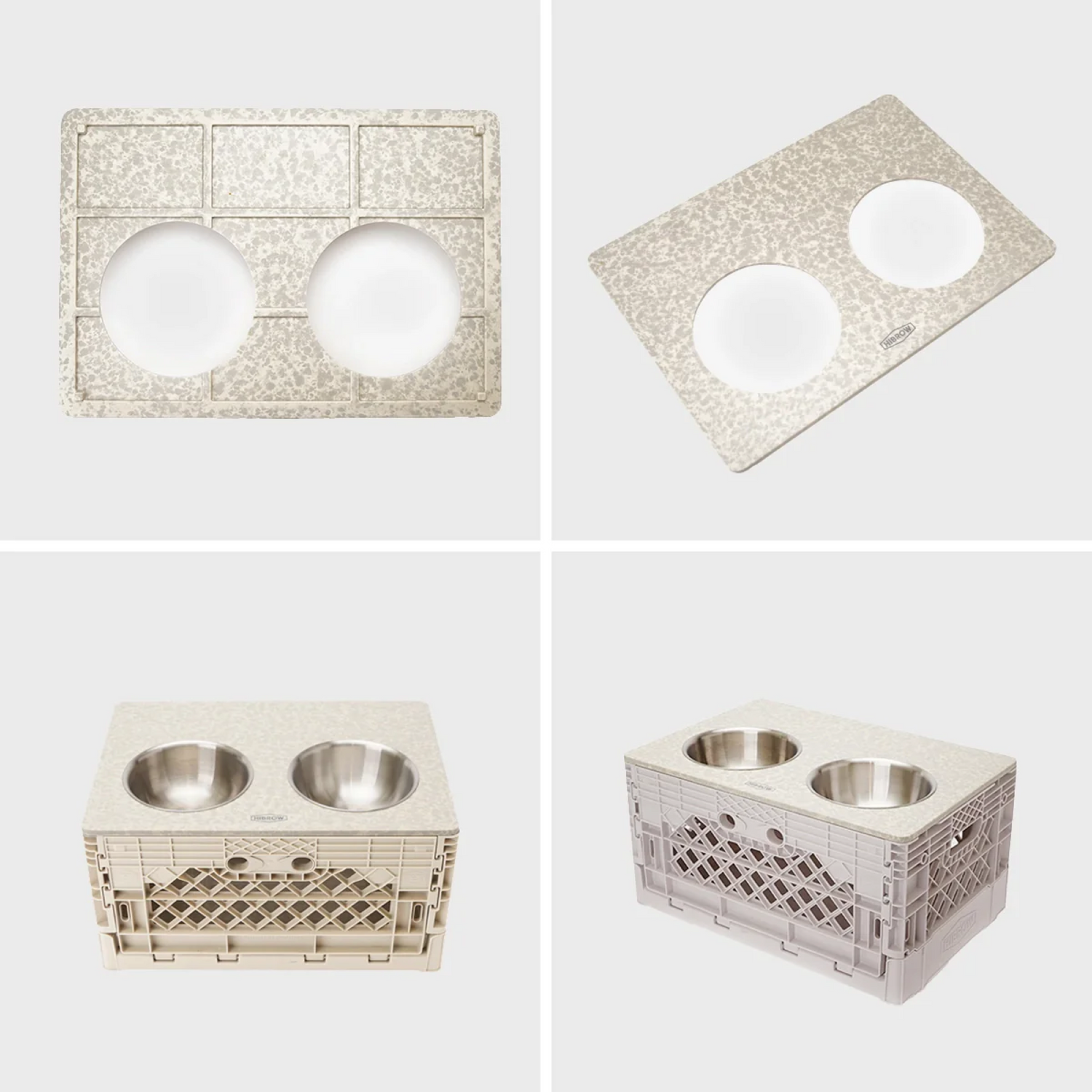 環境への配慮から日常のメラミン素材を再加工して作られた、大型犬向けのFLIP BOX専用フードボウル天板です。メラミン食器の製造過程で廃棄されるはずだった素材を再利用し、オリジナルの特別な金型によって、独特でスタイリッシュなマーブル模様に生まれ変わりました。メラミン素材は軽量でありながら、優れた耐久性を備えており、水分・湿気・熱などの外部環境にも強く、長く清潔にお使いいただけます。また、天板を設置したままでもFLIP BOXの扉を自由に開閉できるため、中にフードやおやつをすっきりと収納し、必要なときにすぐ取り出してご利用いただけます。