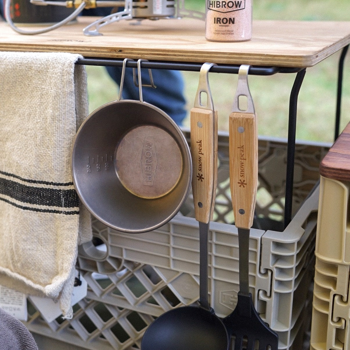 スチール細工で有名なロンバス社とコラボで製作された、耐久性と軽さを兼ね備えた「FLIP RACK」。FLIP BOXの上部に装着して、FLIP TOPやFLIP BOXを載せたり、脚として装着することができます。側面にハンギングバーを装備しているので、タオルやフック付きの小物などをかけておくことが可能。これがアウトドア時にめちゃめちゃ便利。