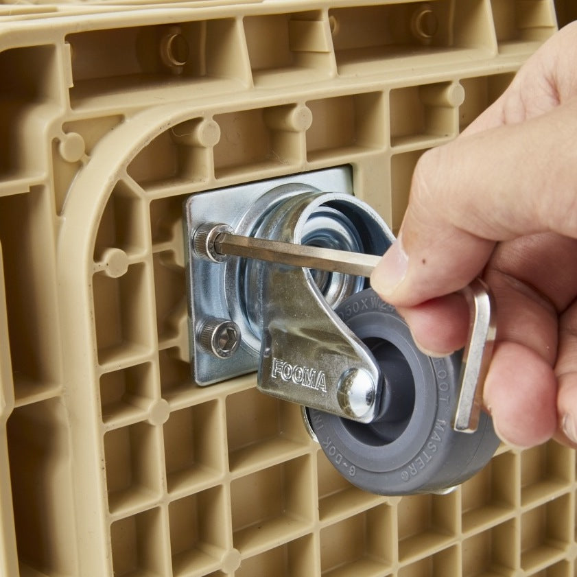 FLIP BOXにボルトオン方式で装着が可能な専用ホイール「CASTERS」。4つあるホイールのうち、2つのホイールにストッパーが付いているのも嬉しい機能。