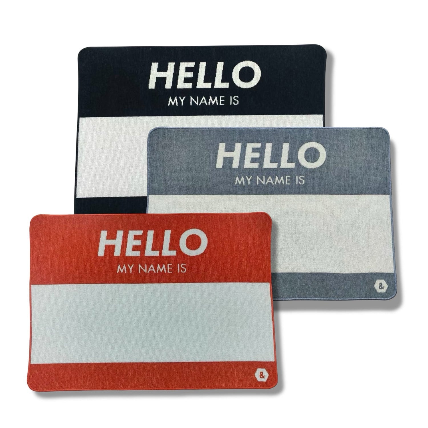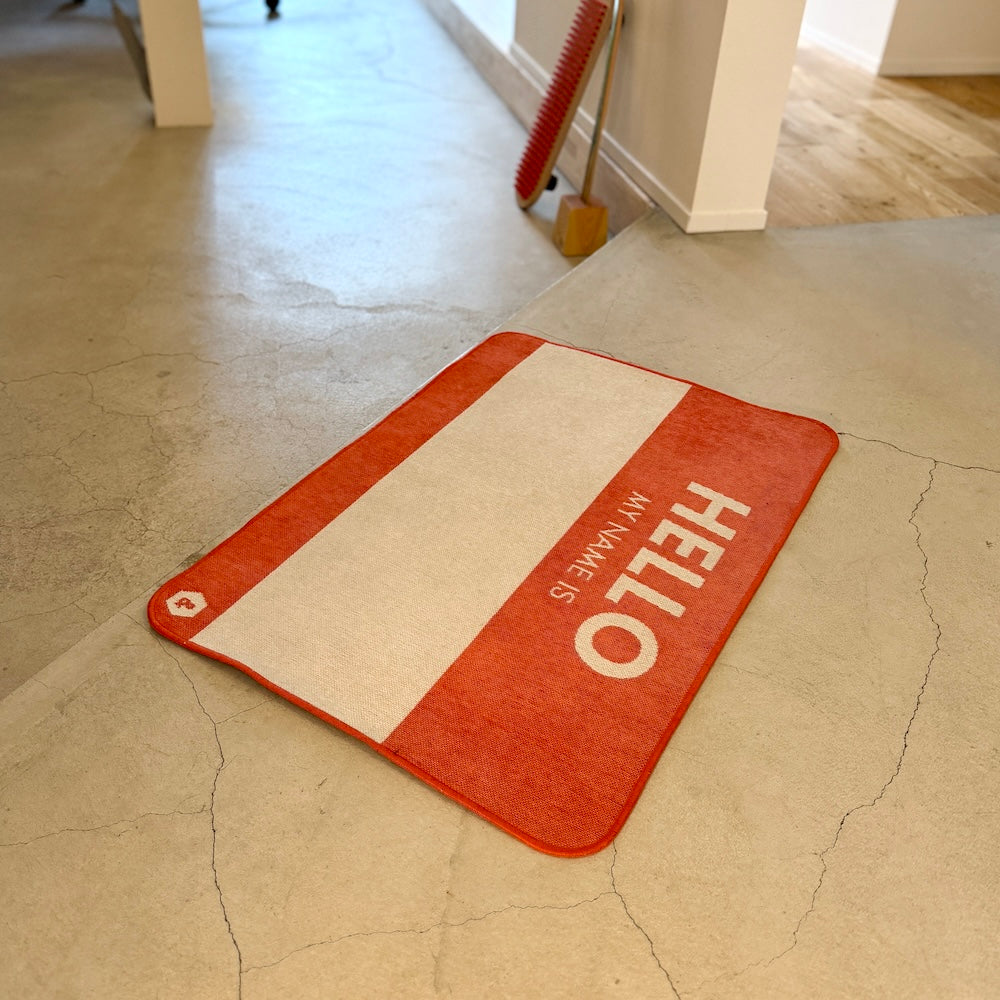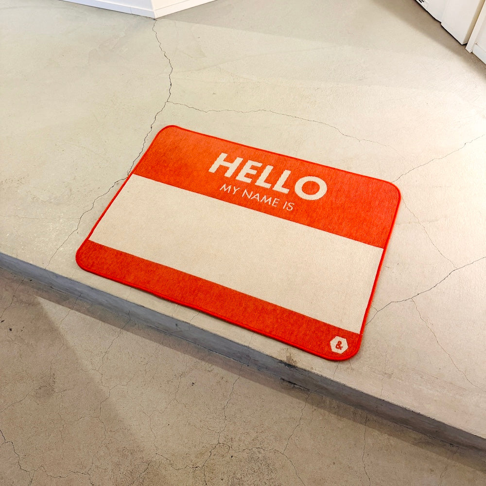 HELLO MY NAME IS ステッカーを模したラグマット。