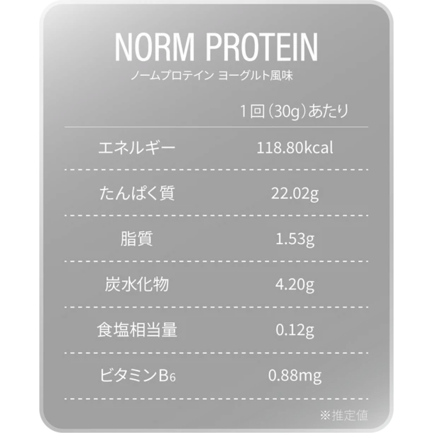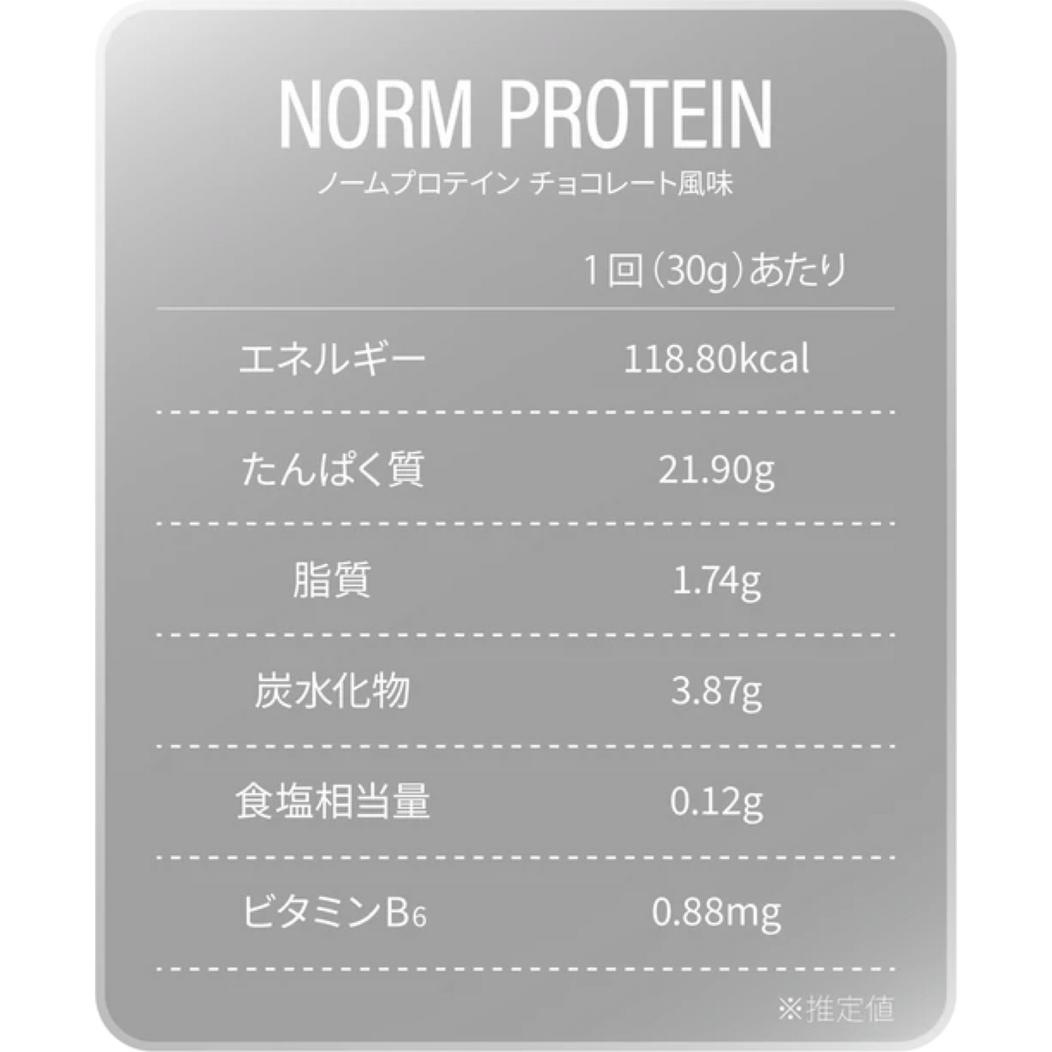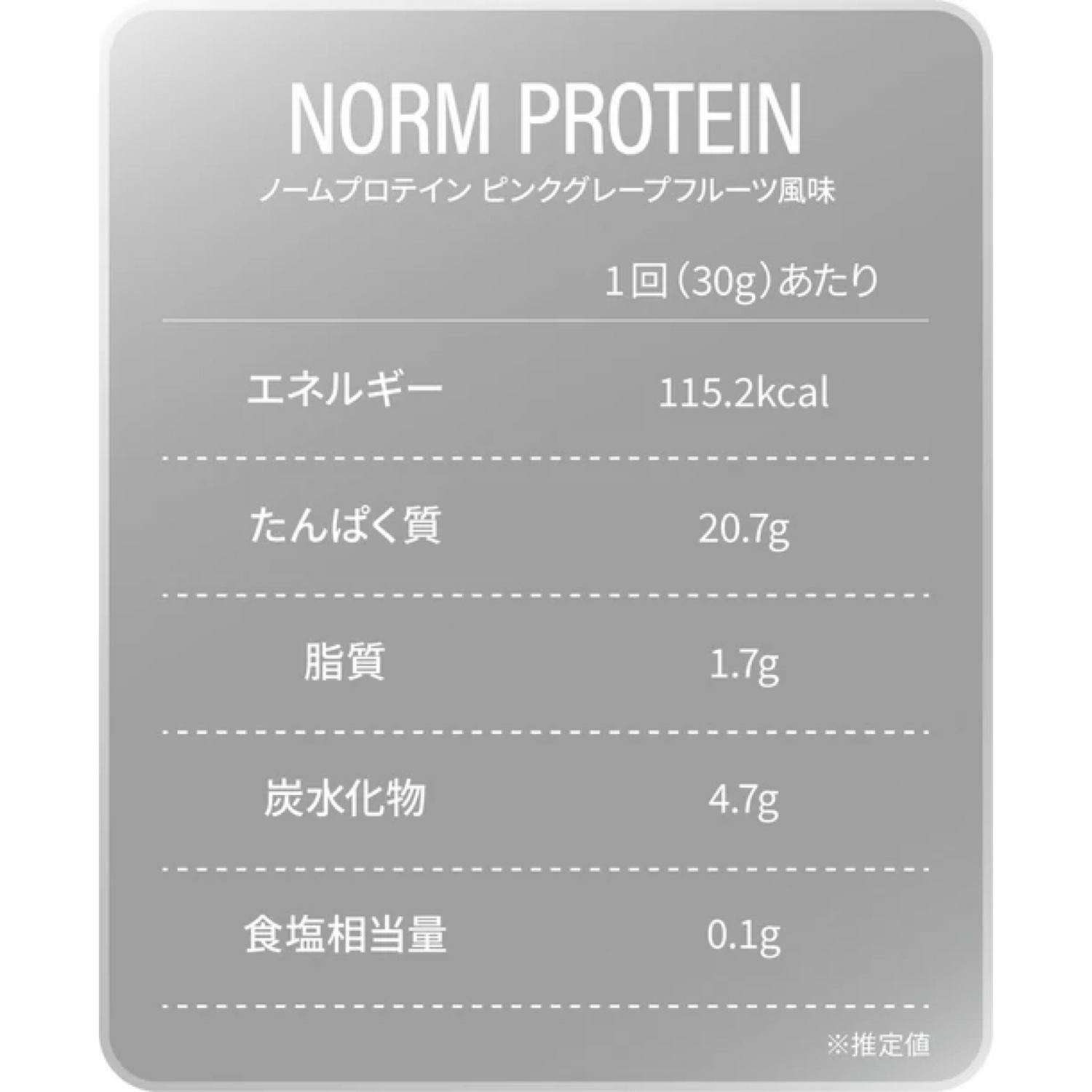 | 原材料 | チョコレートプロテイン:乳清たんぱく(アメリカ製造)、ココアパウダー/乳化剤、甘味料(ステビア)、香料、ビタミンB6(一部に乳成分・大豆を含む) ヨーグルトプロテイン:乳清たんぱく(アメリカ製造)、粉末水あめ、ヨーグルトパウダー(殺菌)/酸味料(クエン酸)、香料、乳化剤、甘味料(ステビア)、ビタミンB6(一部に乳成分・大豆を含む) ストロベリープロテイン:乳清たんぱく(アメリカ製造)、粉末水あめ、ビルベリーエキス末、いちご果汁パウダー / クエン酸、香料、乳化剤、甘味料(ステビア)、ビタミンB6、(一部に乳成分・大豆を含む) 抹茶ラテプロテイン:乳清たんぱく(アメリカ製造)、抹茶、クリーミングパウダー/香料、乳化剤、甘味料(ステビア)、V.B₆、(一部に乳成分・大豆を含む) ピーチプロテイン:乳清たんぱく(アメリカ製造)、ブドウ糖/クエン酸、香料、乳化剤、甘味料(ステビア)、V.B₆、(一部に乳成分・大豆を含む) ピンクグレープフルーツ:乳清たんぱく(アメリカ製造)/クエン酸、乳化剤、甘味料(ステビア)、野菜色素、香料、V.B₆、(一部に乳成分・大豆を含む) |