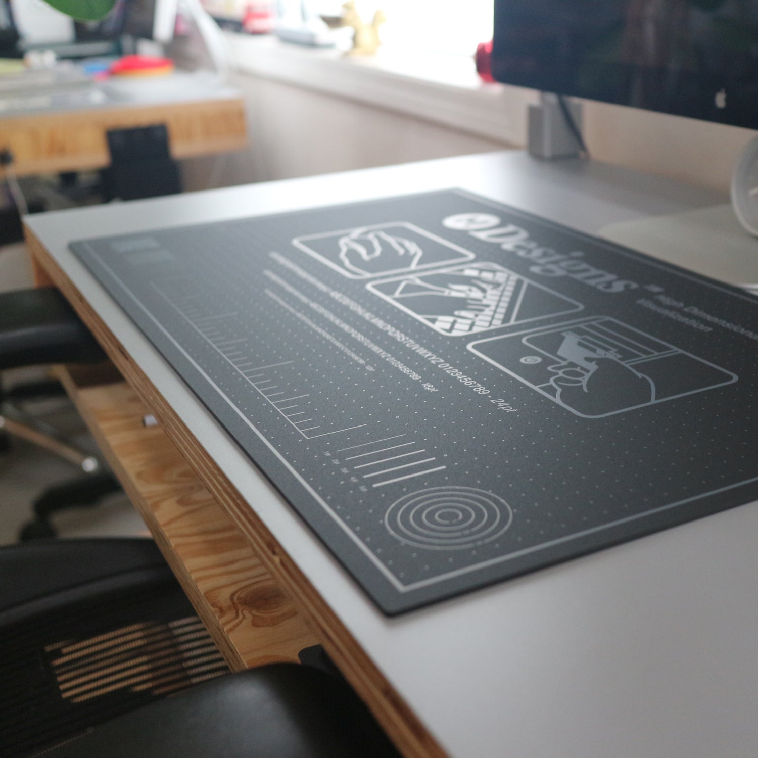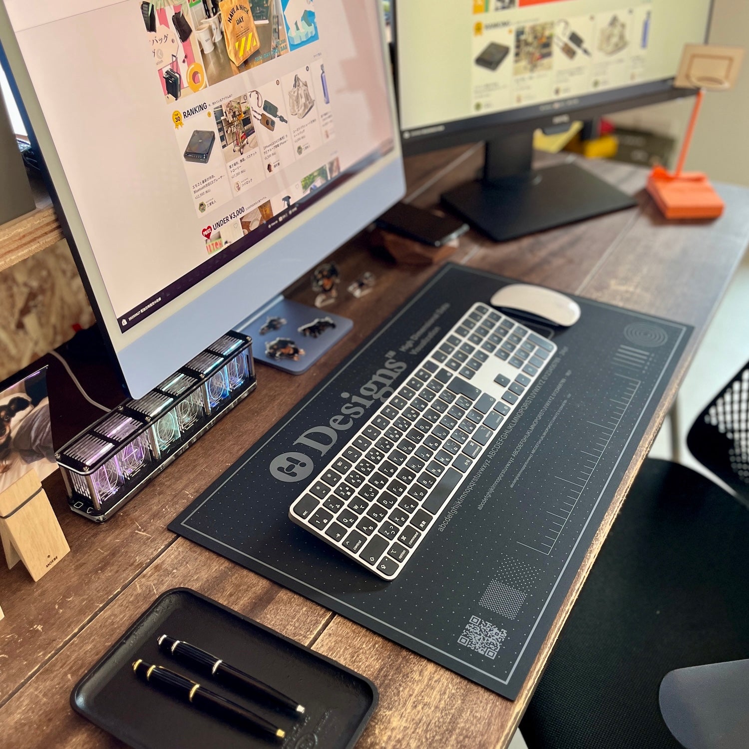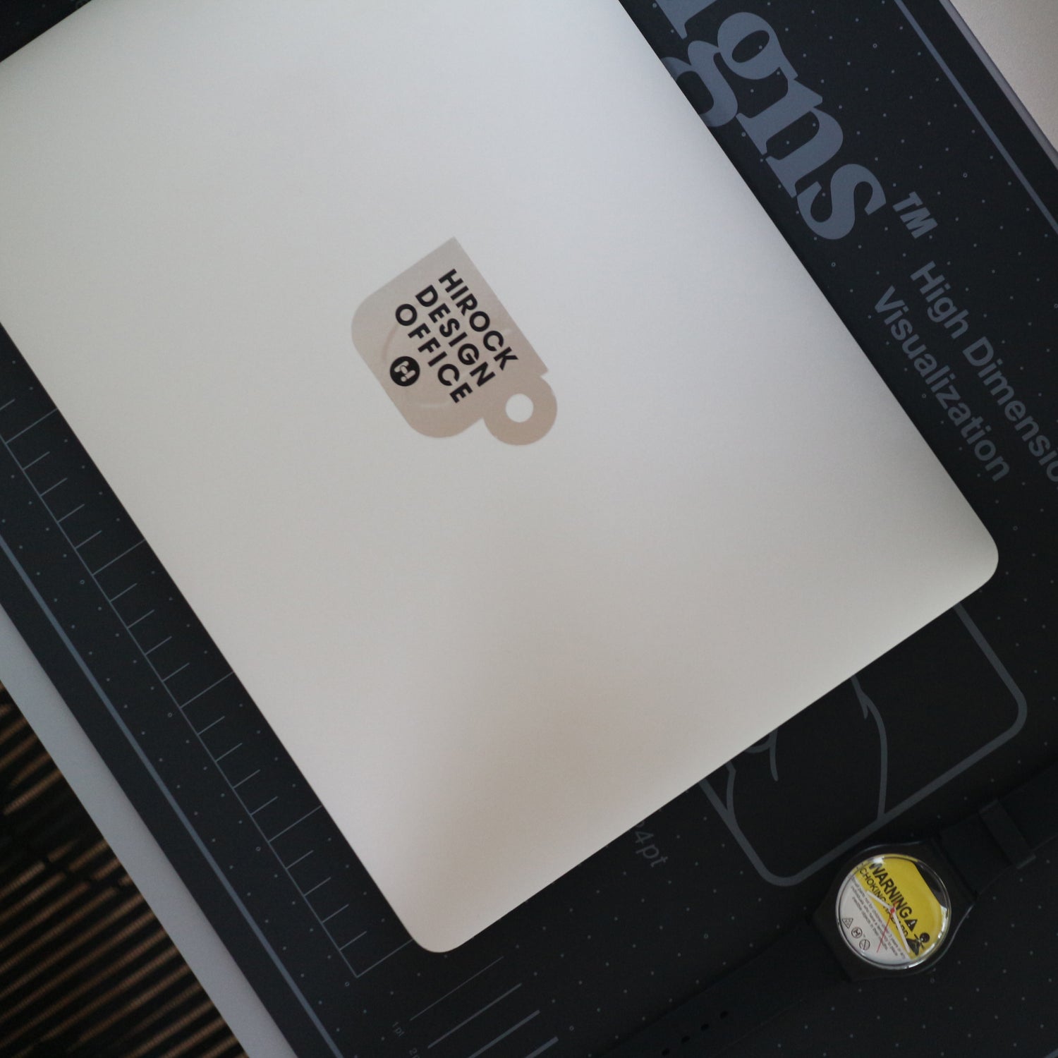 ハイロックデザインオフィス用に開発した特大のデスクマット。デザインという職業柄、日常的に机の上で作業や工作を行っていて、その度にカッターマットを出したりしまったりするのは面倒くさいと思い、だったら机ごとマットにしてしまえというのが発想の起点。もともとは86cm x 86cmという超特大サイズで、限定発売で即完売となりましたがその一方でもう少し小さいものが欲しいという声をたくさん頂き商品化したのがこのハーフサイズ(正確には30%)の特大デスクマット。製作はMIWAX。