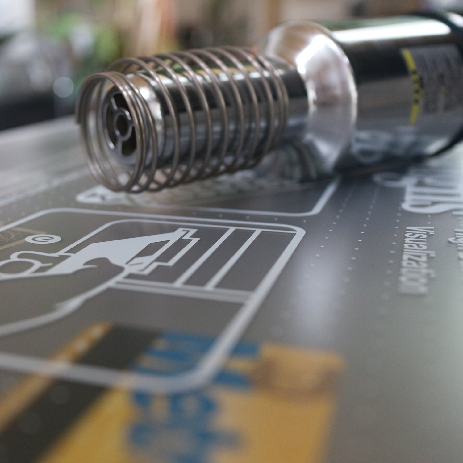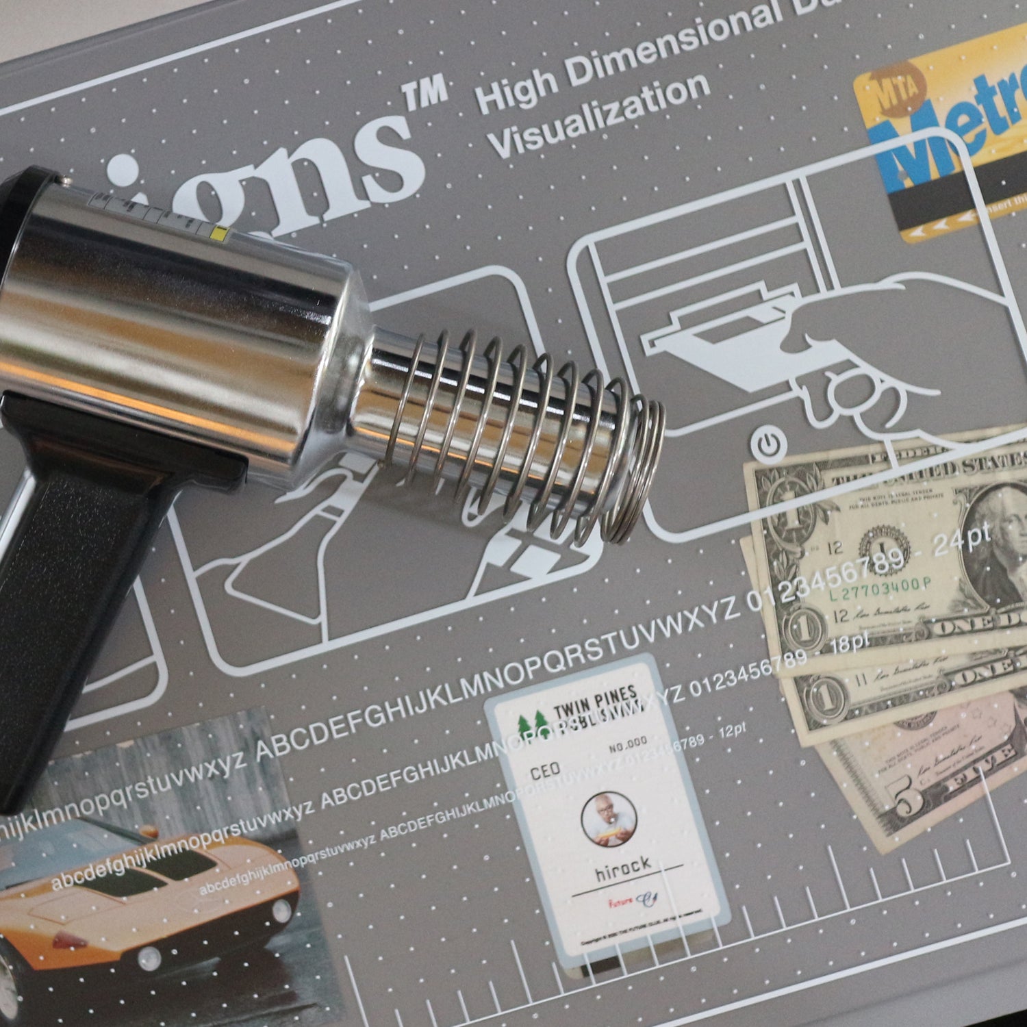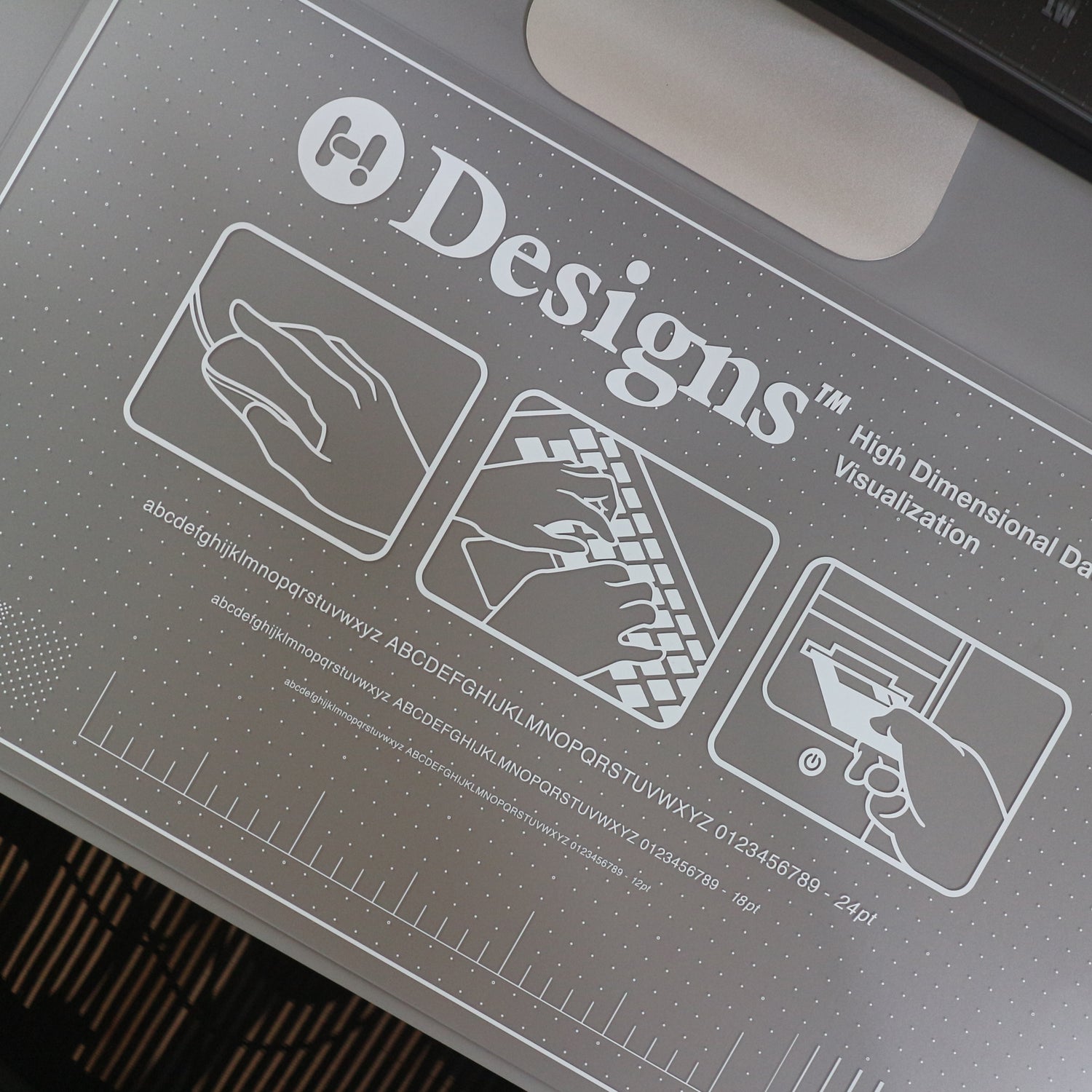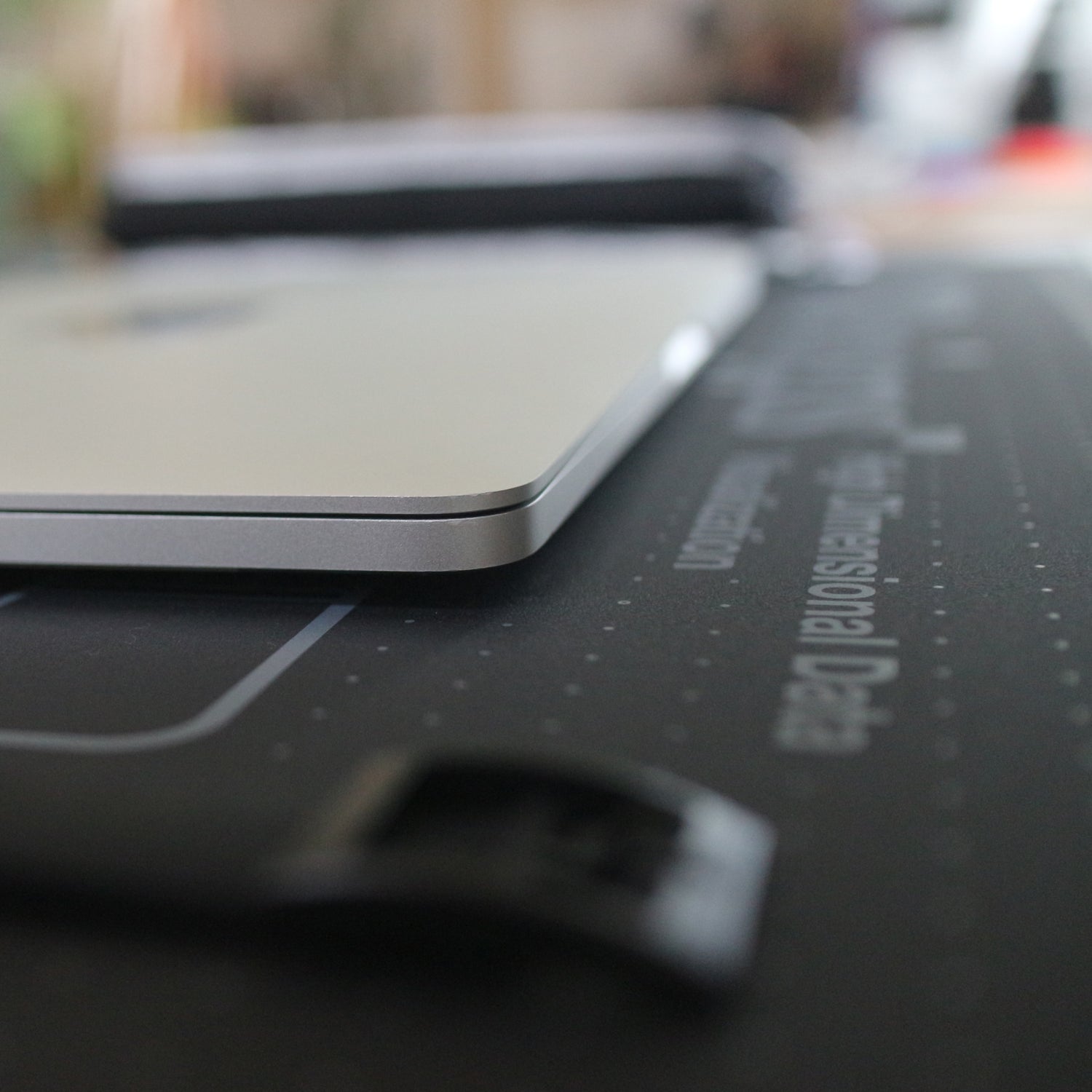 ハイロックデザインオフィス用に開発した特大のデスクマット。デザインという職業柄、日常的に机の上で作業や工作を行っていて、その度にカッターマットを出したりしまったりするのは面倒くさいと思い、だったら机ごとマットにしてしまえというのが発想の起点。もともとは86cm x 86cmという超特大サイズで、限定発売で即完売となりましたがその一方でもう少し小さいものが欲しいという声をたくさん頂き商品化したのがこのハーフサイズ(正確には30%)の特大デスクマット。製作はMIWAX。