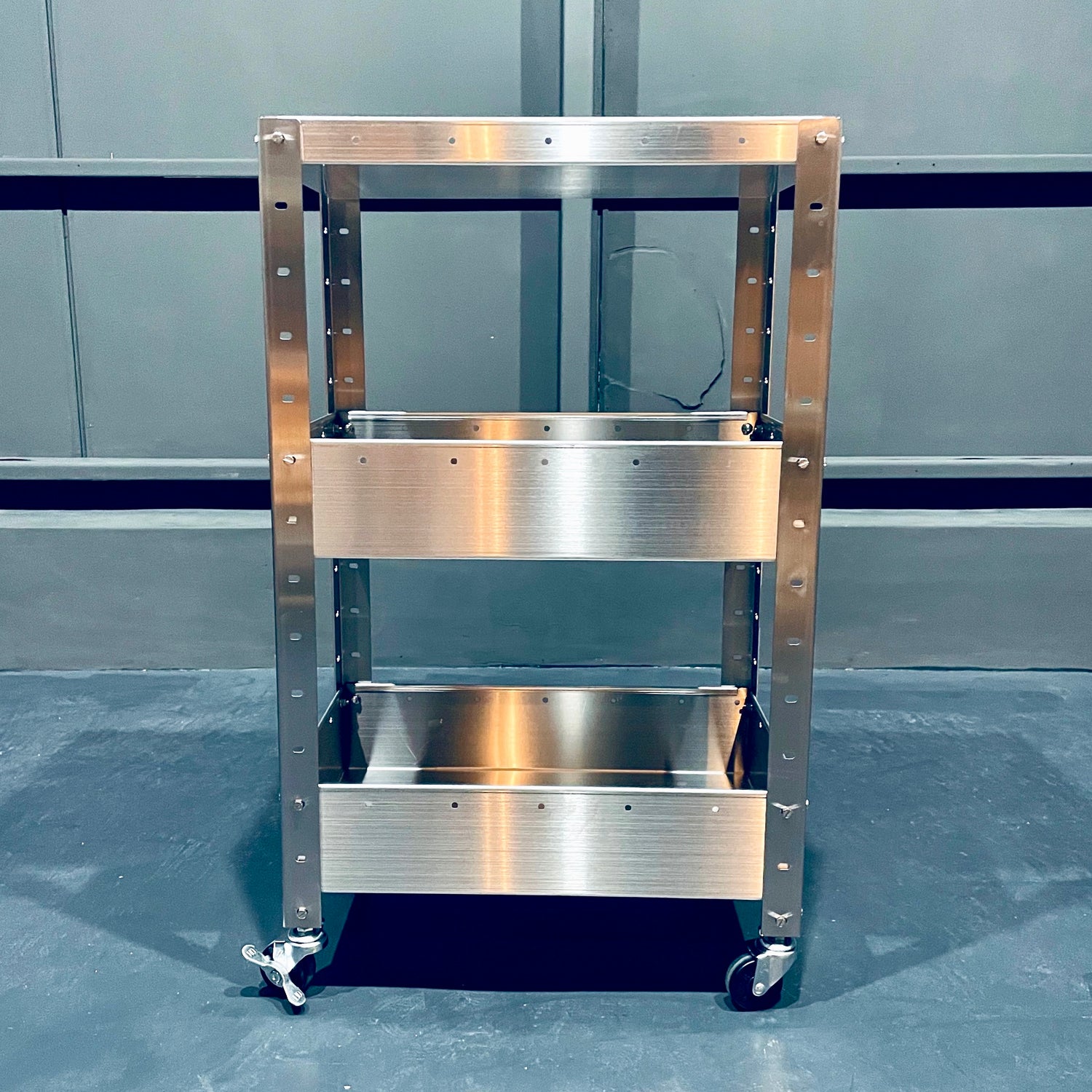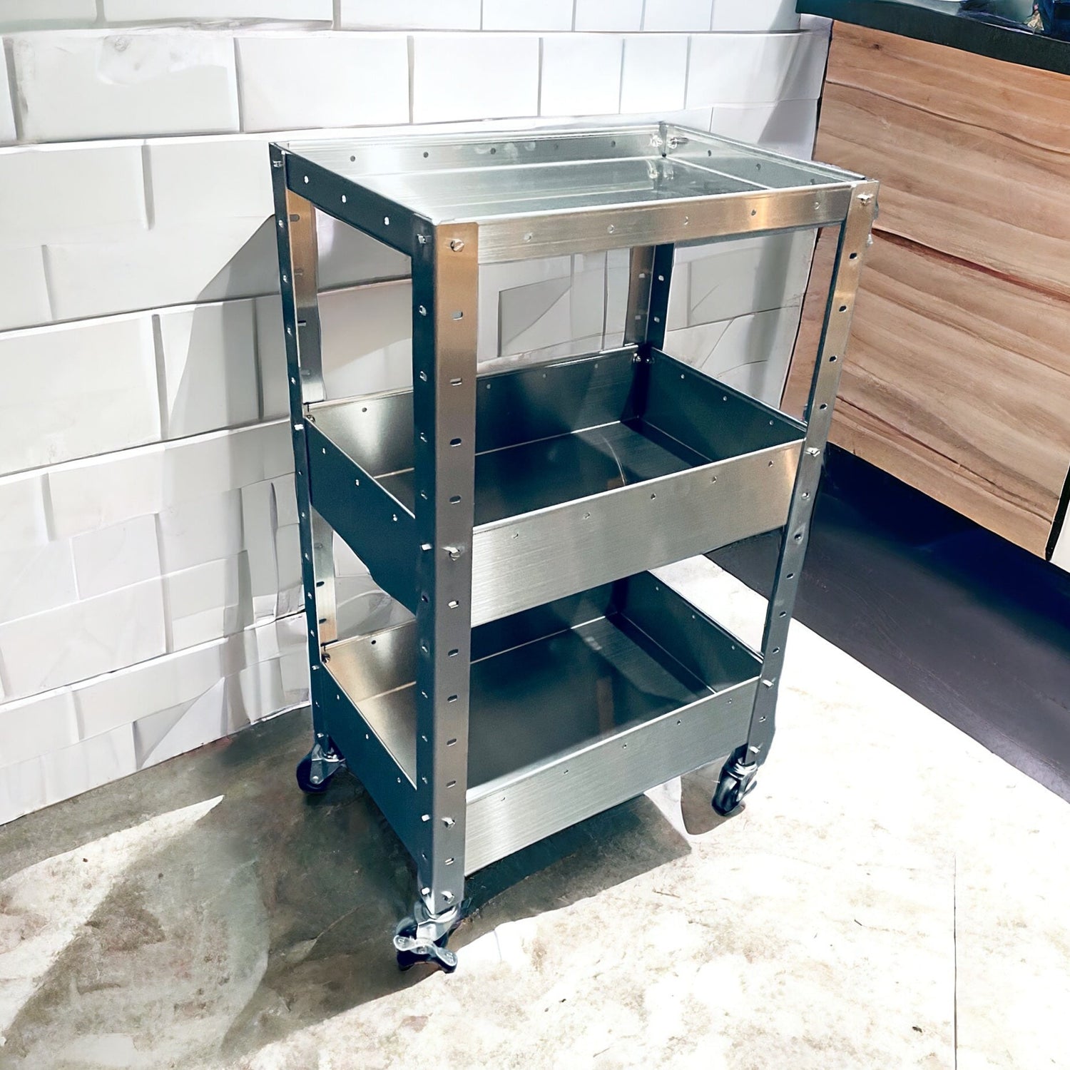 深さのあるプレートを使用したシンプルなワゴンです。お客様にて組み立てを行なっていただく商品です。