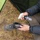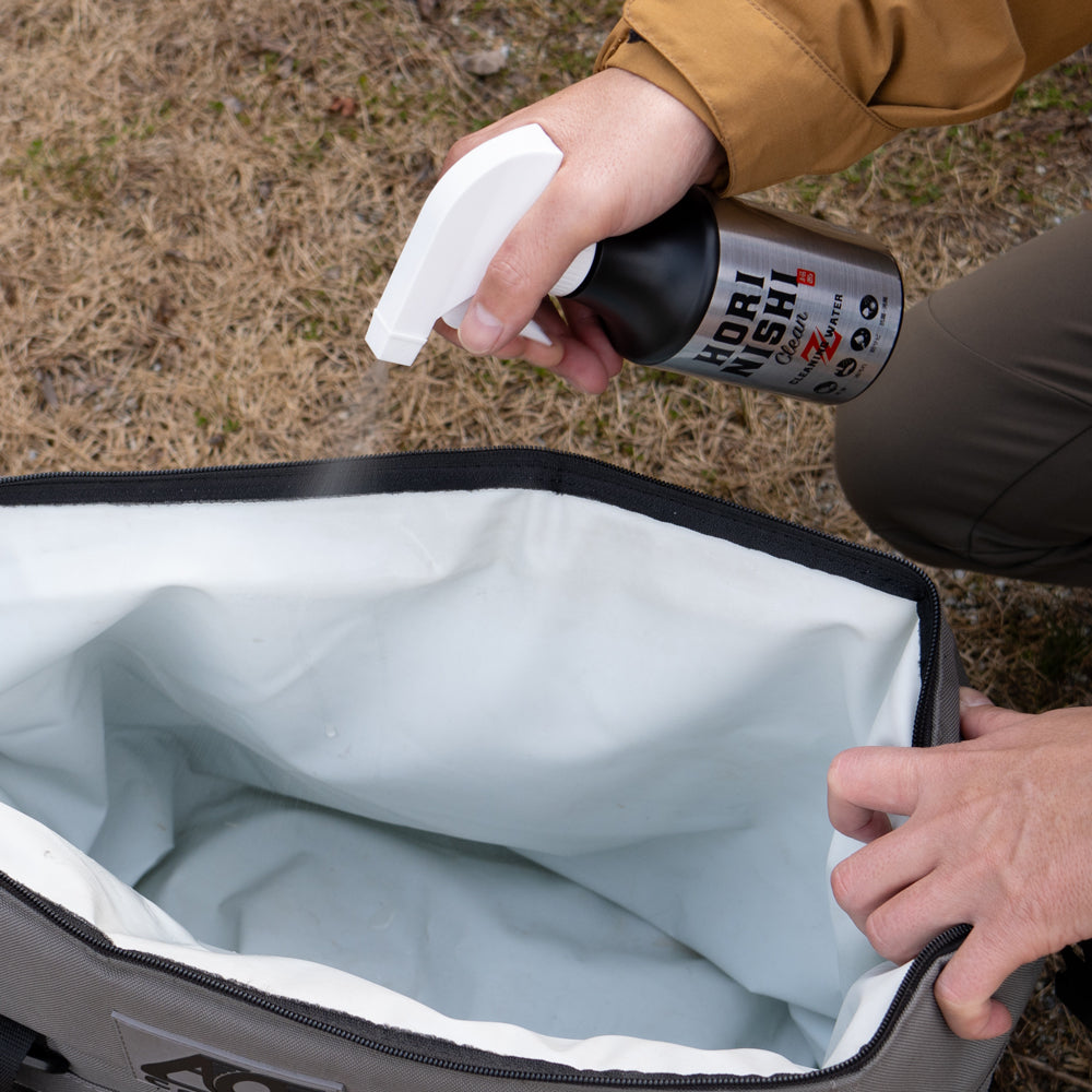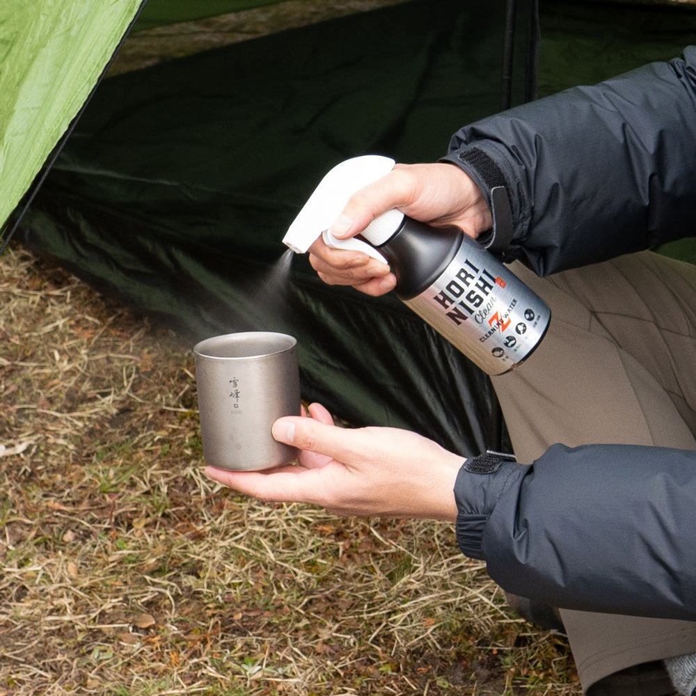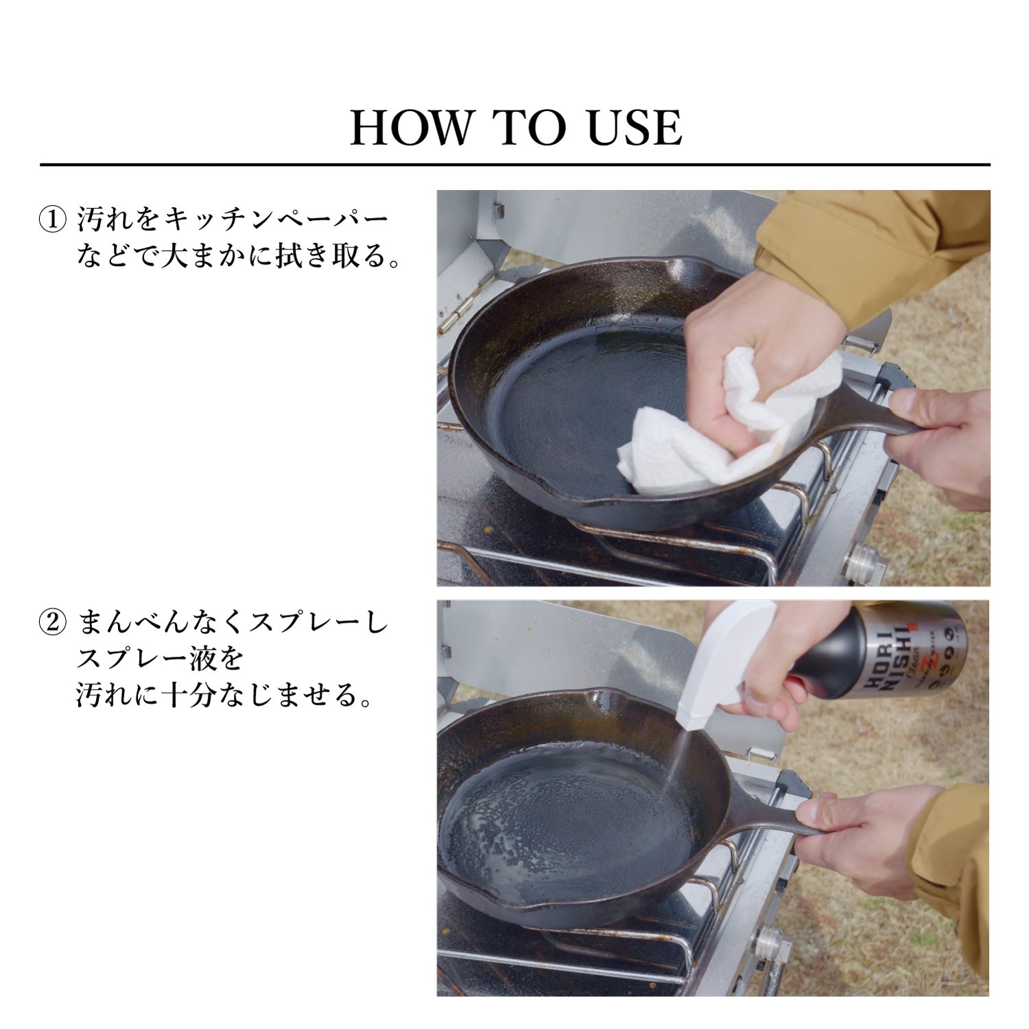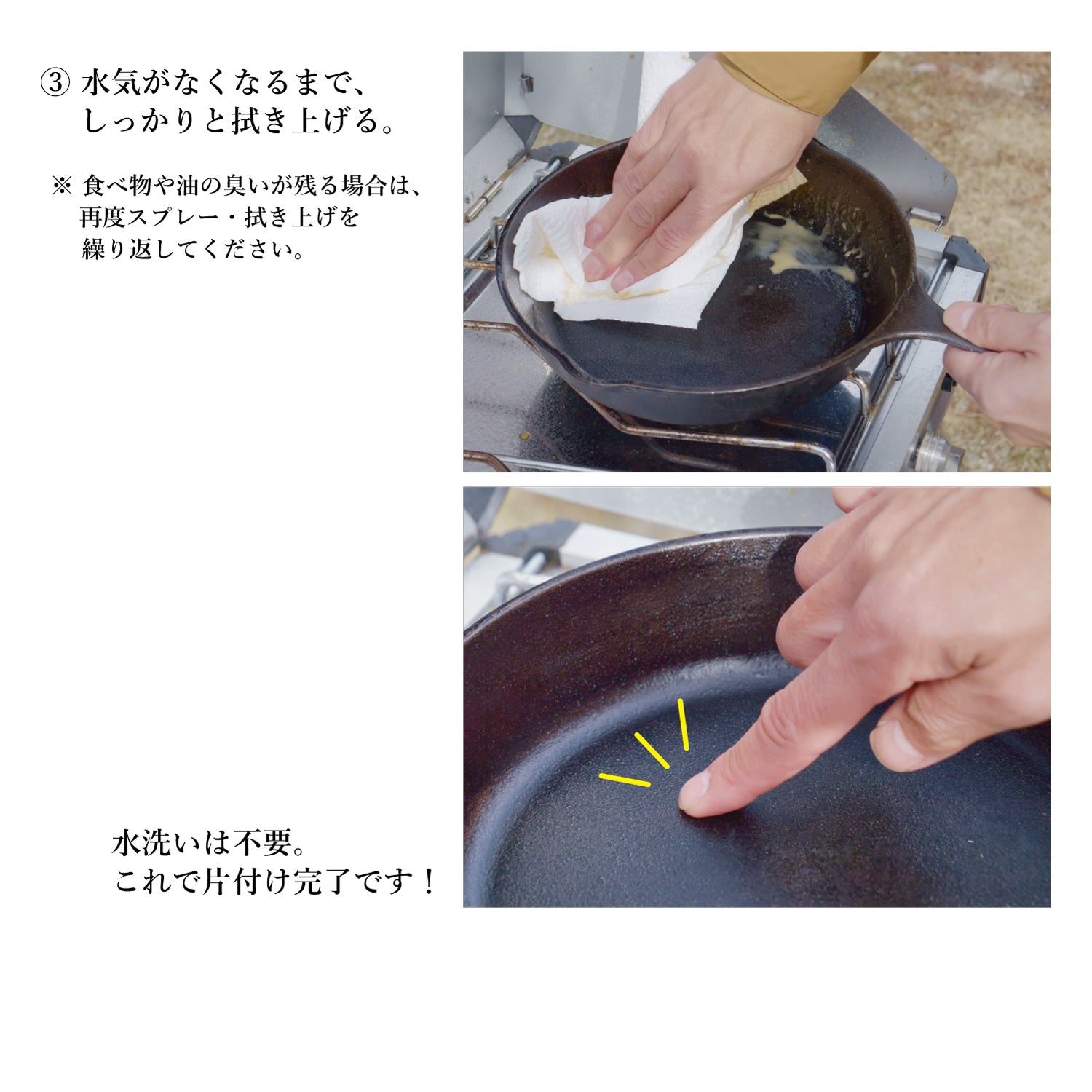 アウトドアシーンで水の確保が難しい時、洗剤を使用できない時、また災害時にも食器やダッチオーブン等の調理器具に吹きかけて拭き取るだけで油汚れを落とし、鉄製品に使用した際は防錆効果まで発揮します。食器を水洗い場まで運ぶ手間が省けるだけでなく、手を水で濡らすこともない為、冬場にも重宝していただけます。