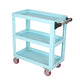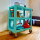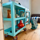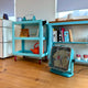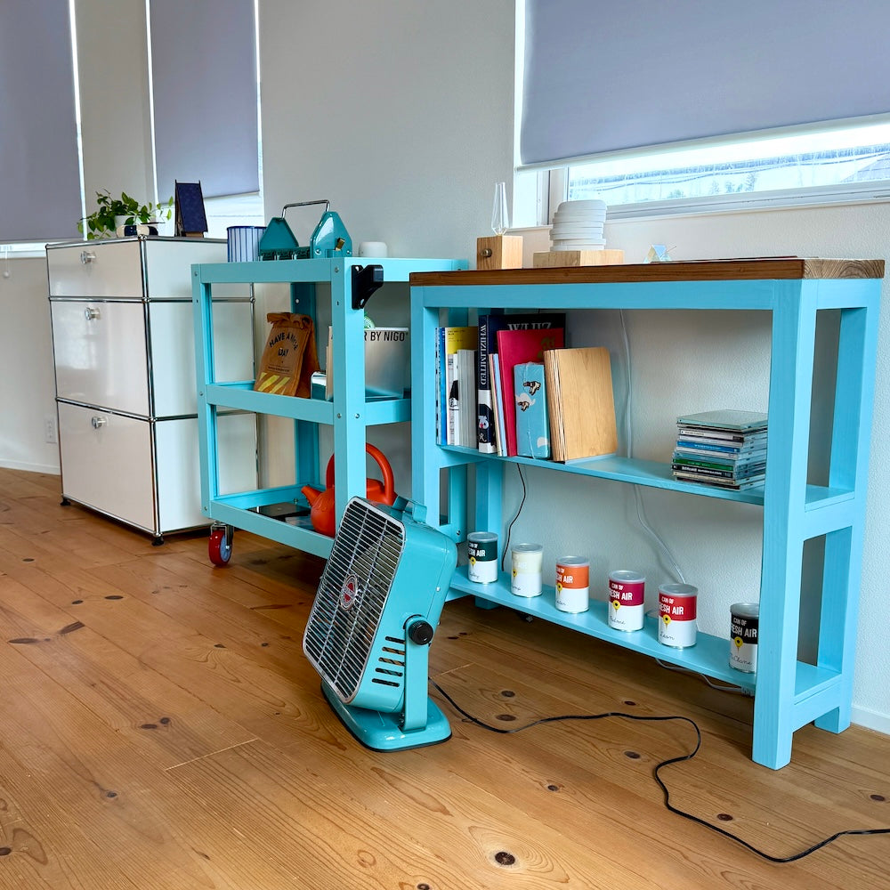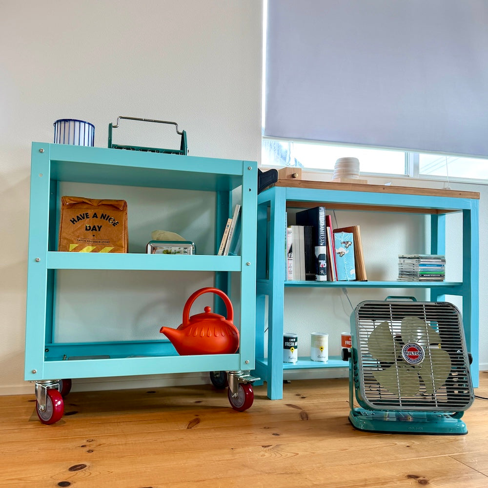 新居に迎えたサックスブルーのワゴン、やっぱり色味が最高でした。リビングでサイドボード的に使っているんですが、シンプルな作りでちょっと無骨。でも、この色がすべてを柔らかくしてくれる。キャスターの赤も絶妙なアクセントに。何を入れても“それっぽく”見せてくれるし、グレイグリーンのサーキュレーターと並べれば、そこはもう“見せたくなる場所”。ただの収納のはずが、部屋の一角にちょっとした物語ができました。