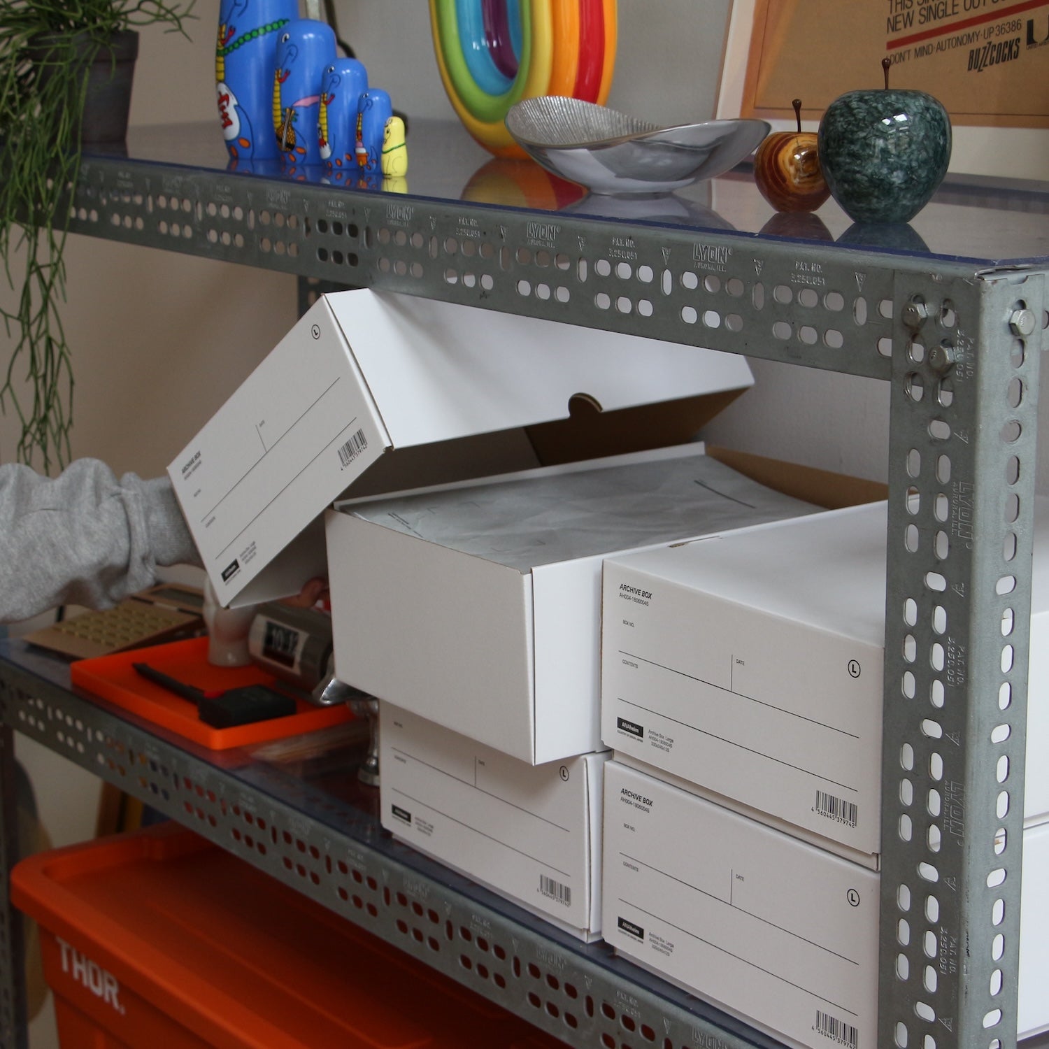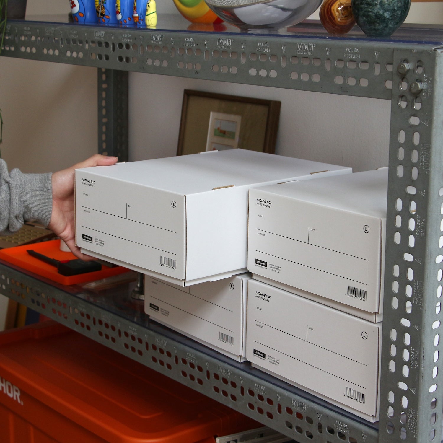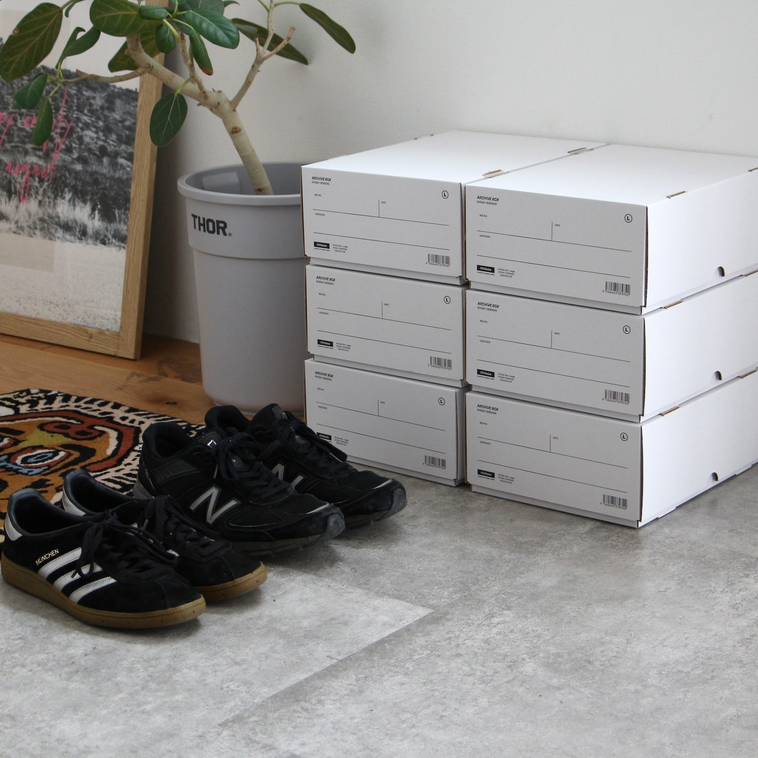 バンカーズボックスの小さい版。この程よいサイズがとても使い勝手がいい。書類でいうとA4サイズ。コピー用紙をストックしたり、仕事の書類をアーカイブしたり。それからスニーカーがピッタリと入る。スニーカーの箱はブランドによってデザインや微妙に大きさが違うのですべてこの箱に入れ替えて玄関もしくは下駄箱の中にに積み上げる。キッチンではコーヒーのフィルターなどの整理に使う。と、このように様々な使い方ができるアーカイブボックス。