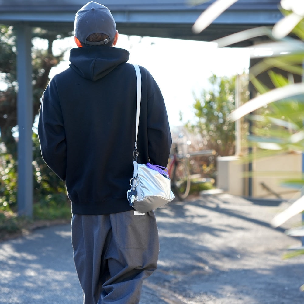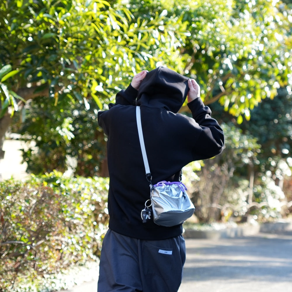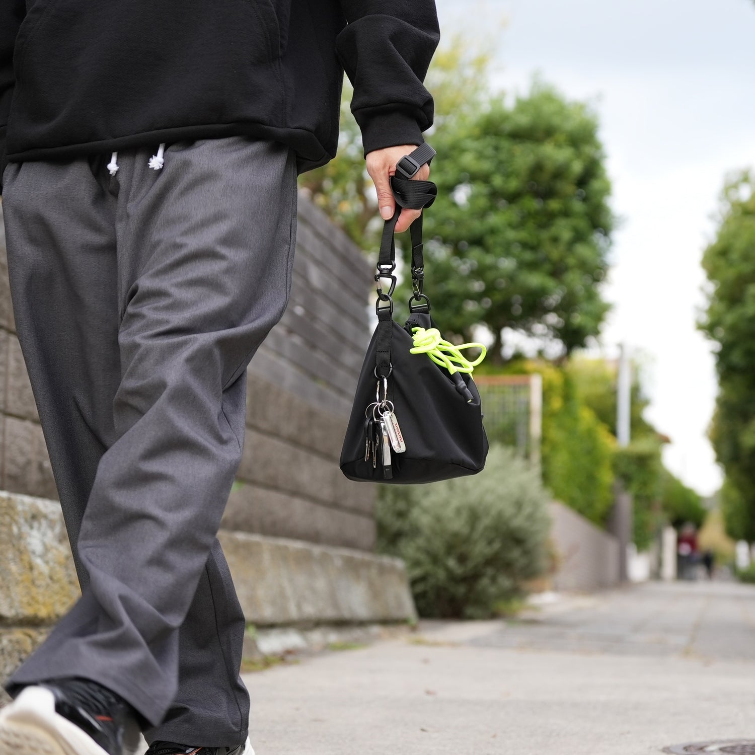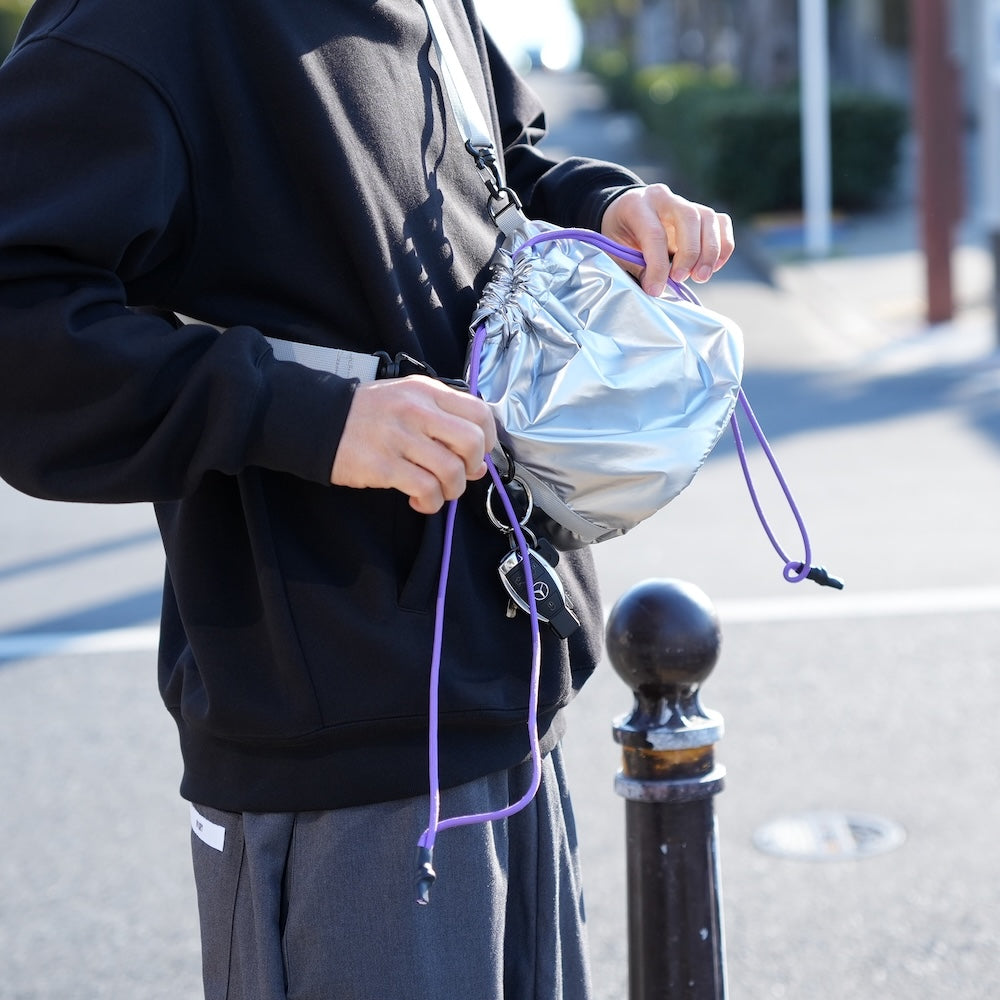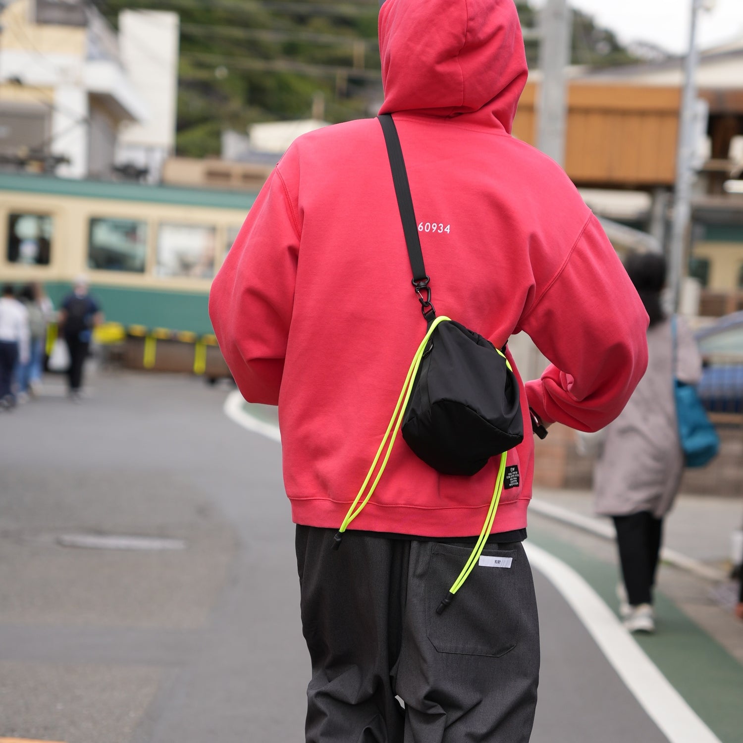 背負った時に可愛く見えるサイズ感と、ちゃんと物が入る実用性。このバランスを追求して、理想の巾着ショルダーが完成しました。ずーーっと人気の“メンズが持っても可愛い巾着バッグシリーズ”。すっかり巾着バッグにハマった編集長が、どうしてもオリジナルを作りたいと言い出し、そこから長かった…。まず、サイズ感にめちゃめちゃこだわりました。何度も何度もサンプルを重ねて辿り着いた、このバランス。大きすぎず、小さすぎず。小さいと収納力がなくなるし、大きいと背負ったときに可愛くないんです。背負った時のビジュアルとある程度物を入れたいという実用性、どちらも妥協せずに仕上げました。ブラック生地には蛍光イエローの、新色のシルバー生地にはパープルのドローコードが、ほどよい遊びを入れてくれてる。背負ったときにアクセントになるし、だらんと垂らしても雰囲気が出る。サイドにはDカンではなくカラビナをつけたので、鍵やキーホルダーをそのまま引っ掛けられます。内ポケット付きで収納力ばっちり。500mlペットボトルだって入っちゃう。メンズが持つと可愛くてかっこいい、女性が持つとスタイリッシュ。THE 巾着ショルダー、マジで推します。