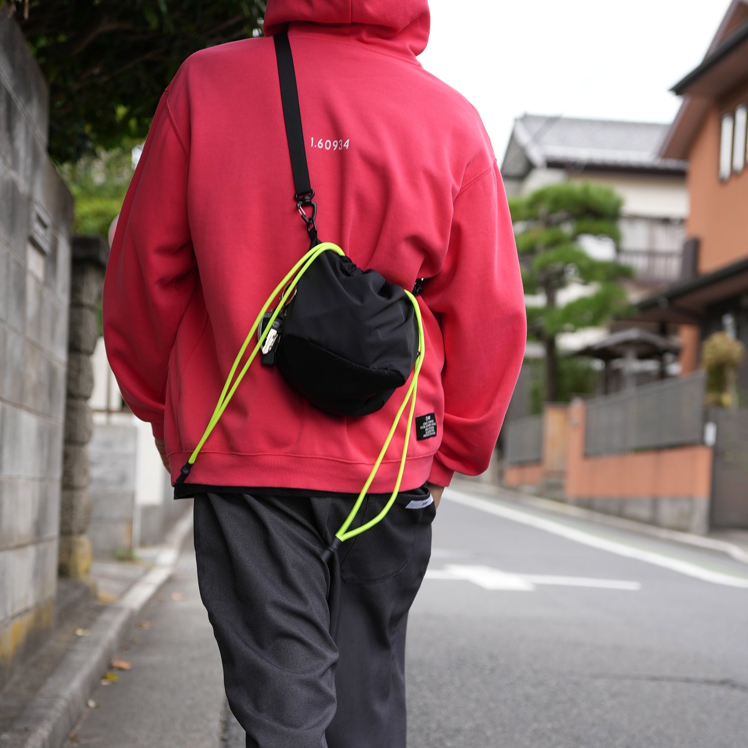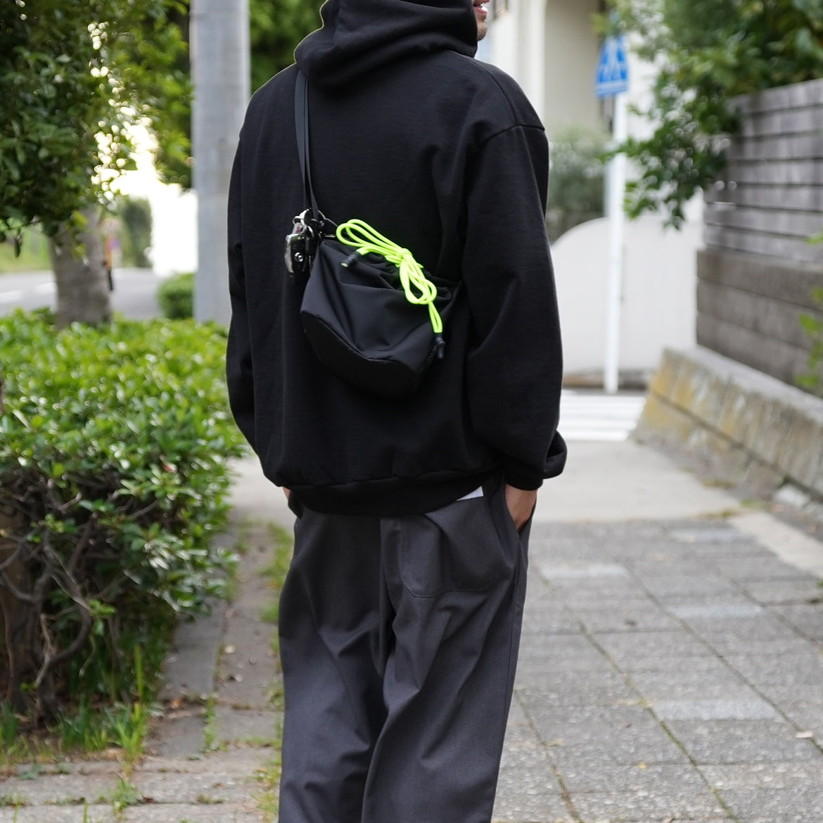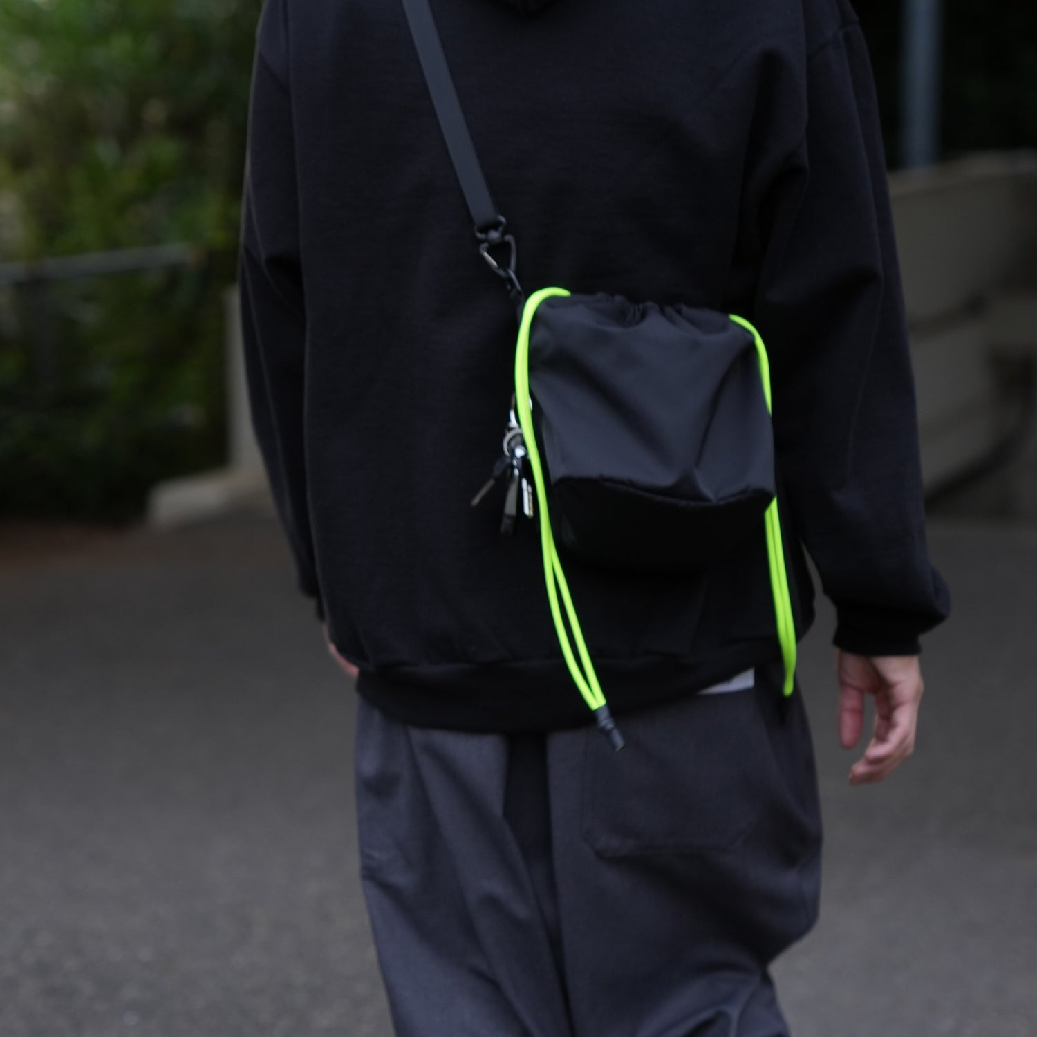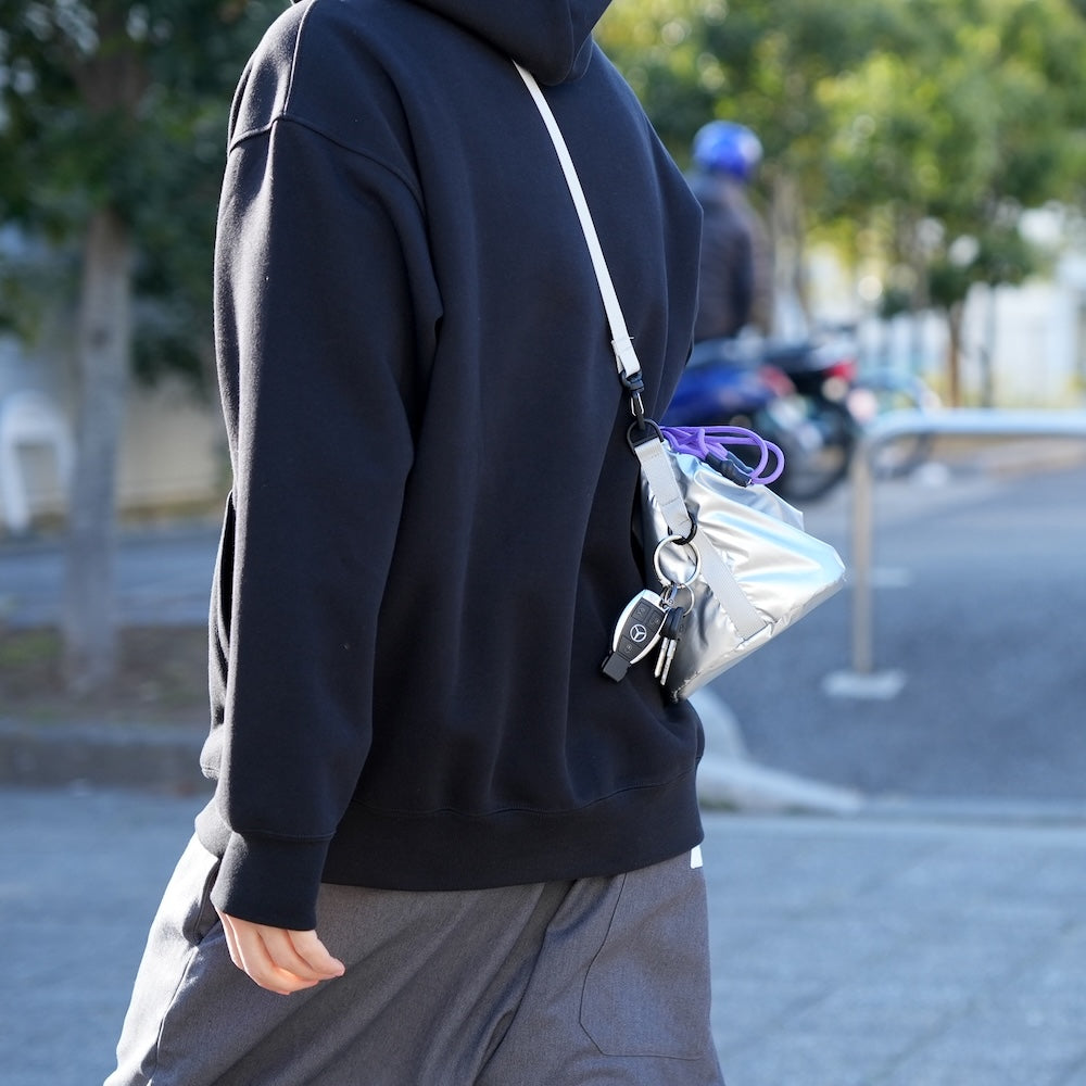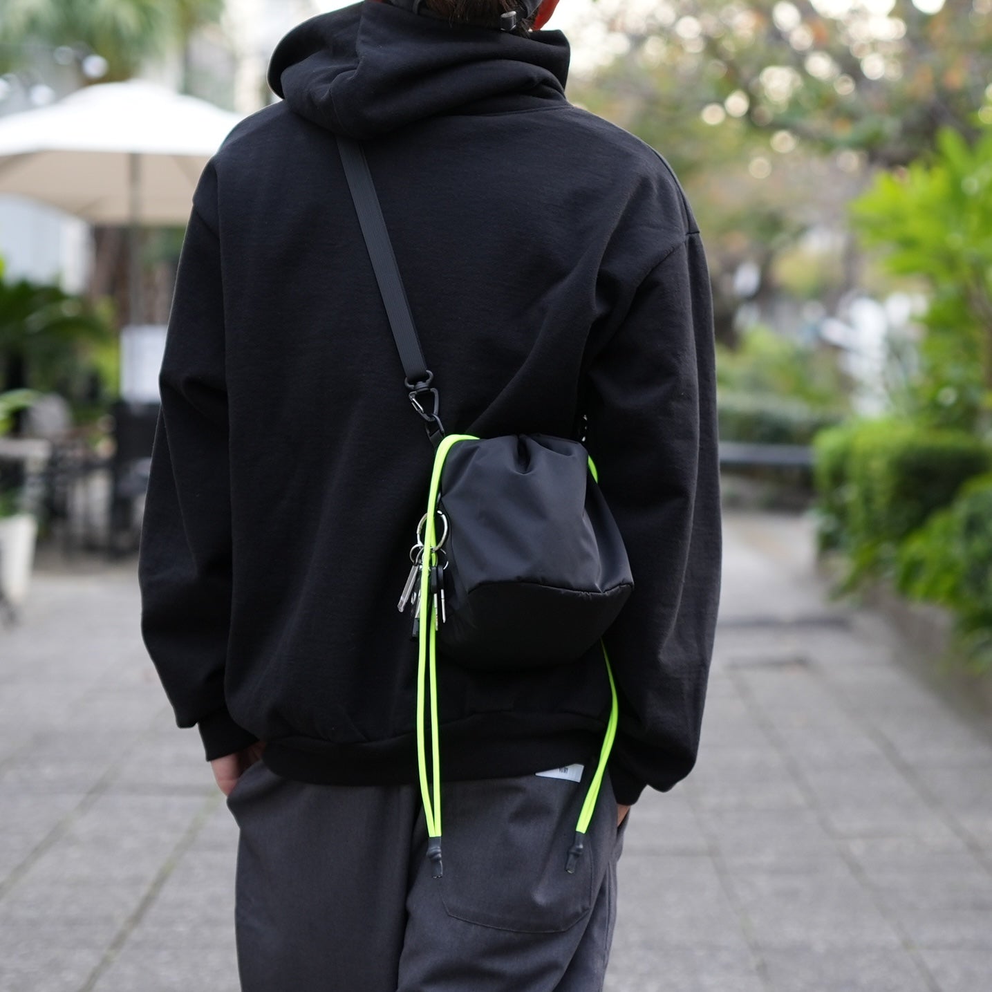 背負った時に可愛く見えるサイズ感と、ちゃんと物が入る実用性。このバランスを追求して、理想の巾着ショルダーが完成しました。ずーーっと人気の“メンズが持っても可愛い巾着バッグシリーズ”。すっかり巾着バッグにハマった編集長が、どうしてもオリジナルを作りたいと言い出し、そこから長かった…。まず、サイズ感にめちゃめちゃこだわりました。何度も何度もサンプルを重ねて辿り着いた、このバランス。大きすぎず、小さすぎず。小さいと収納力がなくなるし、大きいと背負ったときに可愛くないんです。背負った時のビジュアルとある程度物を入れたいという実用性、どちらも妥協せずに仕上げました。ブラック生地には蛍光イエローの、新色のシルバー生地にはパープルのドローコードが、ほどよい遊びを入れてくれてる。背負ったときにアクセントになるし、だらんと垂らしても雰囲気が出る。サイドにはDカンではなくカラビナをつけたので、鍵やキーホルダーをそのまま引っ掛けられます。内ポケット付きで収納力ばっちり。500mlペットボトルだって入っちゃう。メンズが持つと可愛くてかっこいい、女性が持つとスタイリッシュ。THE 巾着ショルダー、マジで推します。