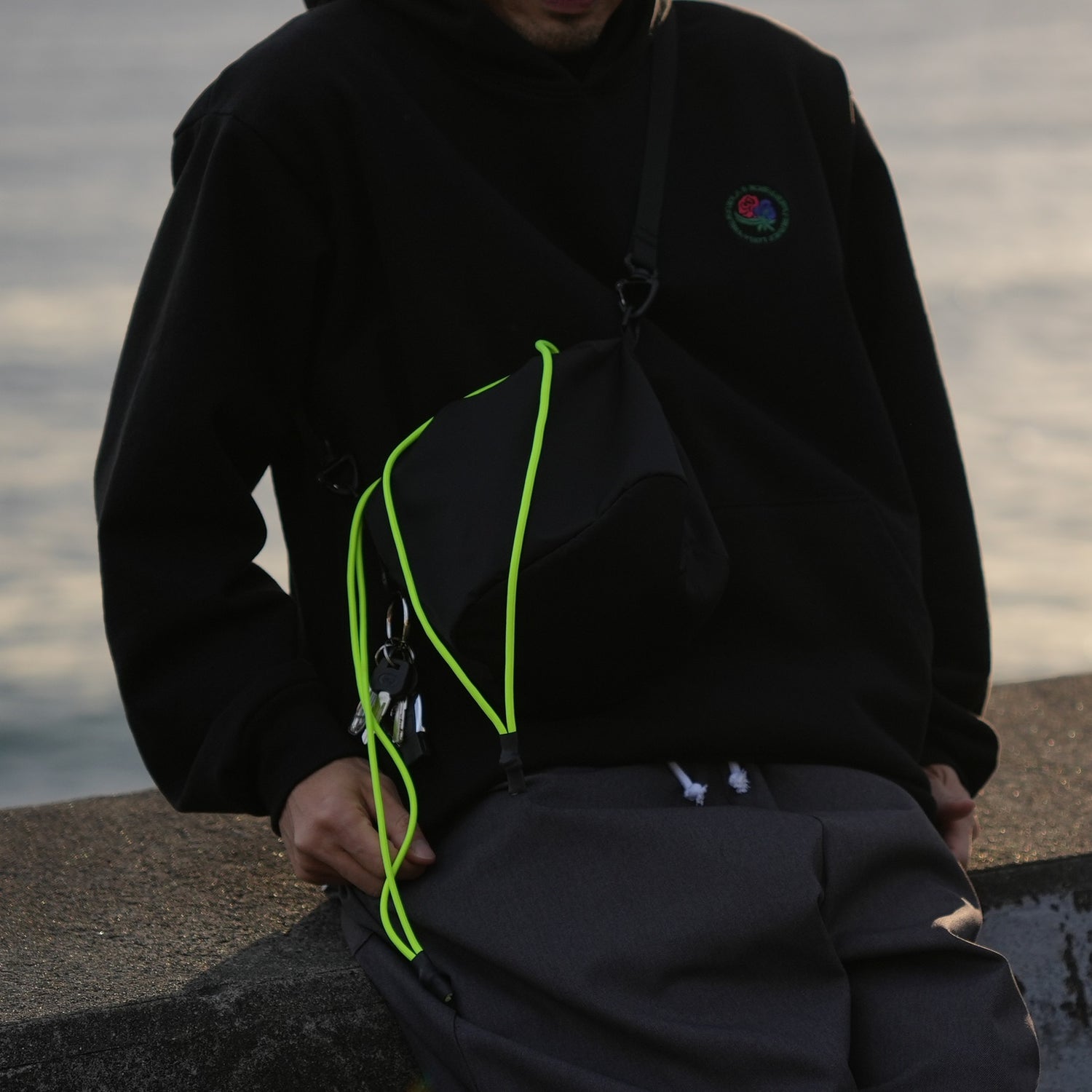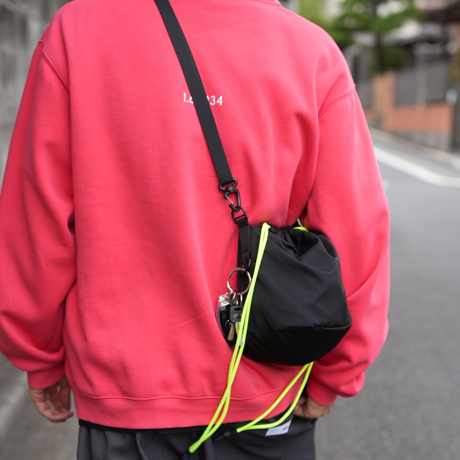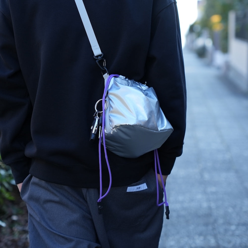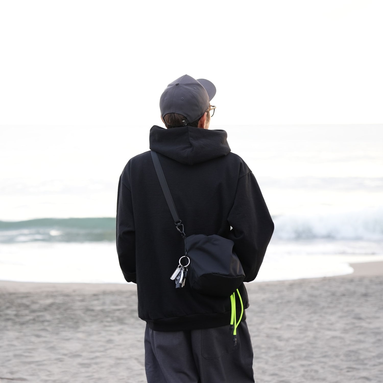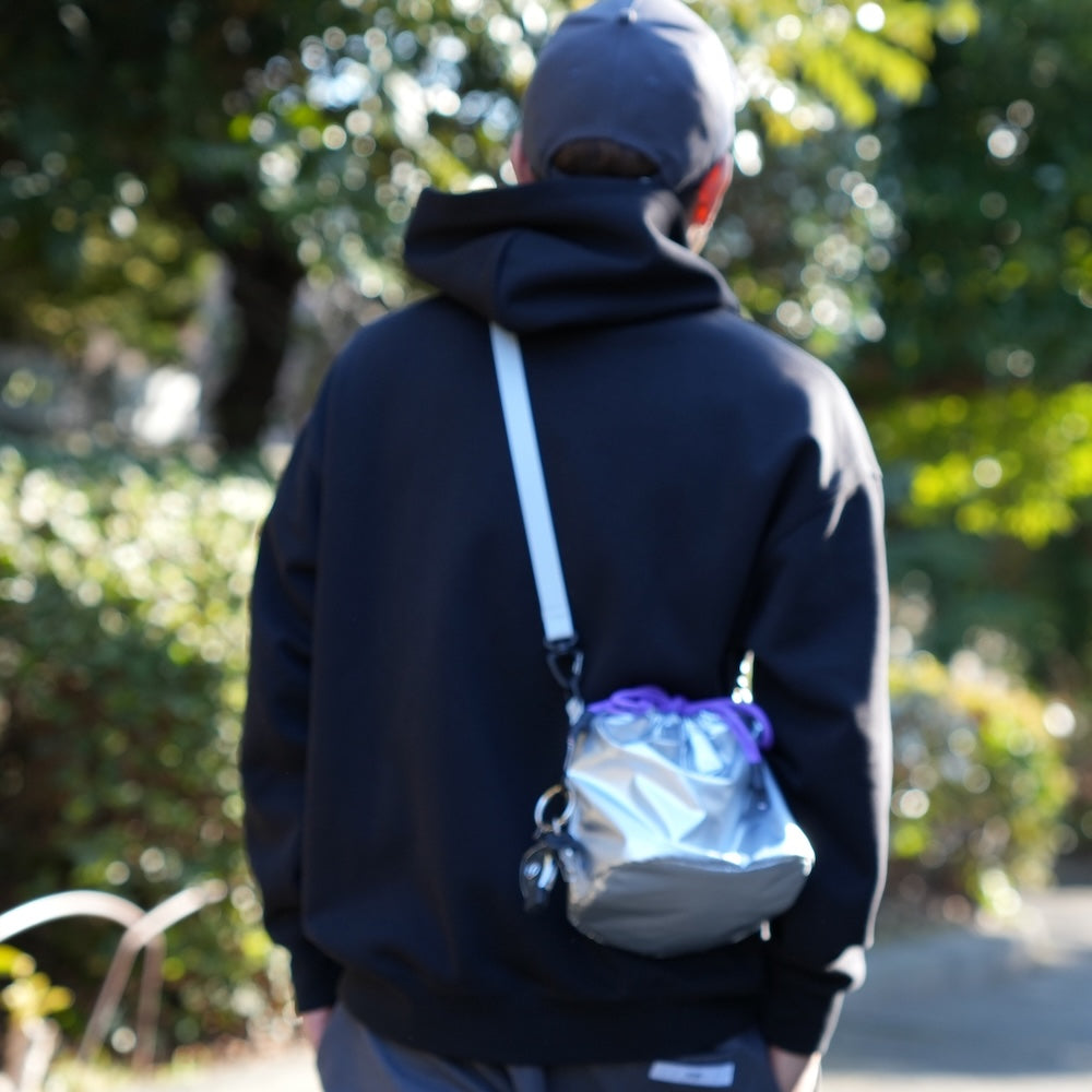 背負った時に可愛く見えるサイズ感と、ちゃんと物が入る実用性。このバランスを追求して、理想の巾着ショルダーが完成しました。ずーーっと人気の“メンズが持っても可愛い巾着バッグシリーズ”。すっかり巾着バッグにハマった編集長が、どうしてもオリジナルを作りたいと言い出し、そこから長かった…。まず、サイズ感にめちゃめちゃこだわりました。何度も何度もサンプルを重ねて辿り着いた、このバランス。大きすぎず、小さすぎず。小さいと収納力がなくなるし、大きいと背負ったときに可愛くないんです。背負った時のビジュアルとある程度物を入れたいという実用性、どちらも妥協せずに仕上げました。ブラック生地には蛍光イエローの、新色のシルバー生地にはパープルのドローコードが、ほどよい遊びを入れてくれてる。背負ったときにアクセントになるし、だらんと垂らしても雰囲気が出る。サイドにはDカンではなくカラビナをつけたので、鍵やキーホルダーをそのまま引っ掛けられます。内ポケット付きで収納力ばっちり。500mlペットボトルだって入っちゃう。メンズが持つと可愛くてかっこいい、女性が持つとスタイリッシュ。THE 巾着ショルダー、マジで推します。
