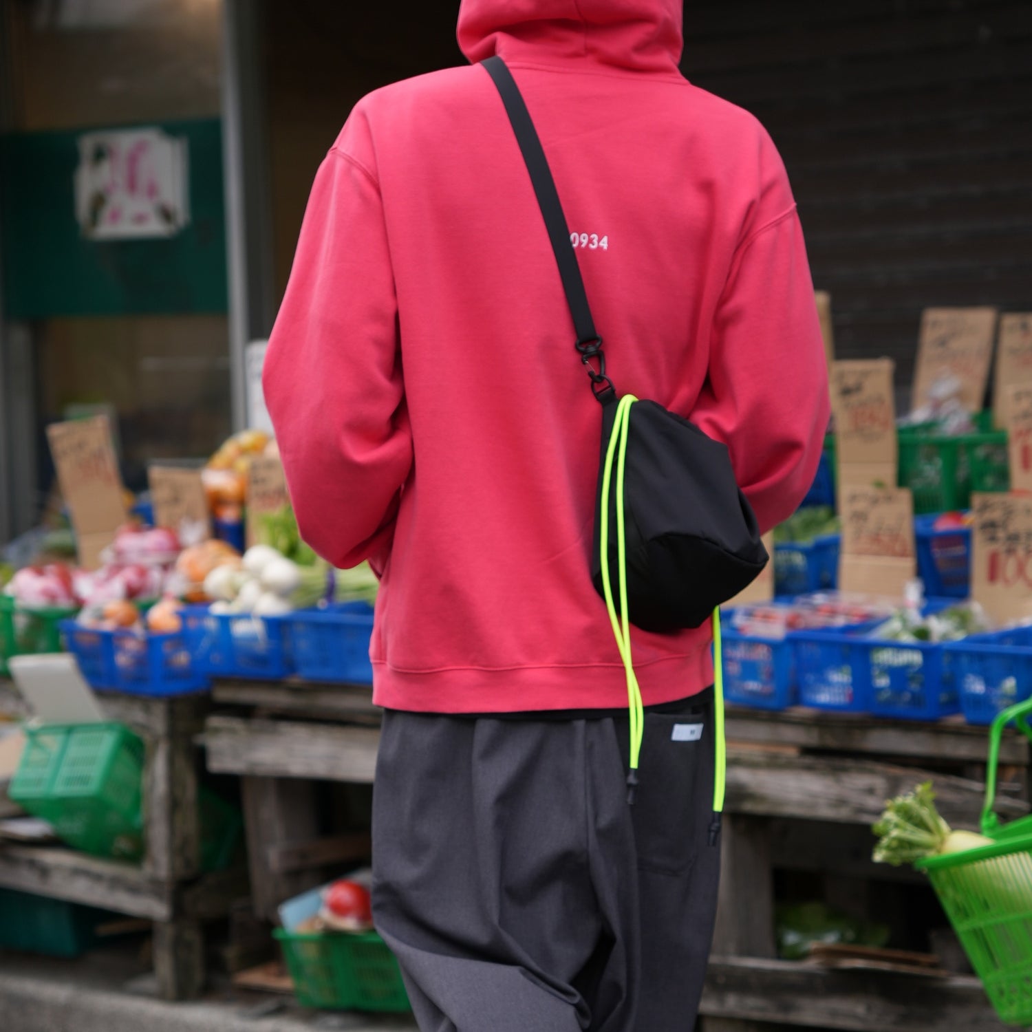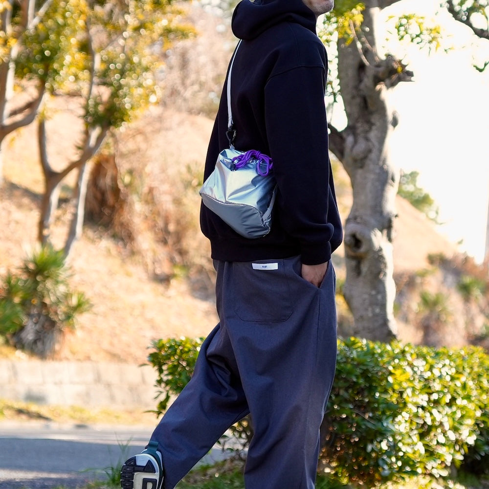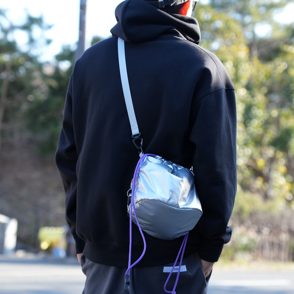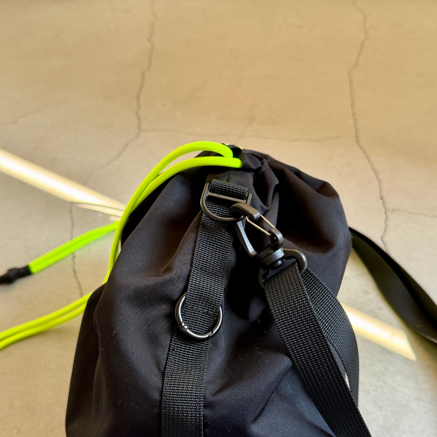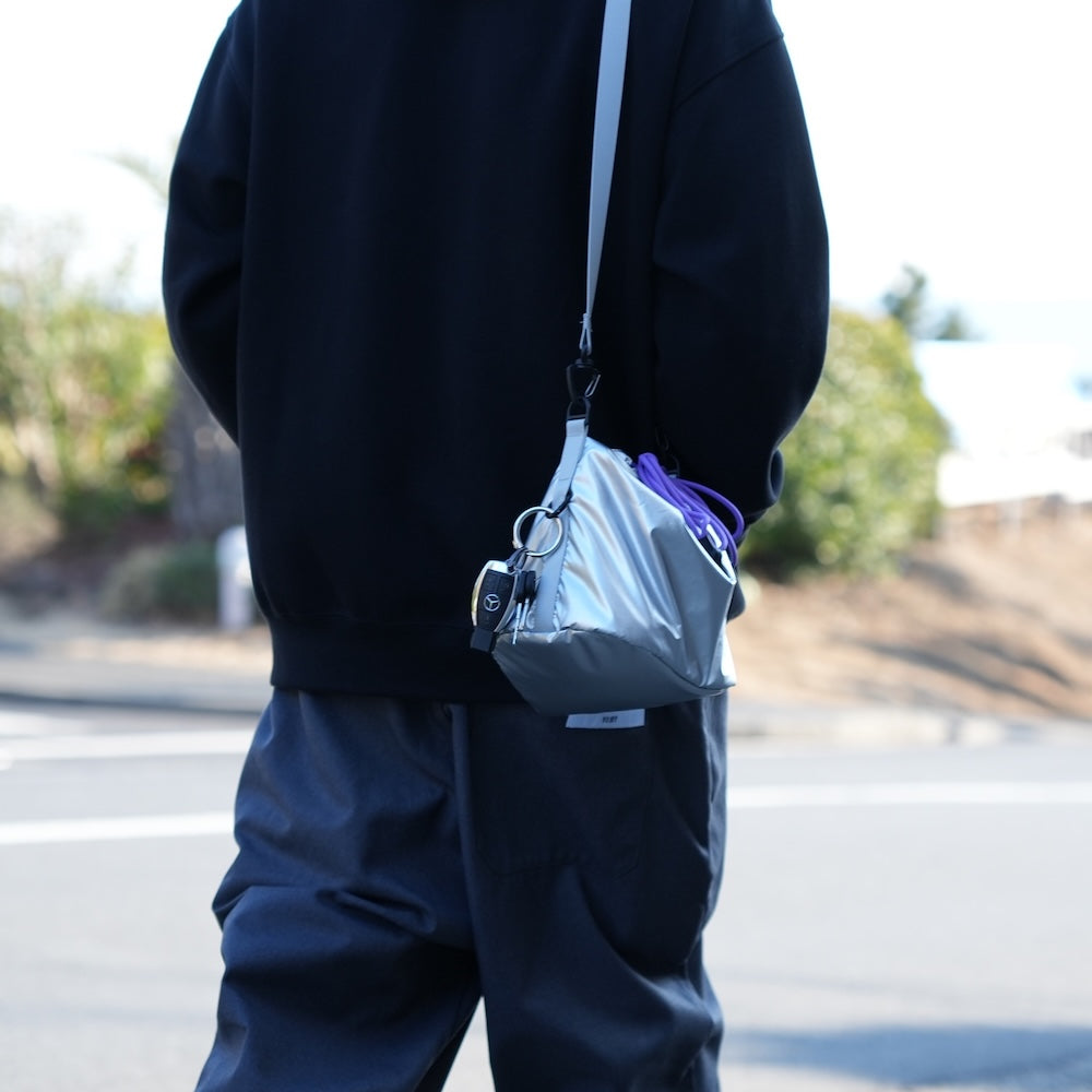 背負った時に可愛く見えるサイズ感と、ちゃんと物が入る実用性。このバランスを追求して、理想の巾着ショルダーが完成しました。ずーーっと人気の“メンズが持っても可愛い巾着バッグシリーズ”。すっかり巾着バッグにハマった編集長が、どうしてもオリジナルを作りたいと言い出し、そこから長かった…。まず、サイズ感にめちゃめちゃこだわりました。何度も何度もサンプルを重ねて辿り着いた、このバランス。大きすぎず、小さすぎず。小さいと収納力がなくなるし、大きいと背負ったときに可愛くないんです。背負った時のビジュアルとある程度物を入れたいという実用性、どちらも妥協せずに仕上げました。ブラック生地には蛍光イエローの、新色のシルバー生地にはパープルのドローコードが、ほどよい遊びを入れてくれてる。背負ったときにアクセントになるし、だらんと垂らしても雰囲気が出る。サイドにはDカンではなくカラビナをつけたので、鍵やキーホルダーをそのまま引っ掛けられます。内ポケット付きで収納力ばっちり。500mlペットボトルだって入っちゃう。メンズが持つと可愛くてかっこいい、女性が持つとスタイリッシュ。THE 巾着ショルダー、マジで推します。