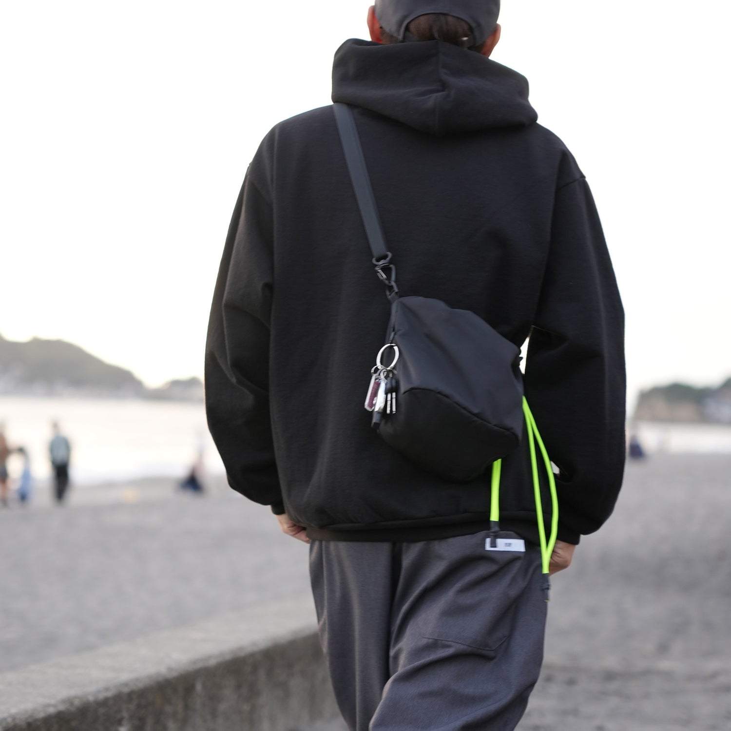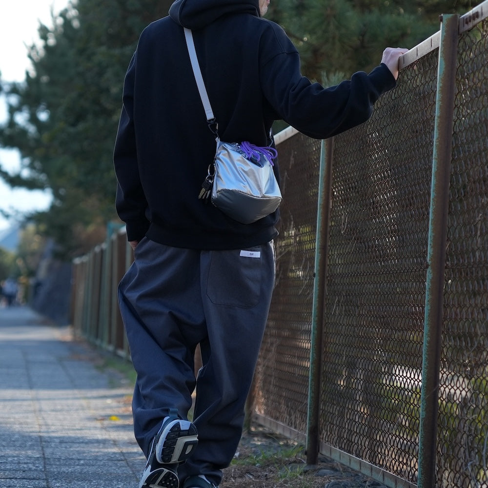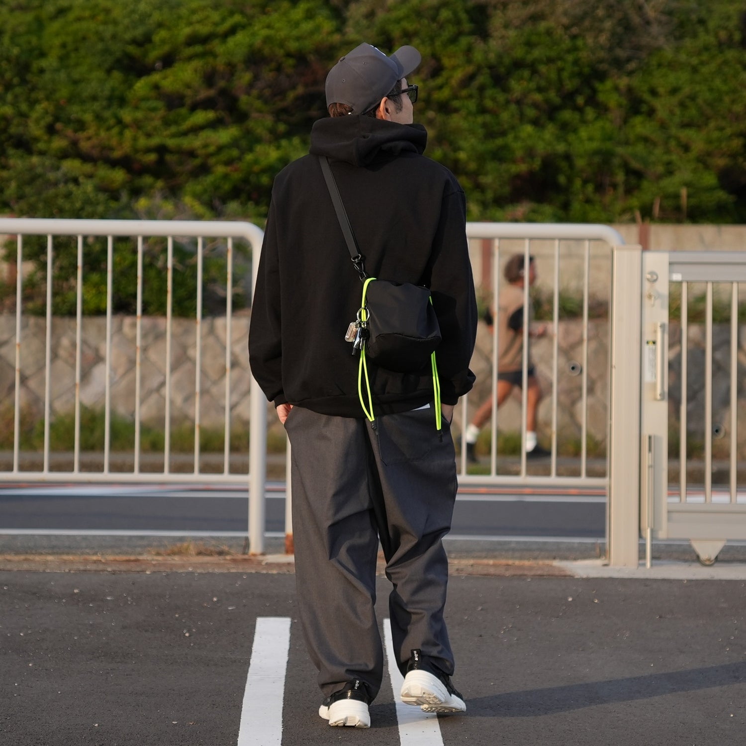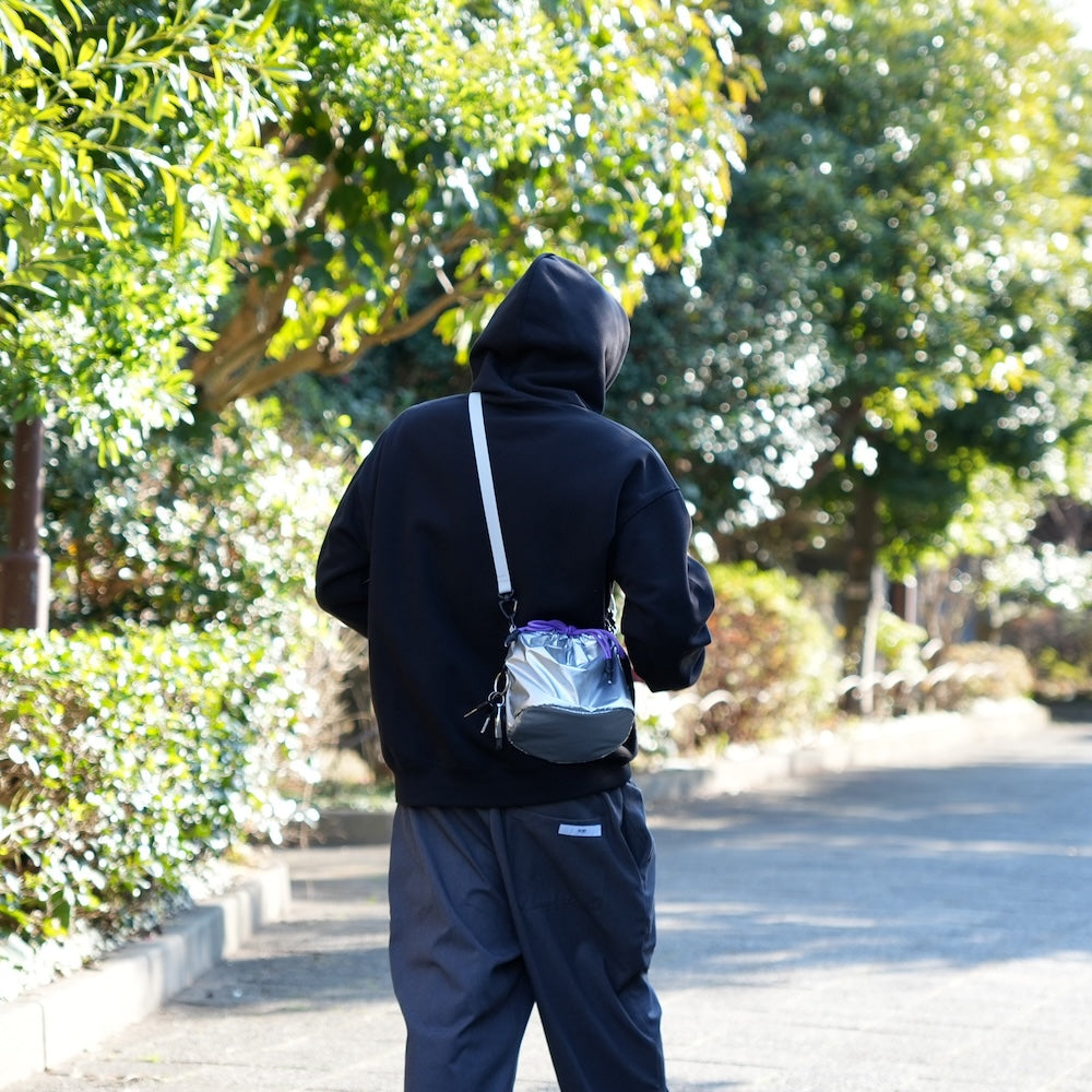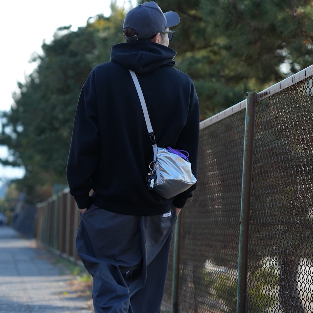 背負った時に可愛く見えるサイズ感と、ちゃんと物が入る実用性。このバランスを追求して、理想の巾着ショルダーが完成しました。ずーーっと人気の“メンズが持っても可愛い巾着バッグシリーズ”。すっかり巾着バッグにハマった編集長が、どうしてもオリジナルを作りたいと言い出し、そこから長かった…。まず、サイズ感にめちゃめちゃこだわりました。何度も何度もサンプルを重ねて辿り着いた、このバランス。大きすぎず、小さすぎず。小さいと収納力がなくなるし、大きいと背負ったときに可愛くないんです。背負った時のビジュアルとある程度物を入れたいという実用性、どちらも妥協せずに仕上げました。ブラック生地には蛍光イエローの、新色のシルバー生地にはパープルのドローコードが、ほどよい遊びを入れてくれてる。背負ったときにアクセントになるし、だらんと垂らしても雰囲気が出る。サイドにはDカンではなくカラビナをつけたので、鍵やキーホルダーをそのまま引っ掛けられます。内ポケット付きで収納力ばっちり。500mlペットボトルだって入っちゃう。メンズが持つと可愛くてかっこいい、女性が持つとスタイリッシュ。THE 巾着ショルダー、マジで推します。