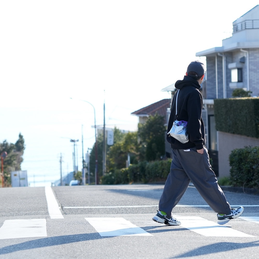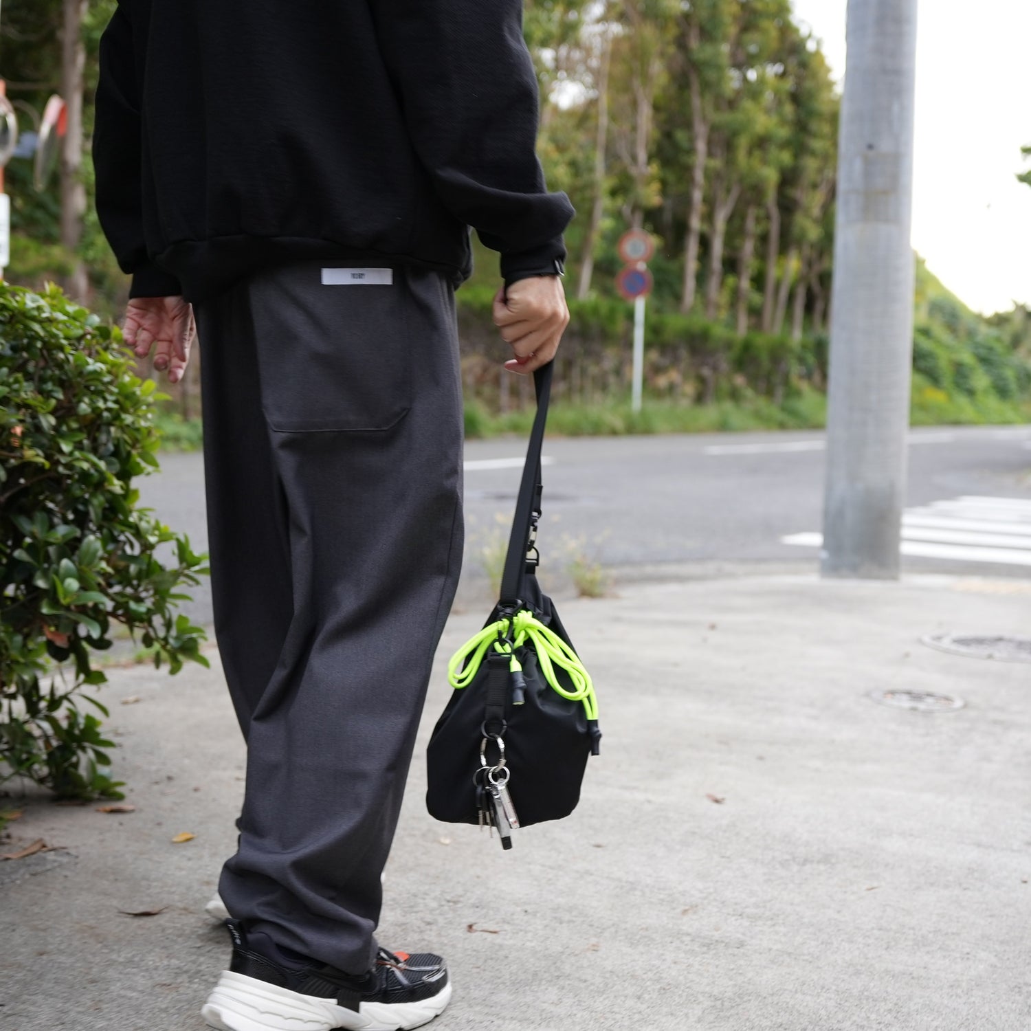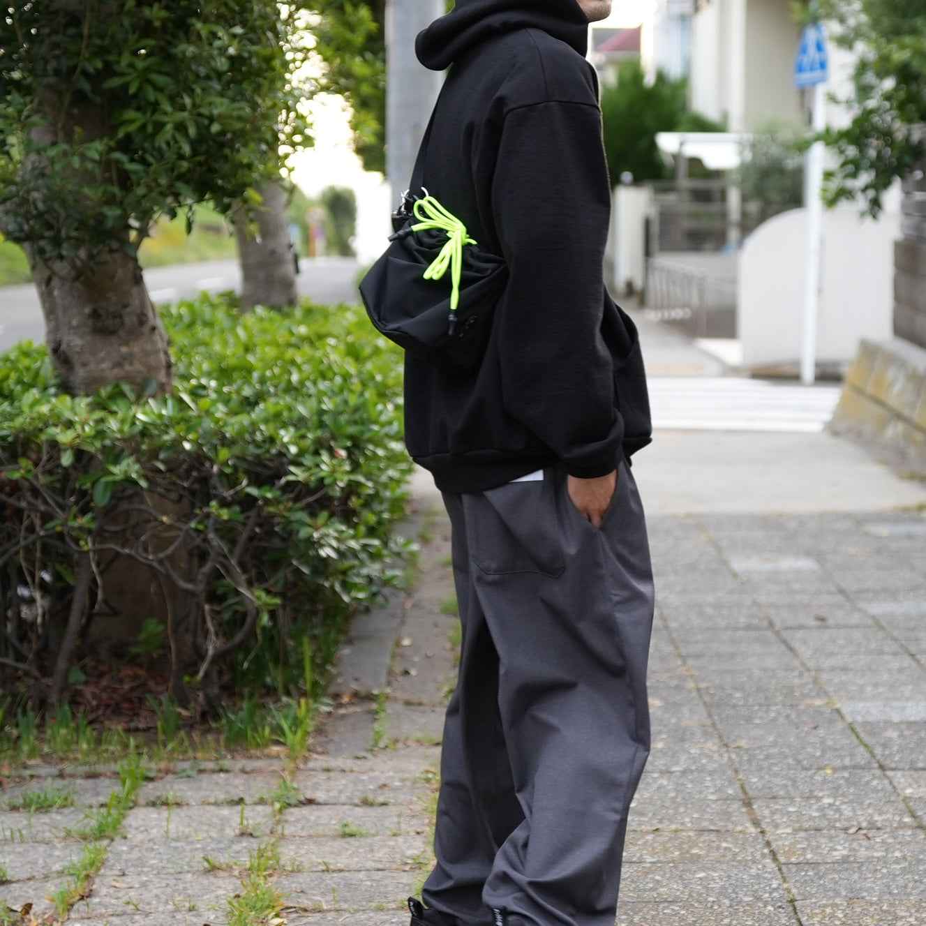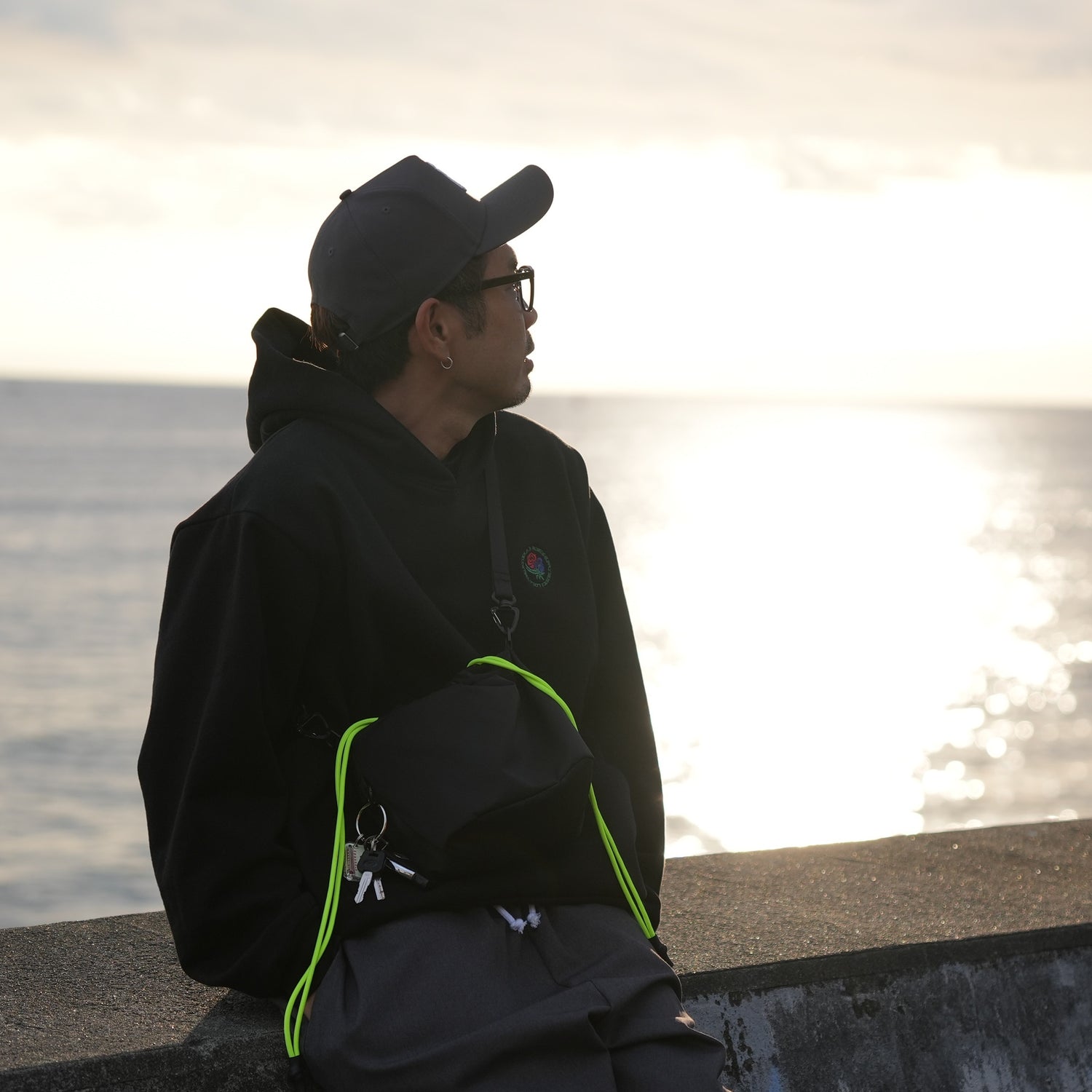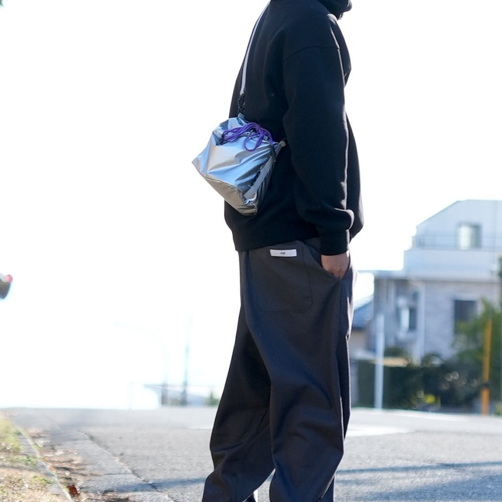 背負った時に可愛く見えるサイズ感と、ちゃんと物が入る実用性。このバランスを追求して、理想の巾着ショルダーが完成しました。ずーーっと人気の“メンズが持っても可愛い巾着バッグシリーズ”。すっかり巾着バッグにハマった編集長が、どうしてもオリジナルを作りたいと言い出し、そこから長かった…。まず、サイズ感にめちゃめちゃこだわりました。何度も何度もサンプルを重ねて辿り着いた、このバランス。大きすぎず、小さすぎず。小さいと収納力がなくなるし、大きいと背負ったときに可愛くないんです。背負った時のビジュアルとある程度物を入れたいという実用性、どちらも妥協せずに仕上げました。ブラック生地には蛍光イエローの、新色のシルバー生地にはパープルのドローコードが、ほどよい遊びを入れてくれてる。背負ったときにアクセントになるし、だらんと垂らしても雰囲気が出る。サイドにはDカンではなくカラビナをつけたので、鍵やキーホルダーをそのまま引っ掛けられます。内ポケット付きで収納力ばっちり。500mlペットボトルだって入っちゃう。メンズが持つと可愛くてかっこいい、女性が持つとスタイリッシュ。THE 巾着ショルダー、マジで推します。