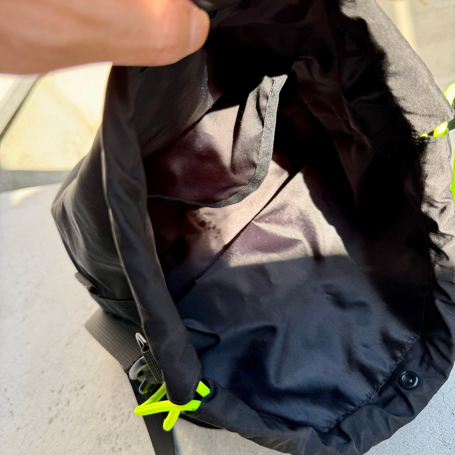 ずっと再販待ってました!素材の質感もいいし、巾着だけど中に仕切りがあるので小物が散らばらないのも機能的。大きさも丁度良いし、やはり蛍光イエローのドローコードがいいアクセントで最悪です!