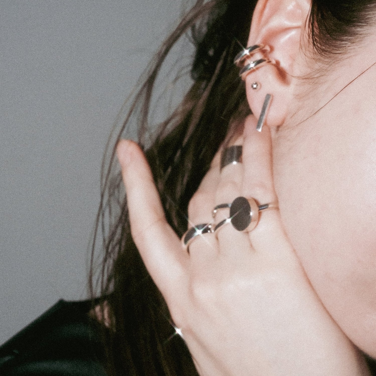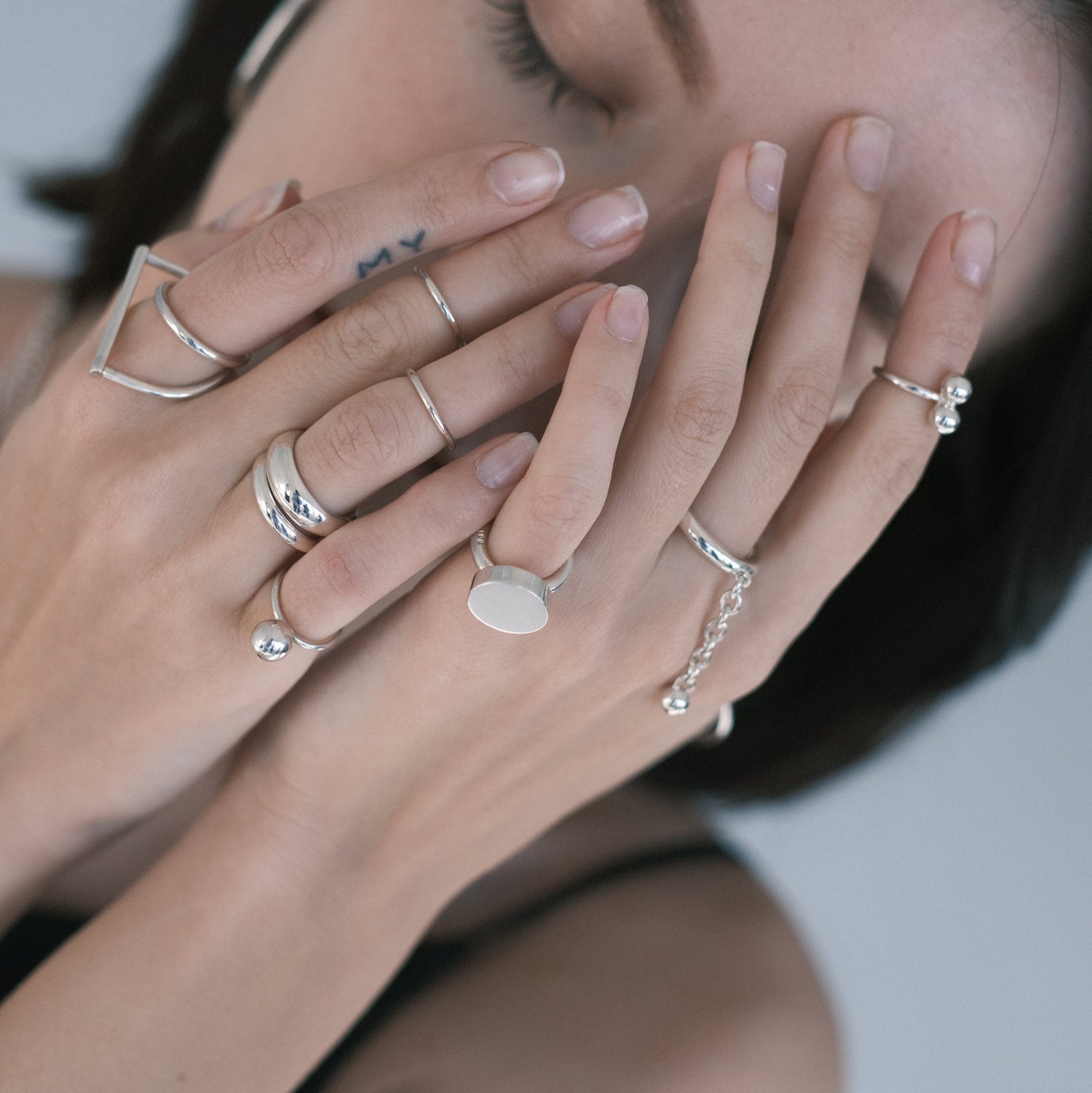 装飾を削ぎ落とした印台リング。厚みのあるトップがコーディネートをひきしめます。ピンキーリング。