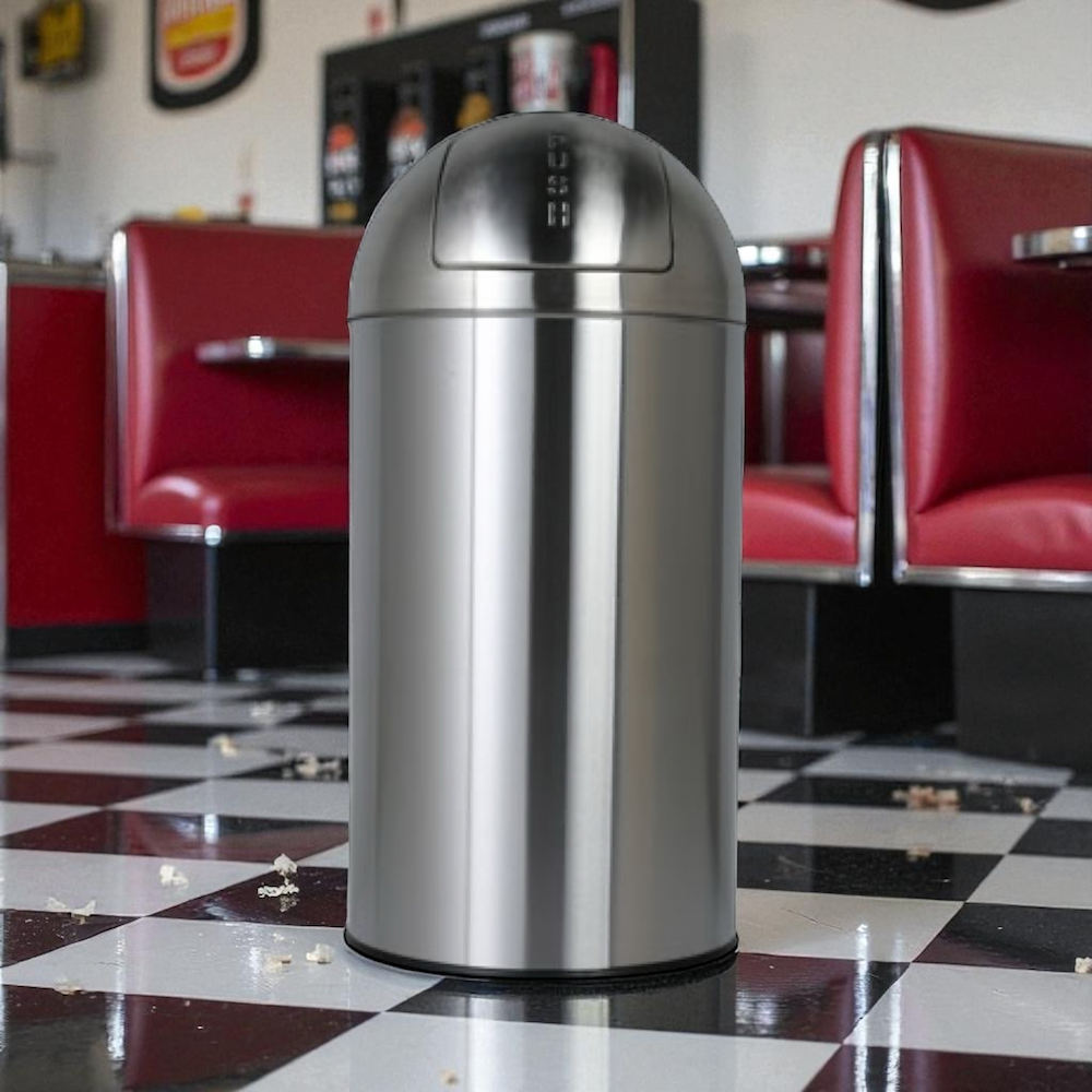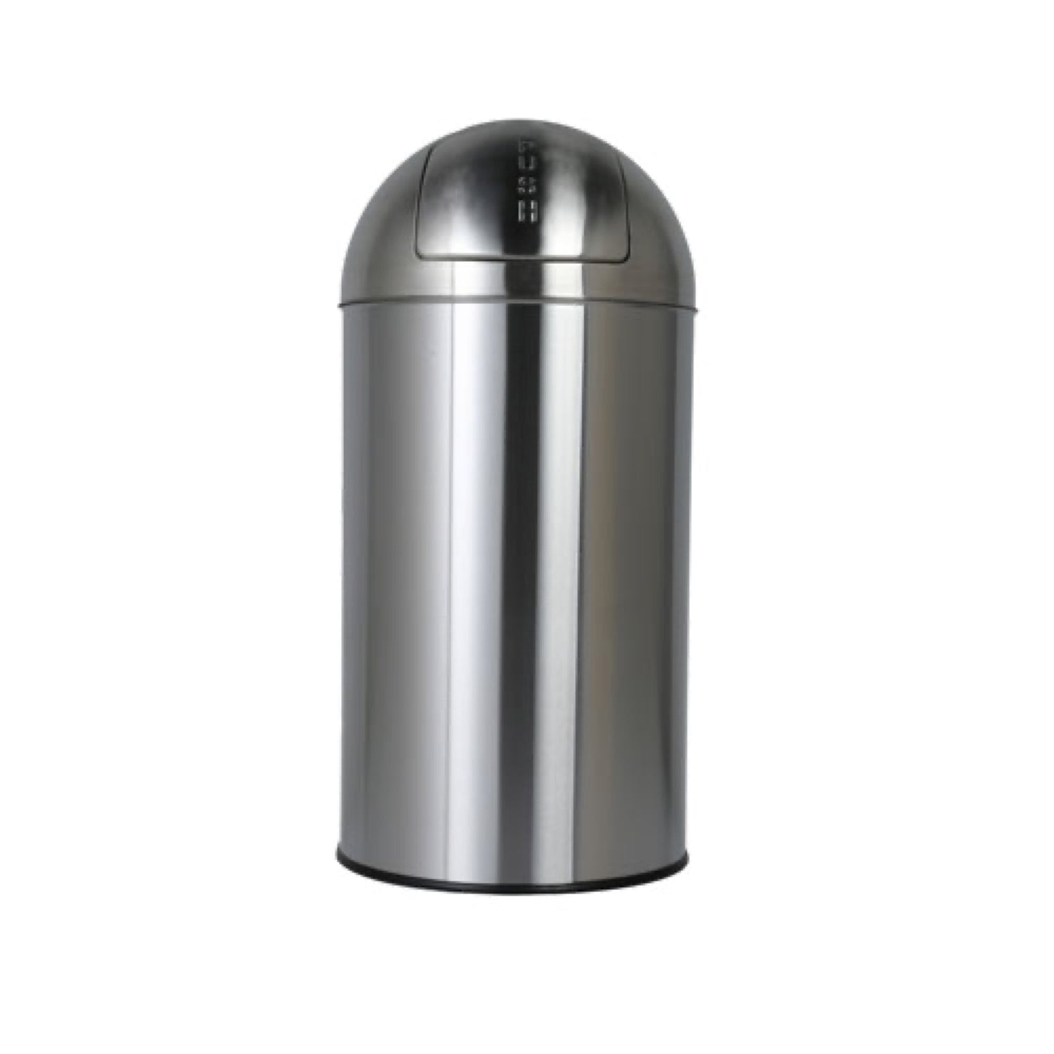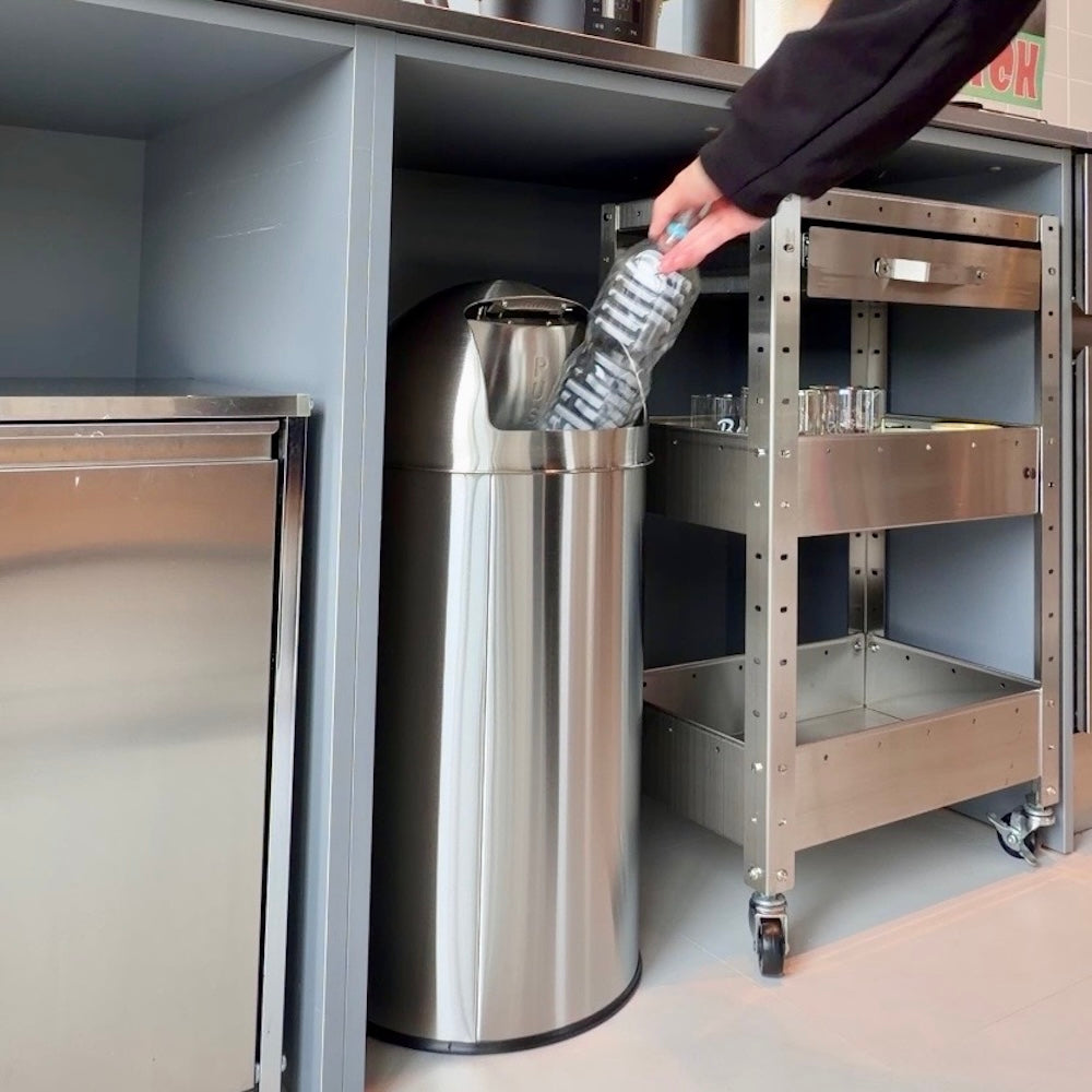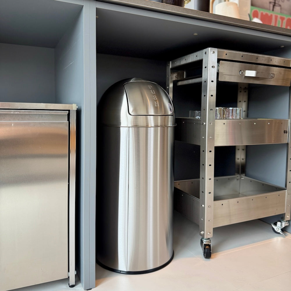 スッキリとしたシェイプがクールな、プッシュトップタイプのゴミ箱。中身が見えないので、気兼ねなくガシガシ捨てられるタフさと、ステンレスならではの清潔感が嬉しい。使いやすいインナーバケツも◎。