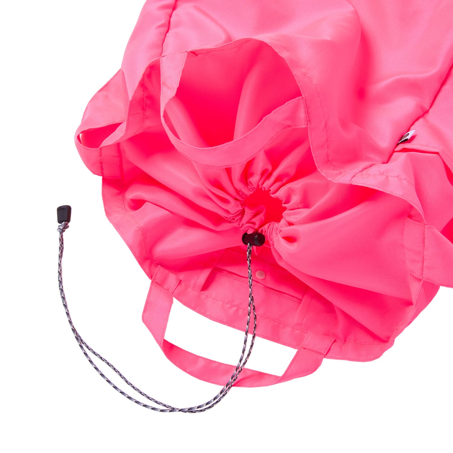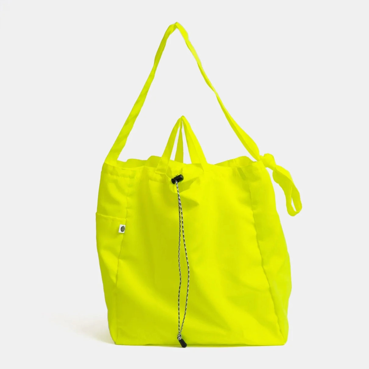 デイリーでも使いやすい、大きすぎず小さすぎずなバランスの、とても軽い3wayバッグです。手持ち、肩がけしてトートバッグとして、斜めがけしてショルダーバッグとしてお使いいただけます。外側のサイドに1つ、内側に2つポケットがあります。バッグの口は、巾着のようになっており、コードストッパーでさっと開け閉めできるようになっています。実はそこには隙間があるので小さい荷物は取り出すこともできます。小さく畳んで内側のポケット部分に収納できるので、 デイリー使いだけでなく、荷物が増える日のサブバッグや、ショッピングバッグとしてもお使いいただけます。ポケッタブルサイズにまとめる際は、内装の吊りポケットを裏返し、その中に本体を収納してください。