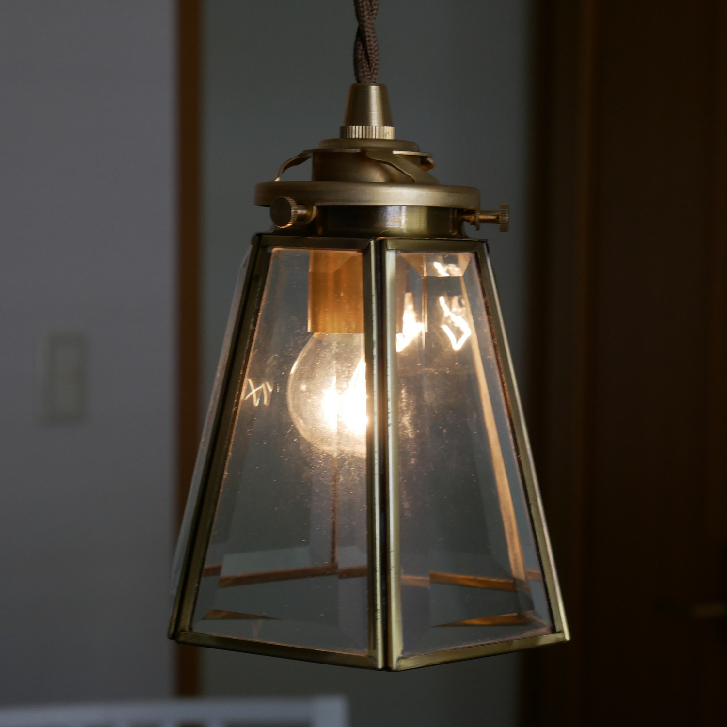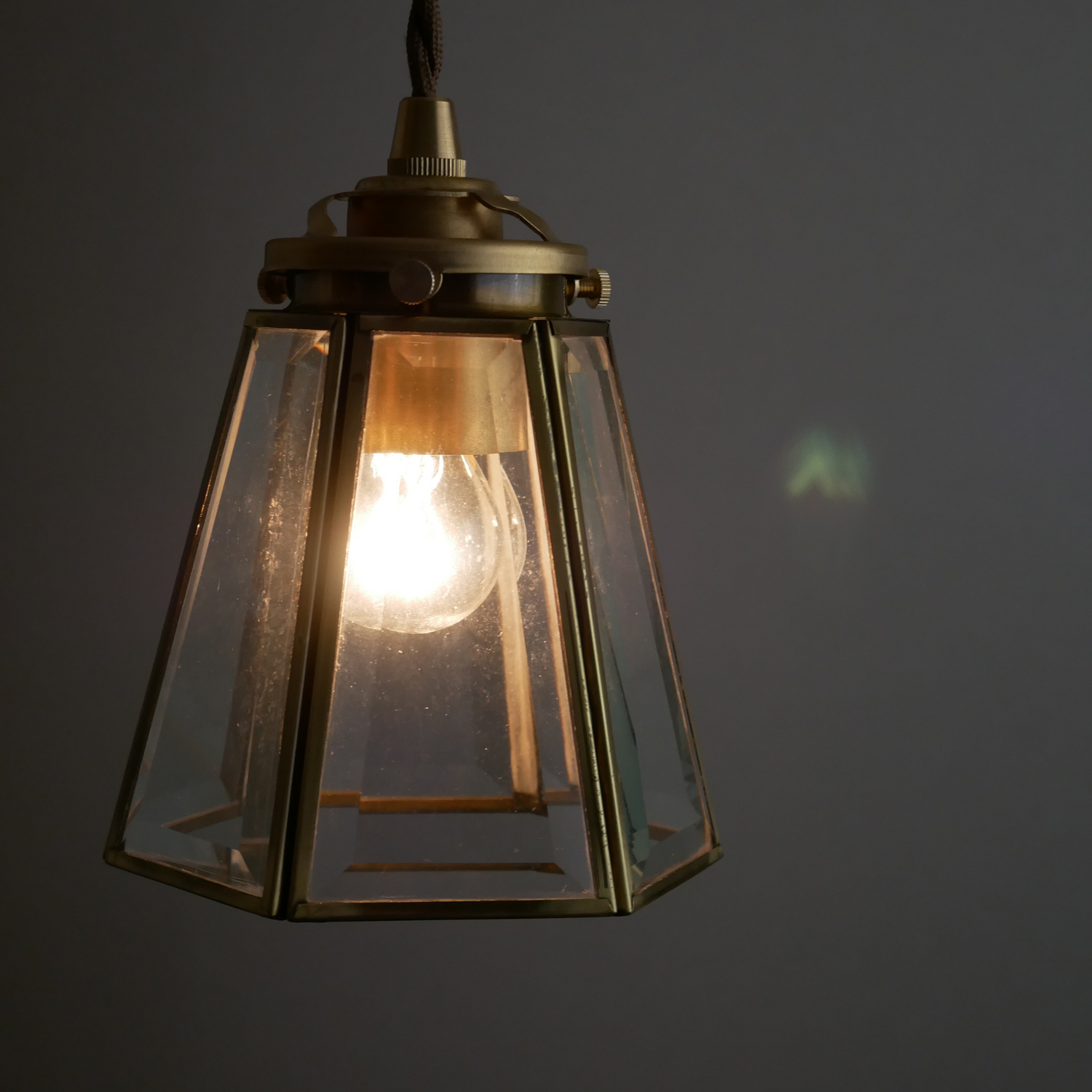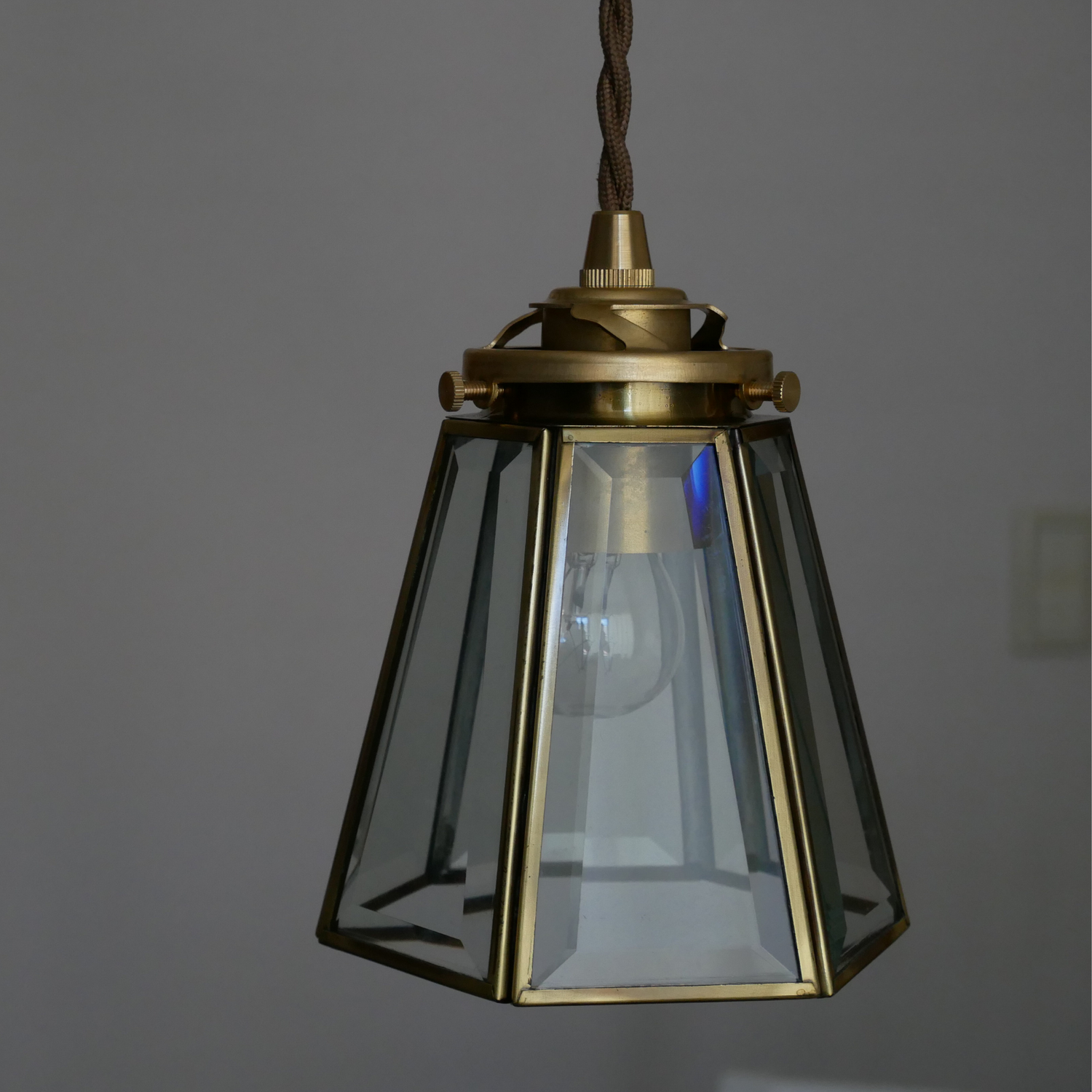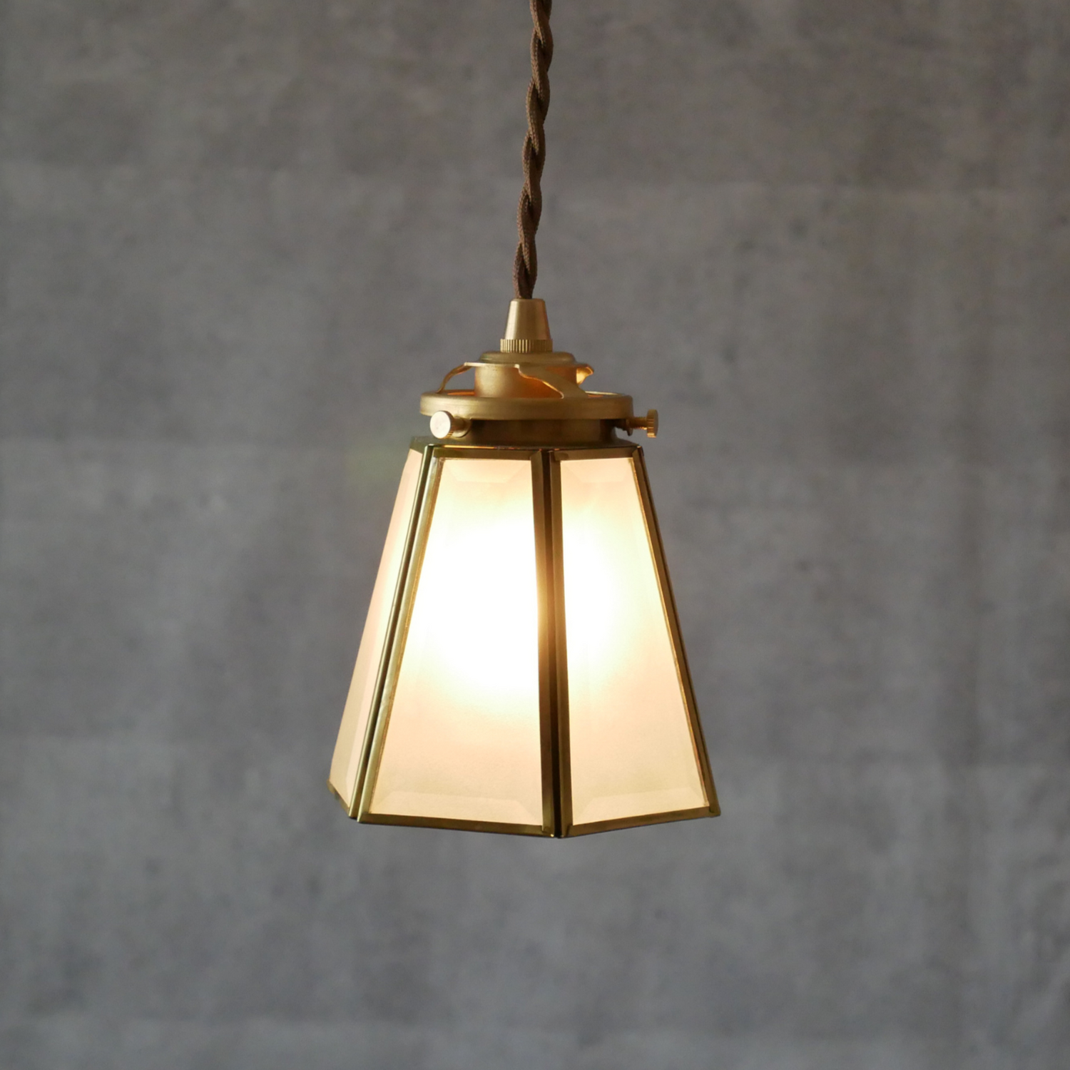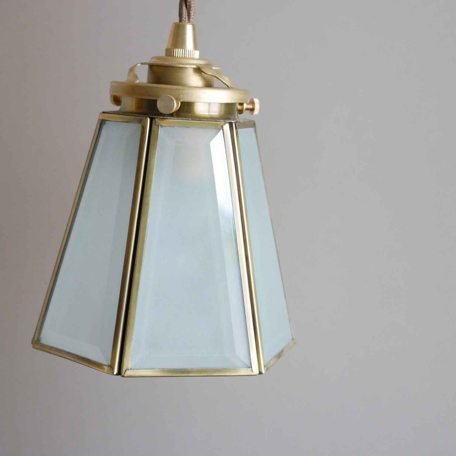 クリスタルガラスとフロストガラスを真鍮の灯具で組み合わせたペンダントライト。真鍮は時間経過と共に味わいのある色に変化します。イメージは12世紀の西ヨーロッパ。真鍮で作られたガラスの枠と暖かな光、きらびやかなクリスタルガラスをお楽しみください。天井電源があれば工事不要で取り付け可能です。