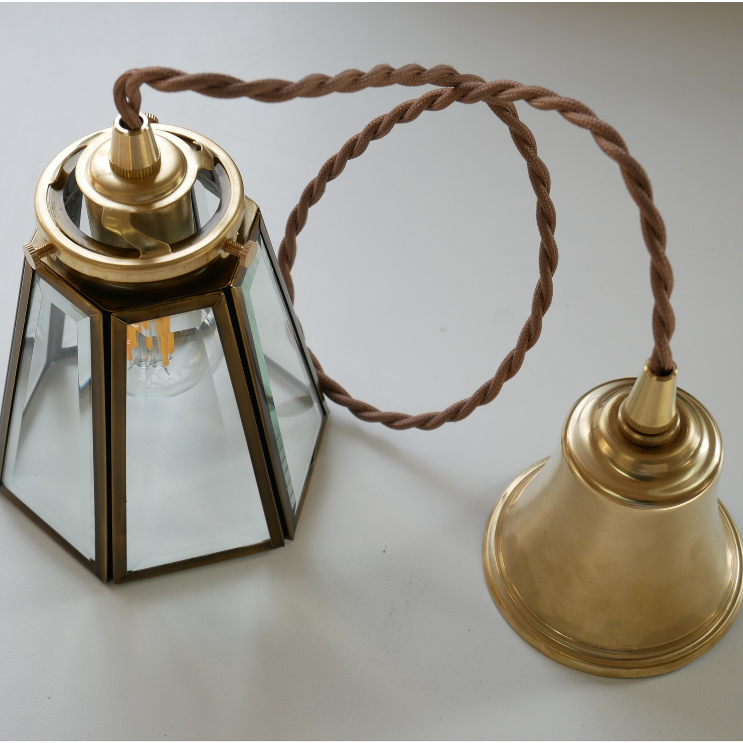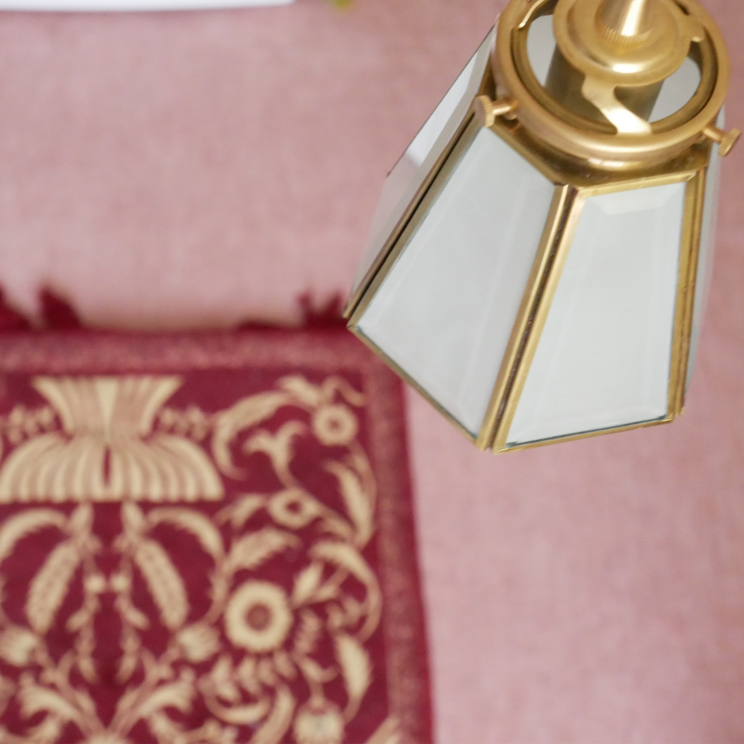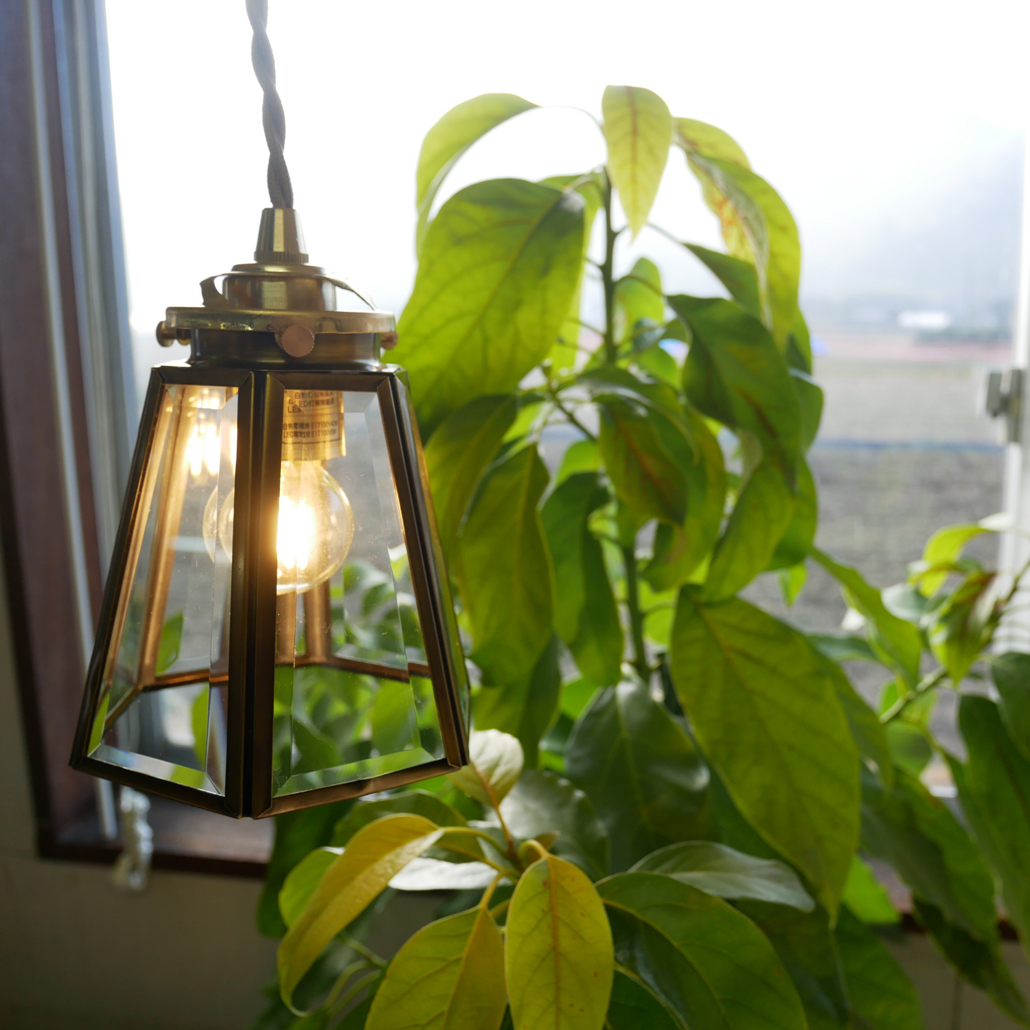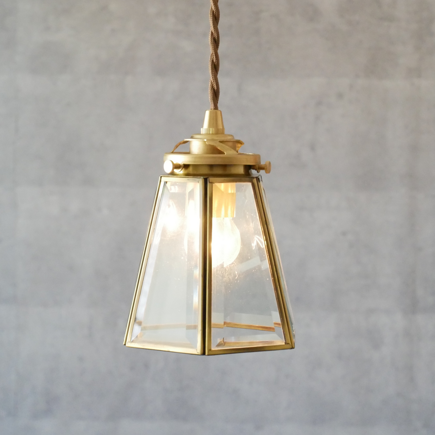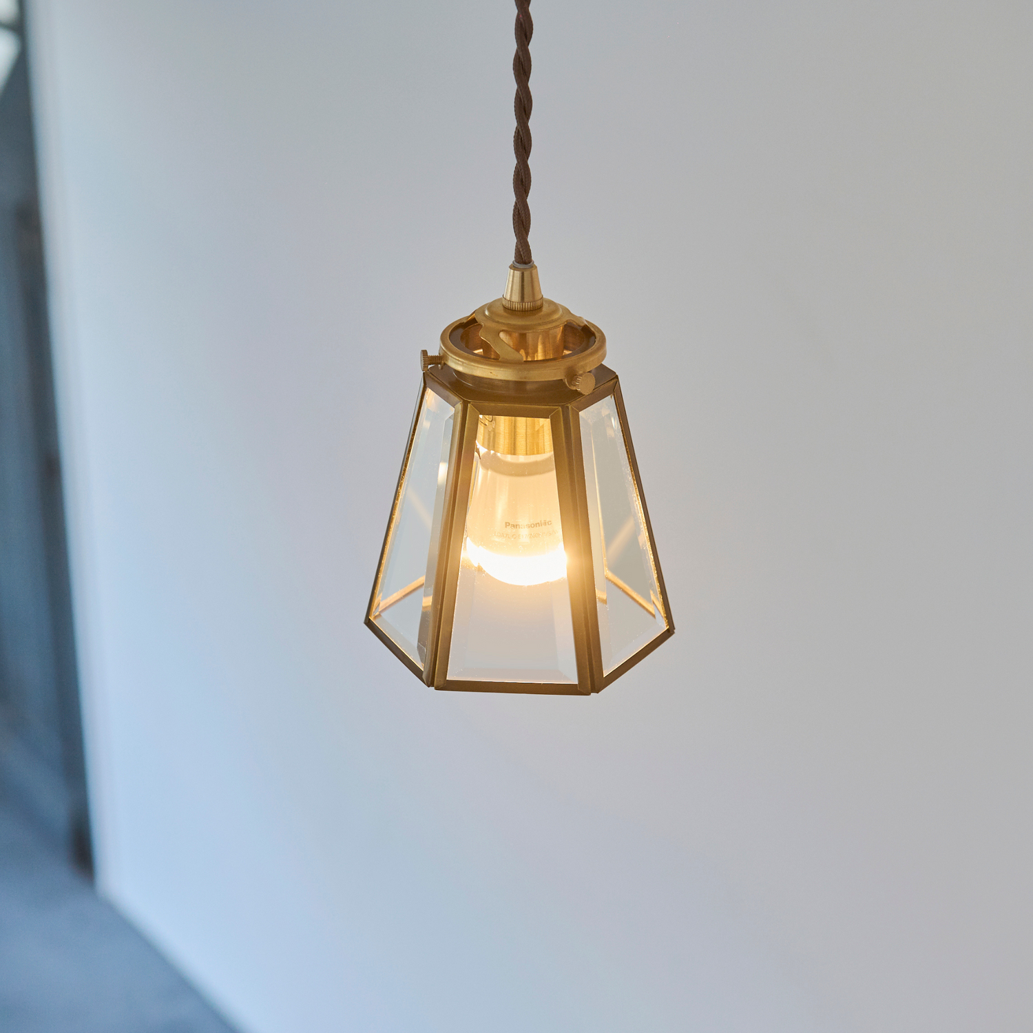 クリスタルガラスとフロストガラスを真鍮の灯具で組み合わせたペンダントライト。真鍮は時間経過と共に味わいのある色に変化します。イメージは12世紀の西ヨーロッパ。真鍮で作られたガラスの枠と暖かな光、きらびやかなクリスタルガラスをお楽しみください。天井電源があれば工事不要で取り付け可能です。